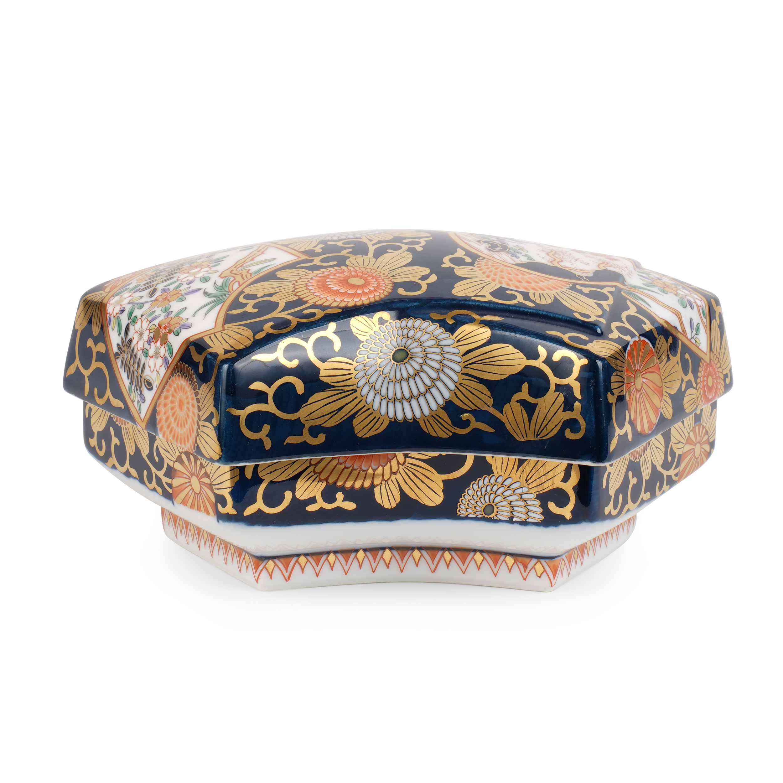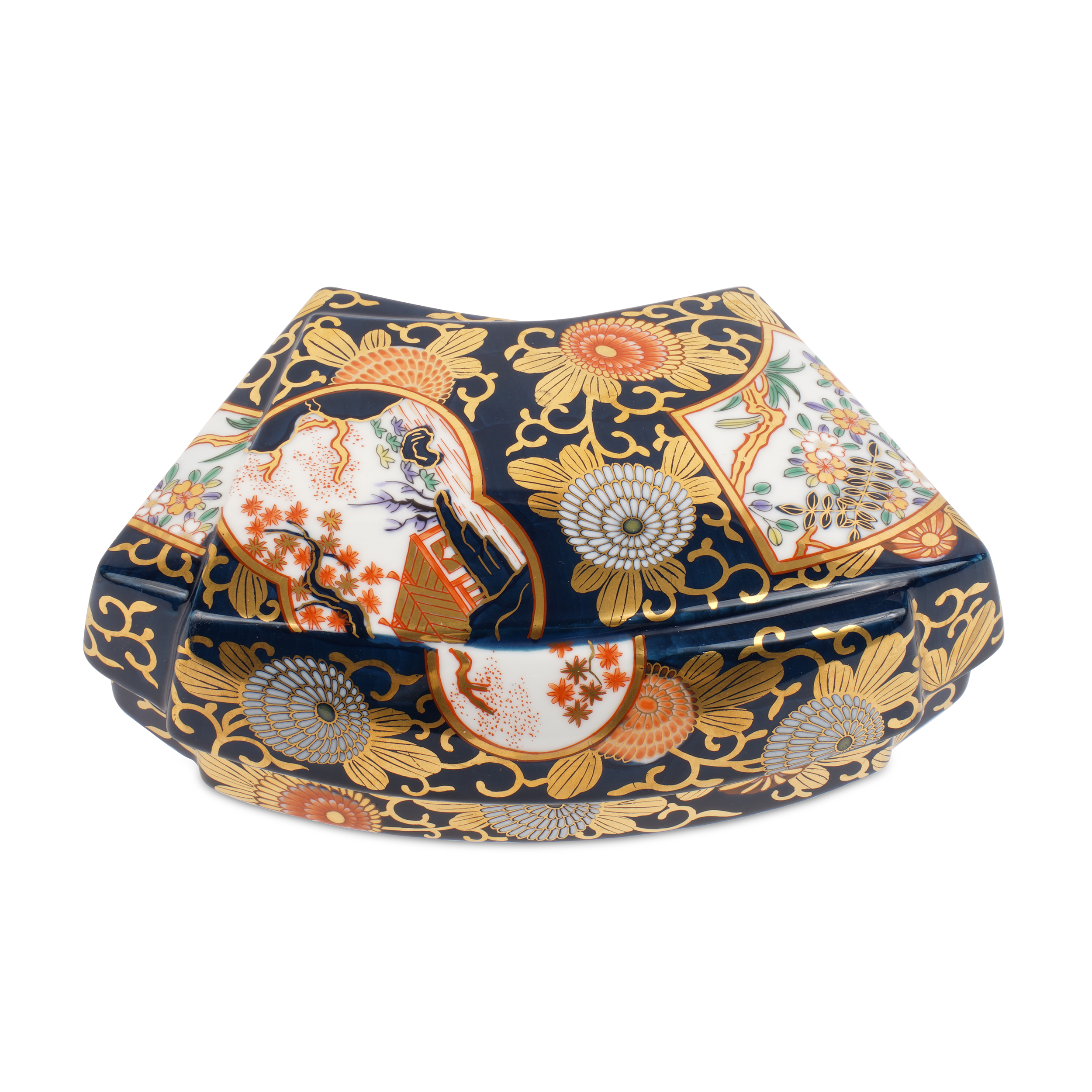 Фарфор, полихромная деколь с подрисовкой, эмаль, золочение, Япония, период Сёва, клеймо мастера на дне, клеймо в тесте, 1950-е гг., высота – 9 см, ширина – 19 см.