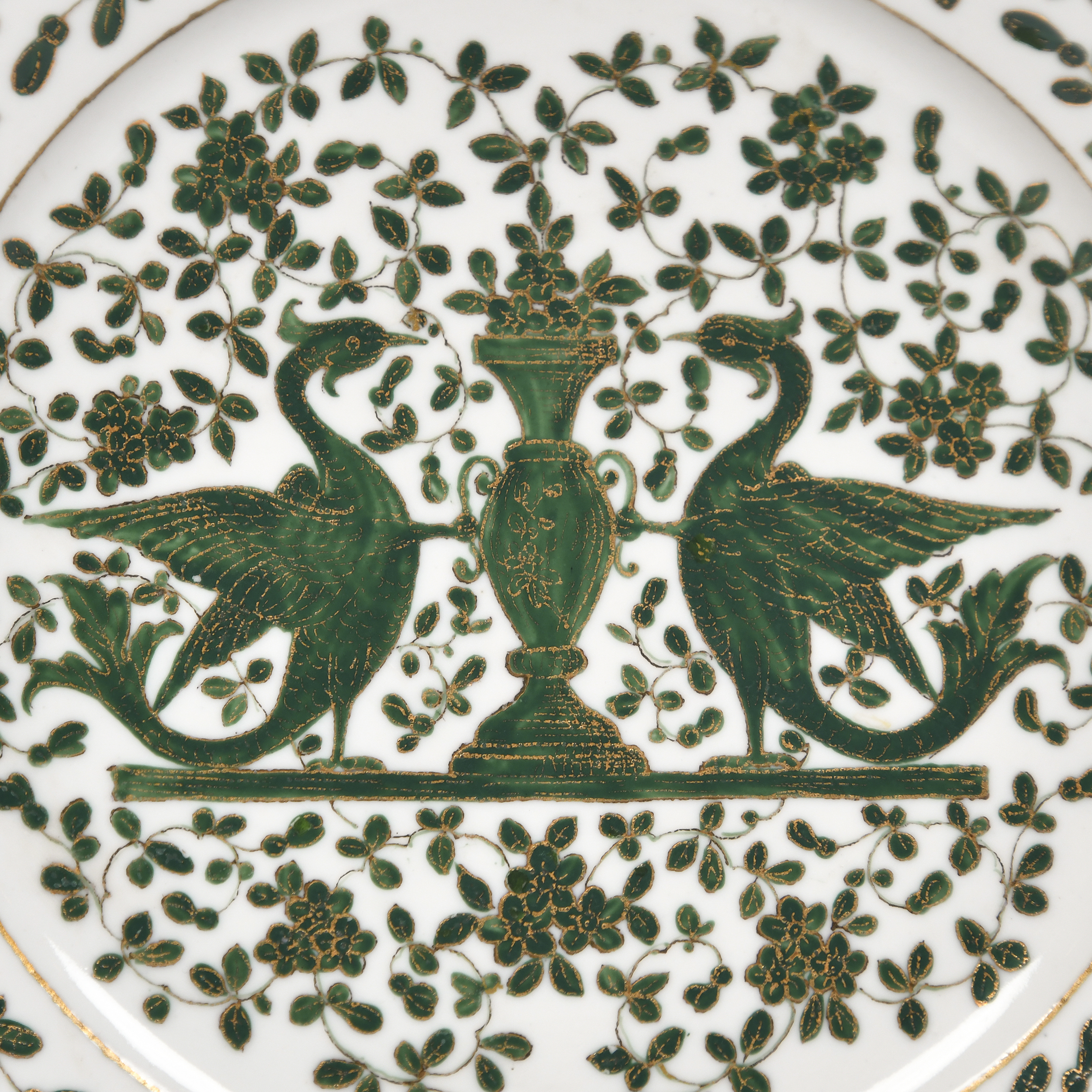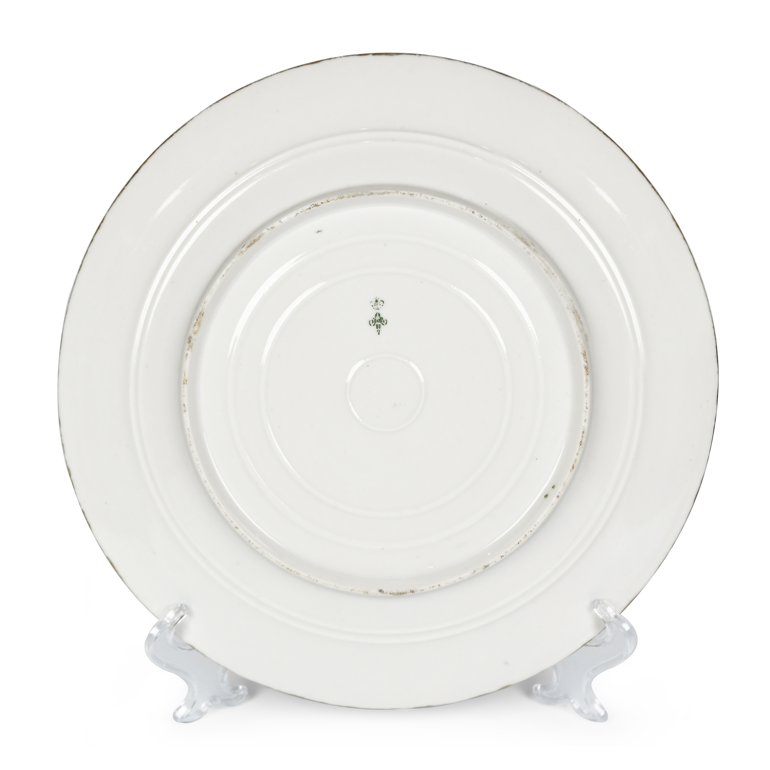 Фарфор, надглазурная роспись, золочение; марка зелёная подглазурная «АII» под императорской короной с цифрой «7»; Россия, диаметр – 24,2 см.