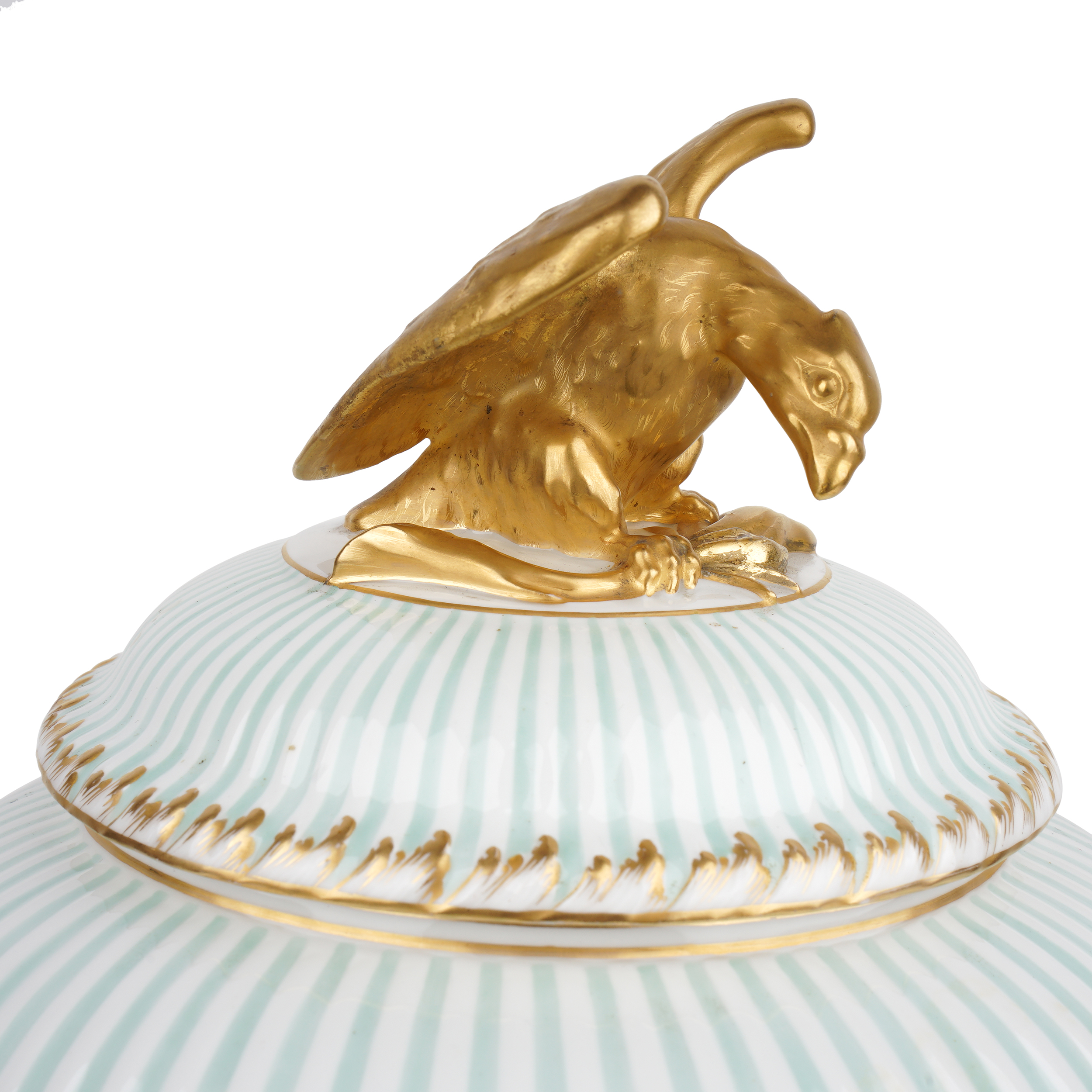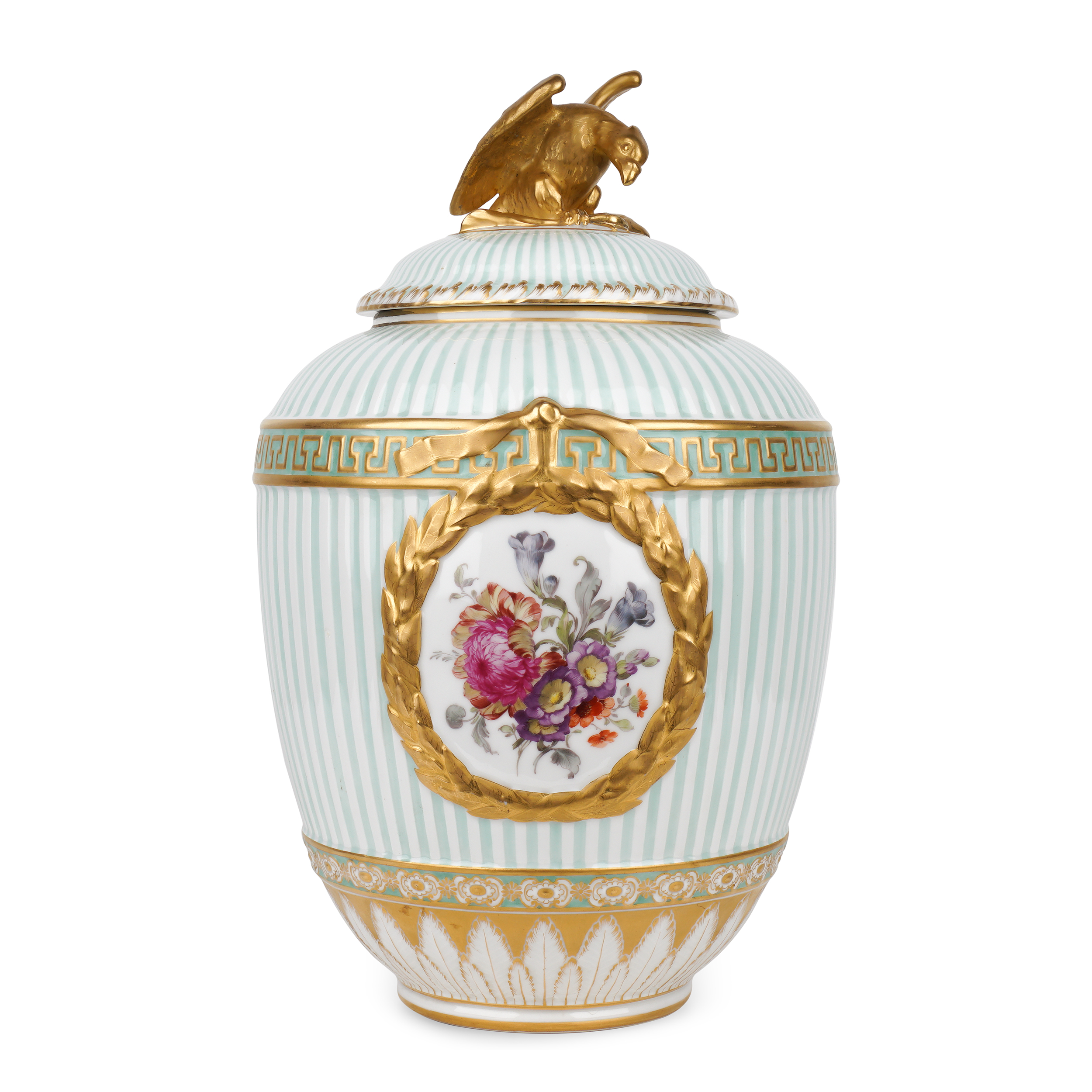 Ваза с цветочными букетами в медальонах и фигурой орла на крышке. Выполнена по модели 1779 года скульптора Фридриха Элиаса Мейера Старшего (1723-1785), мастера-модельера Королевской фарфоровой мануфактуры в Берлине. Фарфор, лепка, рельеф, надглазурная полихромная роспись, золочение, цировка, синее подглазурное клеймо в виде скипетра, красное надглазурное печатное в виде державы с «KPM», «F», «3» в тесте, метка художника по росписи золотом, Королевская Берлинская фарфоровая мануфактура (KPM), Германия, конец XIX - начало XX века, высота - 31 см, диаметр тулова – 22,5 см