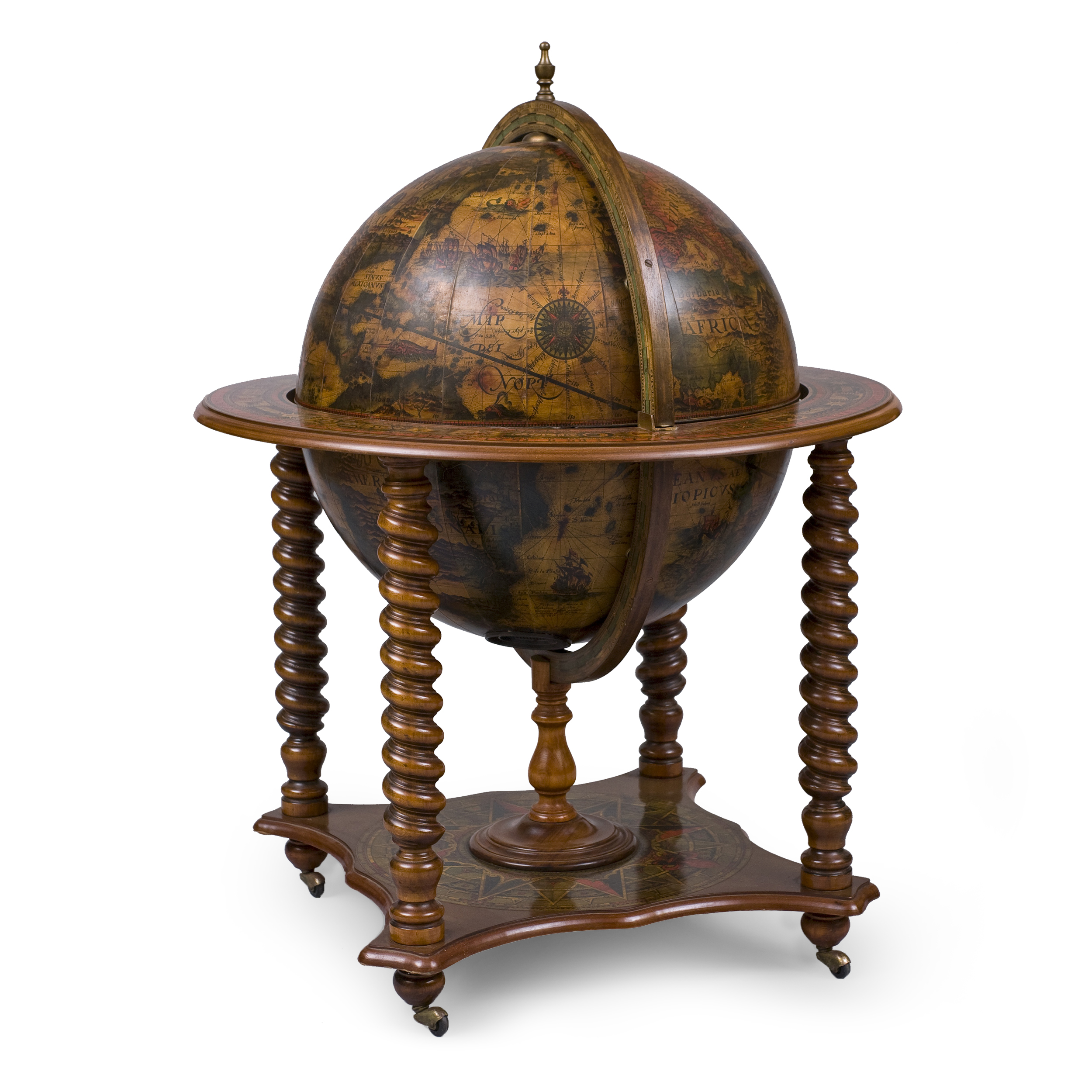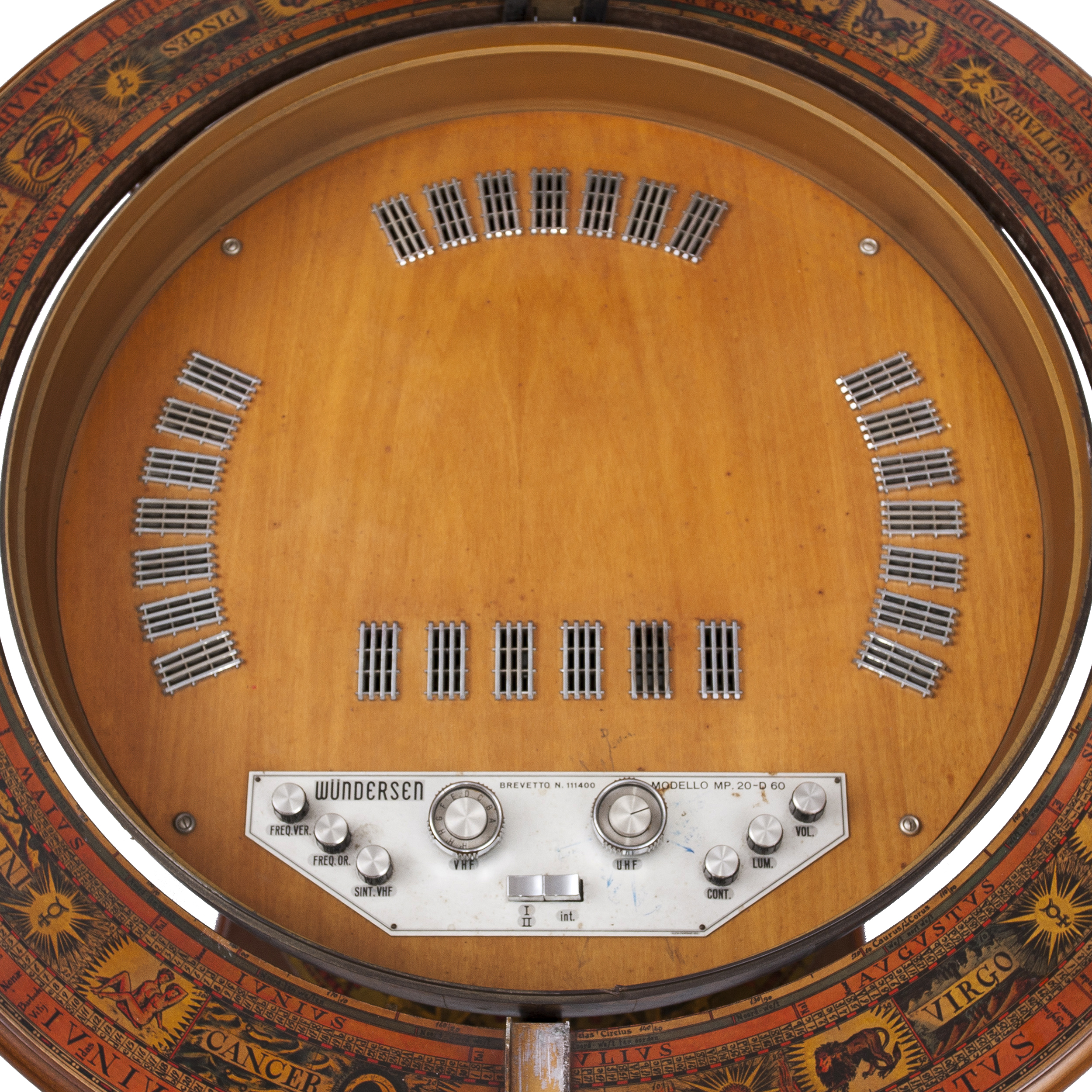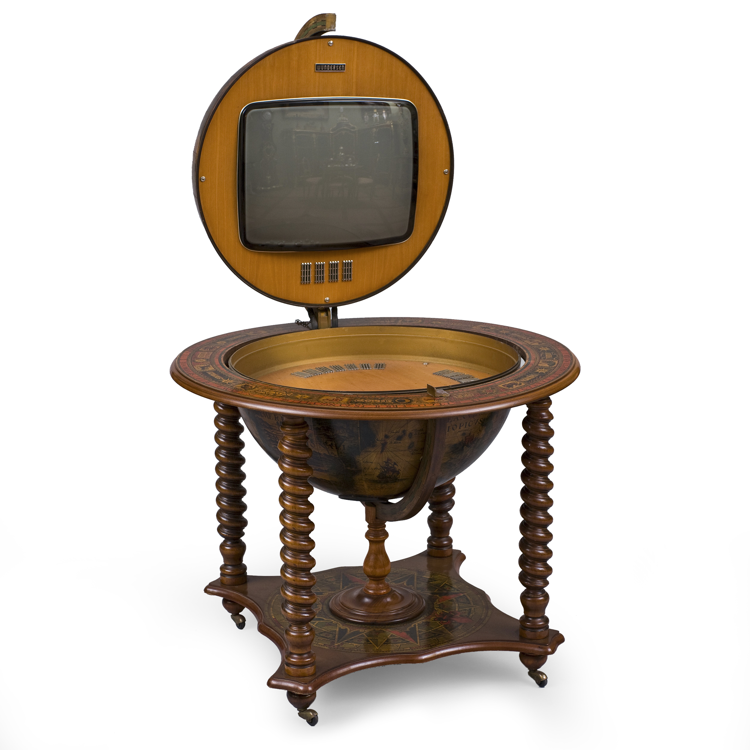 Дерево, декупаж, металл, встроенный в корпус телевизор фирмы Wundersen, Италия, 1950-1960-е годы, высота - 120 см, диаметр - 85 см, экран - 42 х 35 см