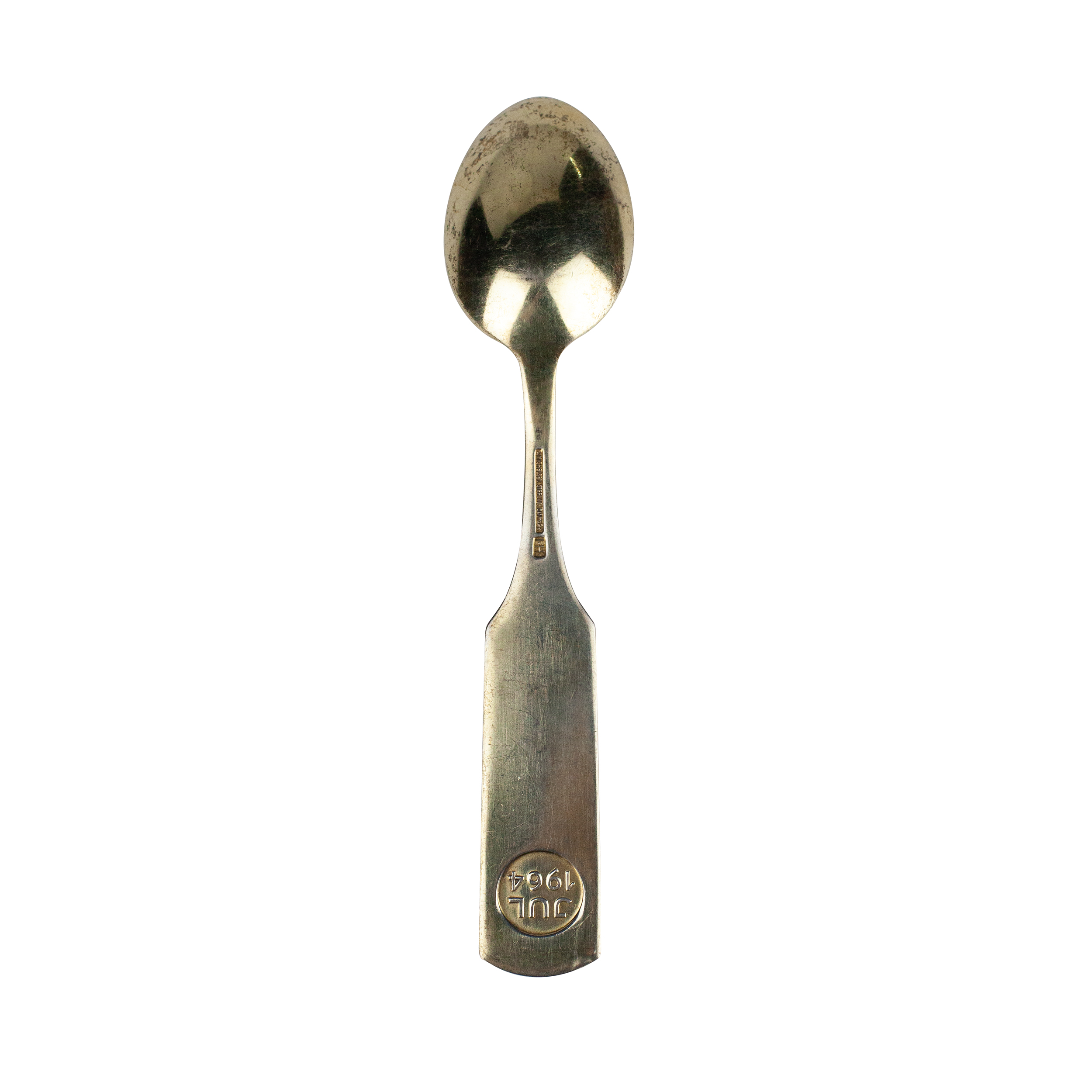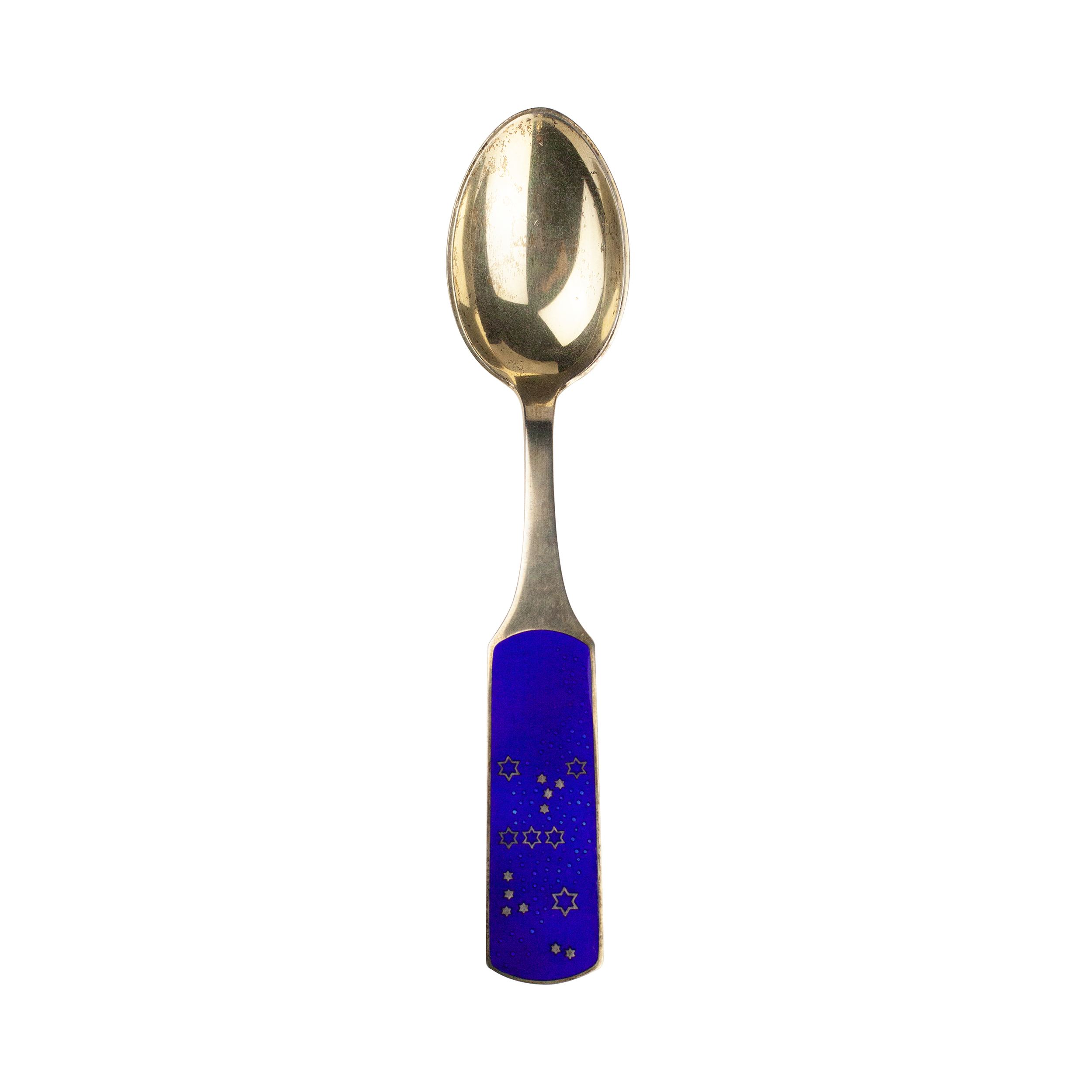 Серебро 925 пробы (с клеймом переопробации), литье, полихромная эмаль, золочение, клеймо «A. Michelsen Sterling Denmark» в прямоугольном щитке, монограмма «IH» художницы-эмальера Ингер Ханманн (Inger Frimann Hanmann, 1918 - 2007), на черенке надпись «Jul 1964», мастерская Антона Михельсена, поставщика Датского королевского двора, Копенгаген. Длина ложки – 16,3 см, вес – 46 грамма.