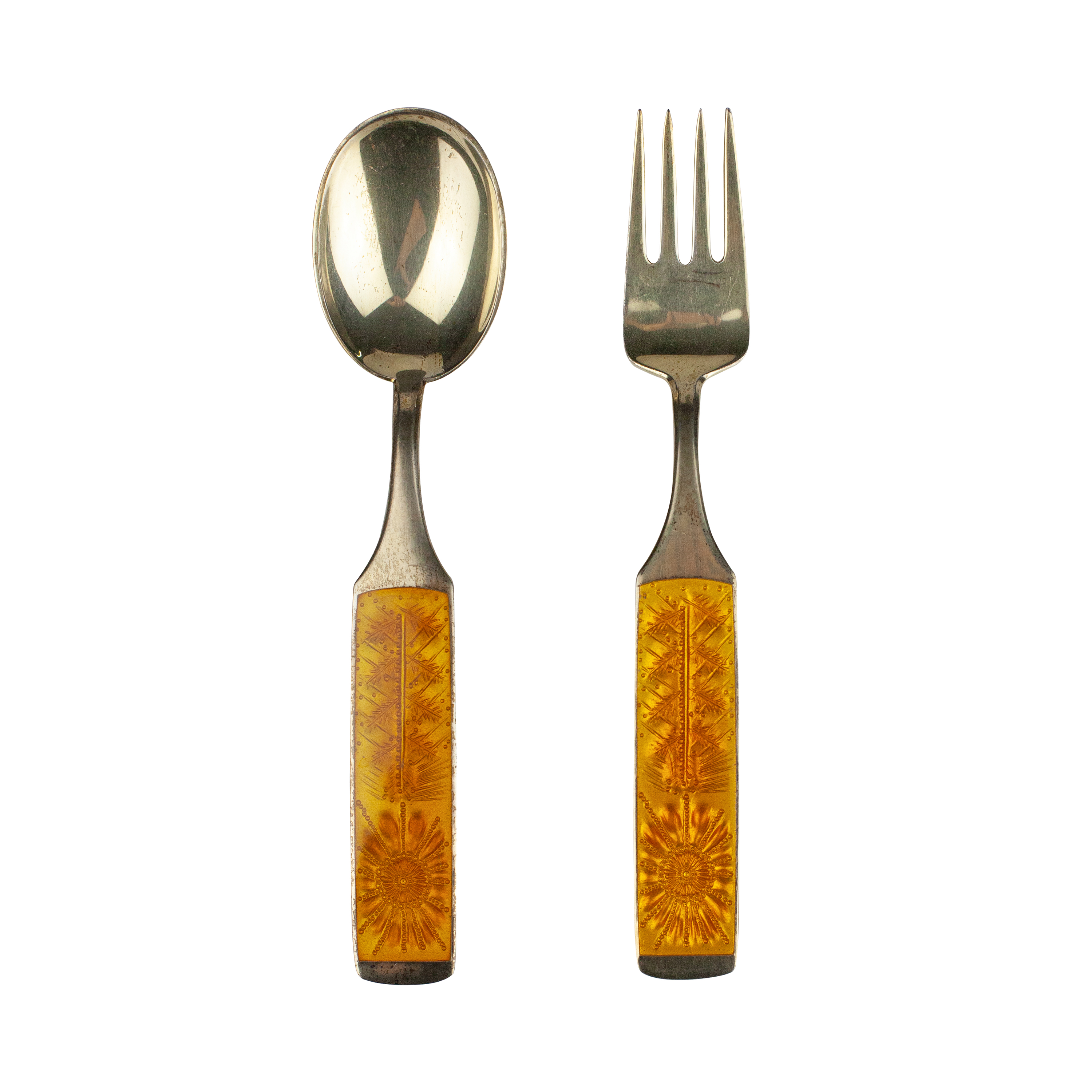 Серебро 925 пробы (с клеймом переопробации), литье, монохромная эмаль, гильоше, золочение, клеймо «A. Michelsen Sterling Danmark» в прямоугольном щитке, на черенке клейма: «Julen 1967», «Paul Rene Gauguin» норвежского живописца, графика, скульптора, книжного иллюстратора и сценографа Поля Рене Гогена (1911 - 1976), мастерская Антона Михельсена, поставщика Датского королевского двора, Копенгаген. Длина ложки – 16,2 см, вилки – 15,9 см, общий вес – 95 грамма.