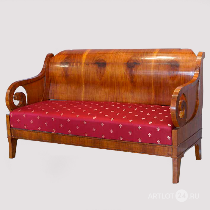 Подлокотники выполнены в форме волют и декорированы элементами в виде листьев аканта. Фанеровка красным деревом, резьба, Россия, первая треть XIX века, размер (в/ш/г): 104 х 180 х 85 см