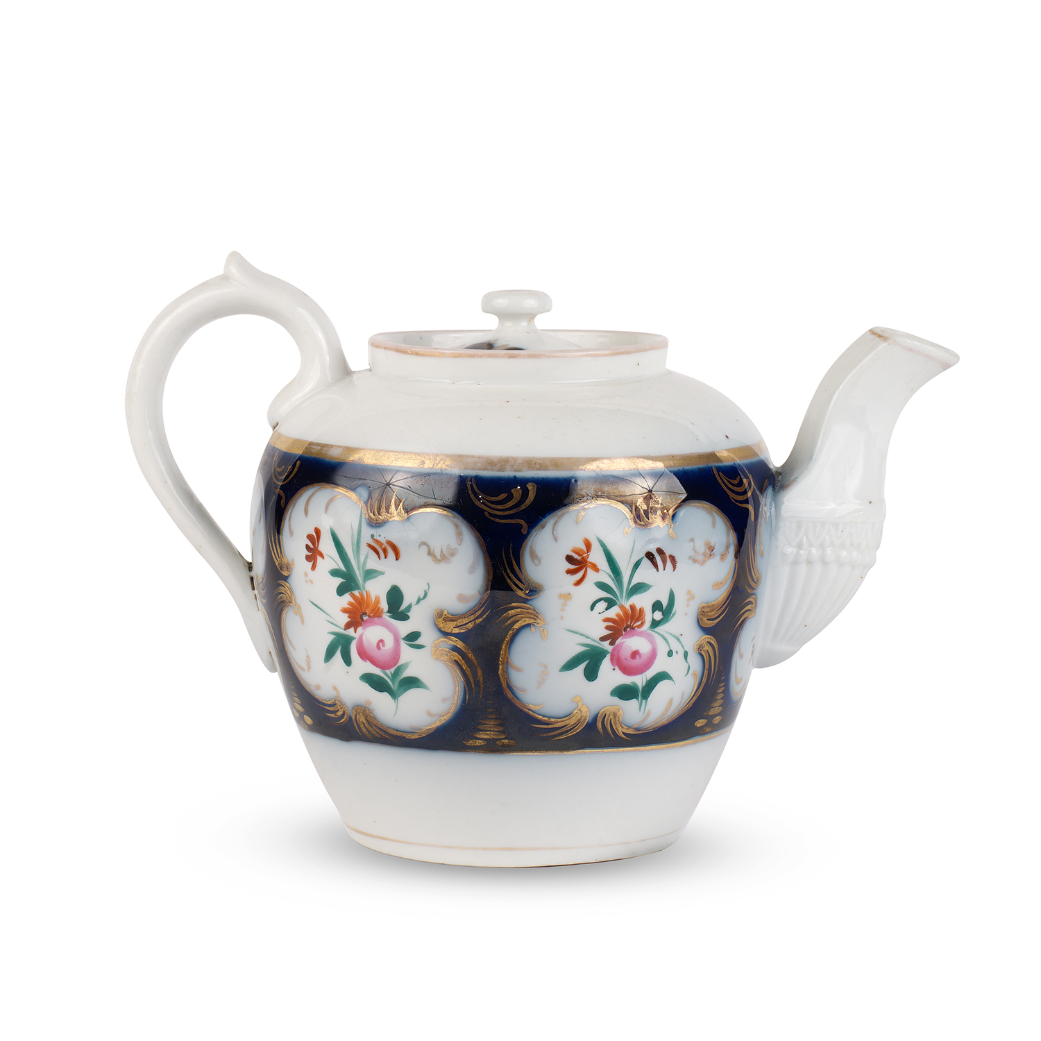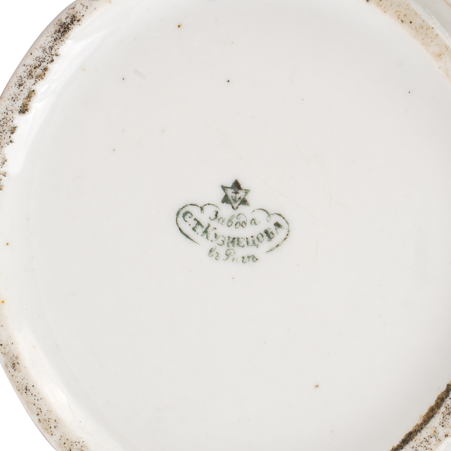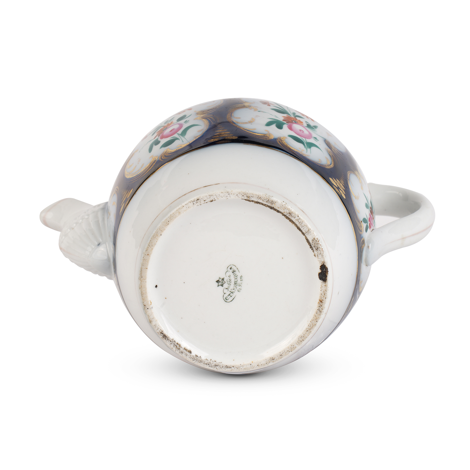 Фарфор, крытье кобальтом, полихромная роспись, золочение, синяя печатная подглазурная марка "Завод С.Т. Кузнецова въ Риге", Российская империя, завод Сидора Терентьевича Кузнецова в Риге. 1853—1963 гг. Размеры: высота – 9,5 см., по носику и ручке – 18 см