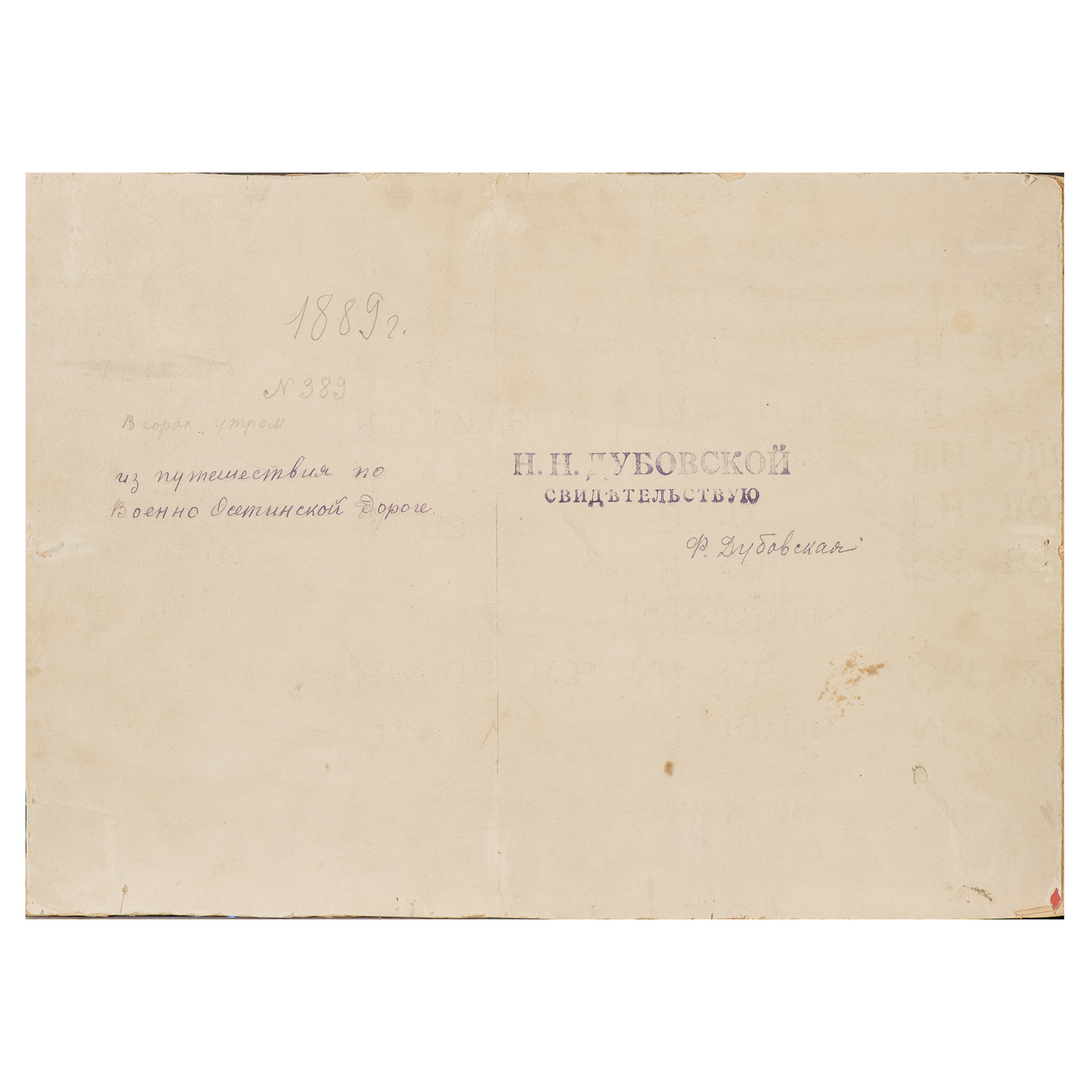 Бумага на картоне, масло, на тыльной стороне дублировочного картона дата «1889 г.», а также печать, подпись Ф. Дубовской – жены художника – и надпись: «В горах утром. Из путешествия по Военно Осетинской дороге», Николай Никанорович Дубовской (1859-1918), Россия, 1889 год, размер (в/ш): 31,5 х 33,5 см, в раме: 55,5 х 66 см. Сопровождается заключением Государственного Русского Музея
