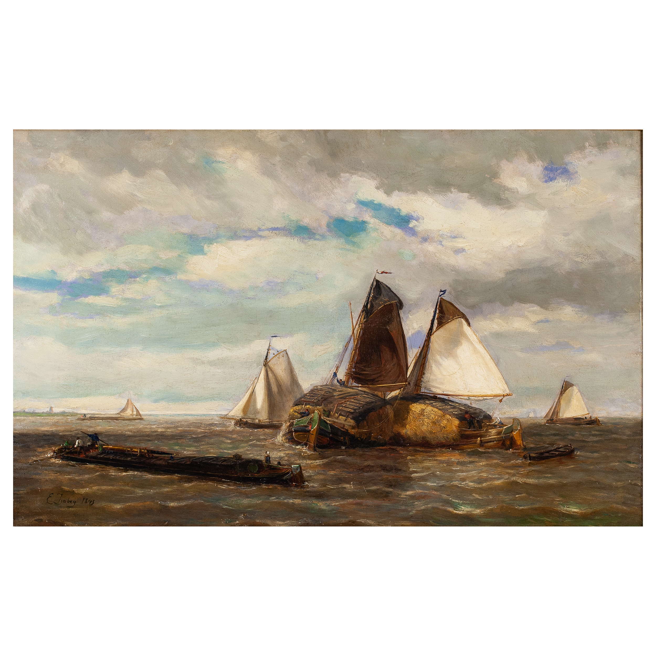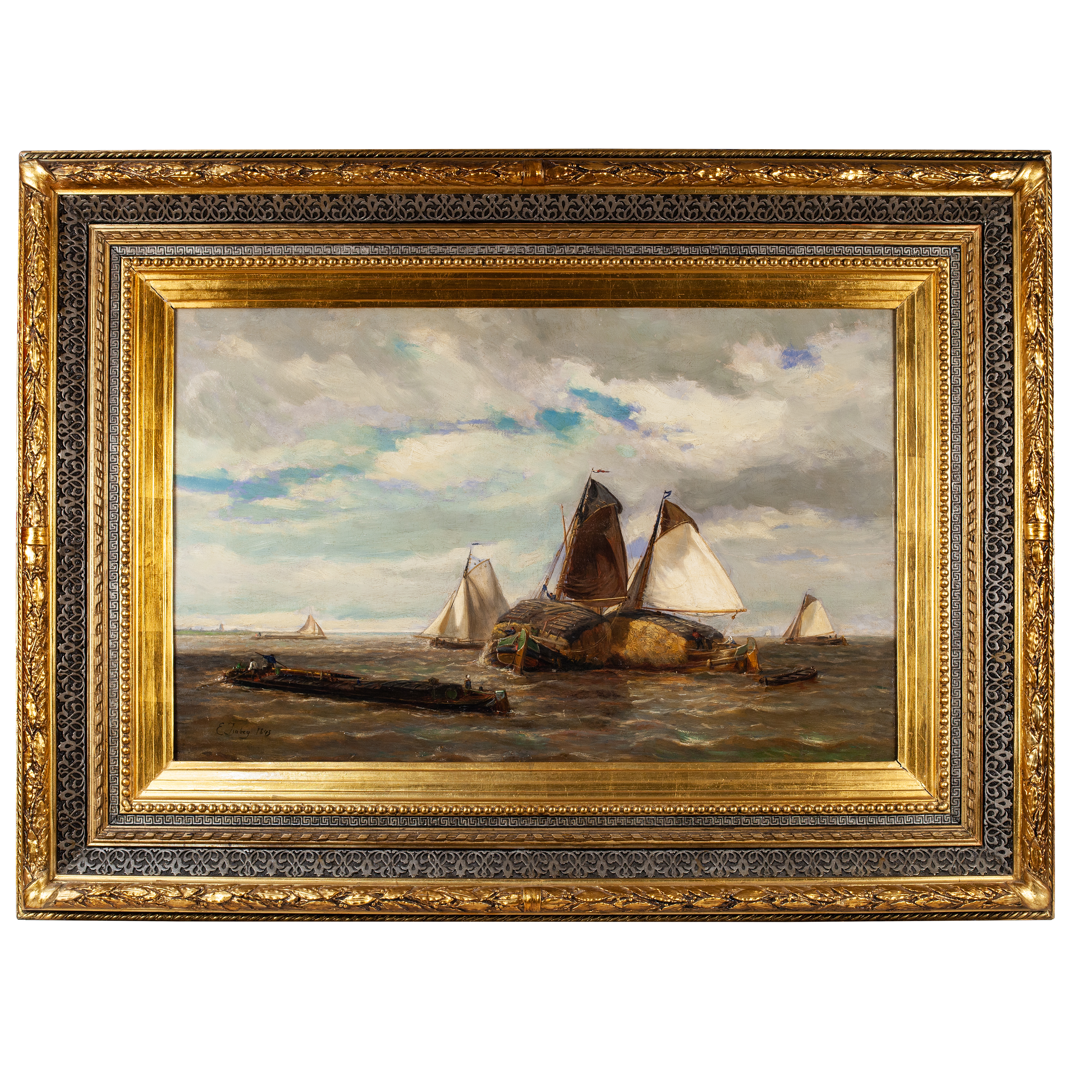 Морской пейзаж изображает столкновение двух барж, перевозящих сено.