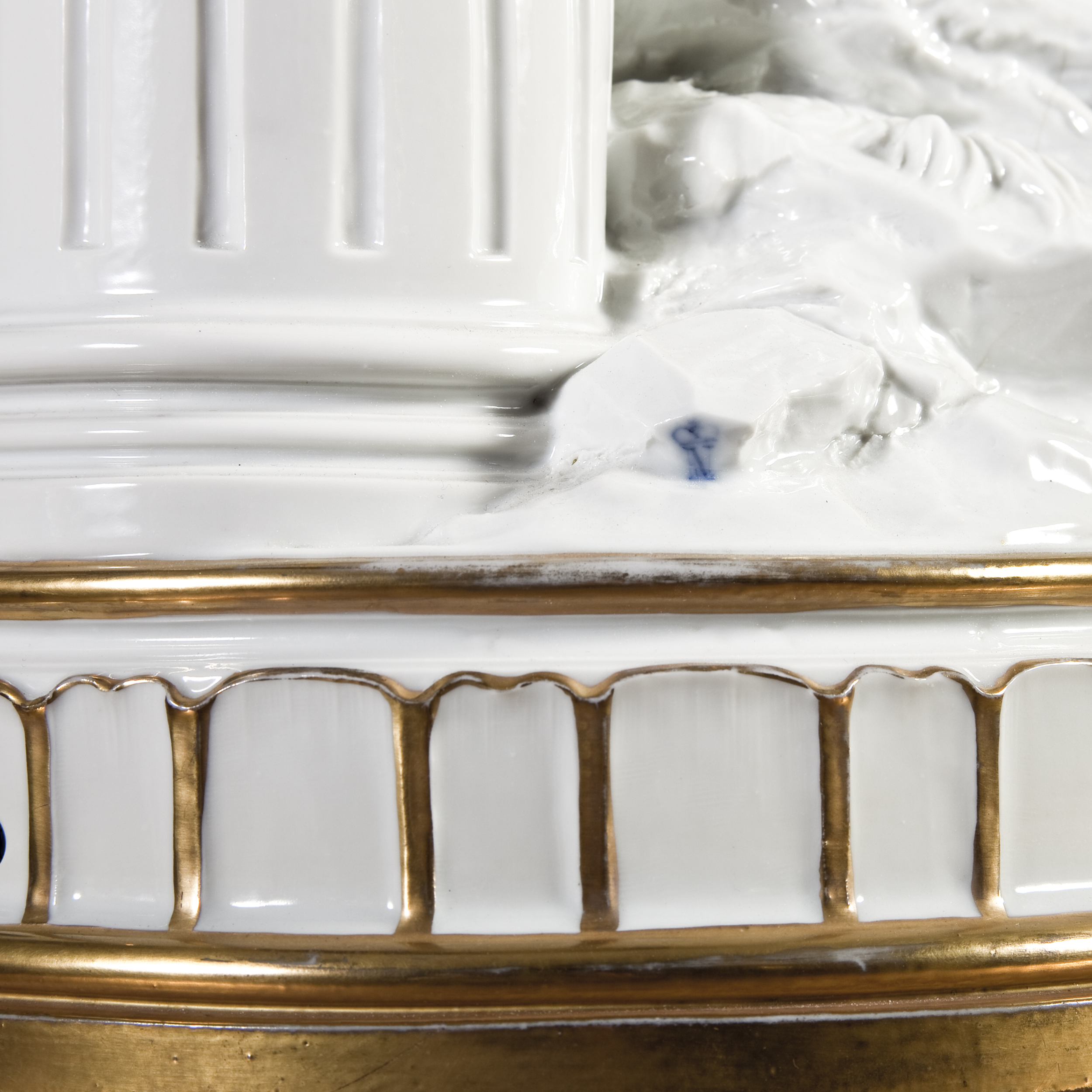 Декоративный фарфоровый светильник. Фарфор, бесцветная глазурь, золочение, марка: синее подглазурное клеймо в виде «N» под короной, «CAPO DI MONTE», Италия, Неаполь, около 1900 года, размеры: высота скульптуры - 90 см, высота основания - 70 см