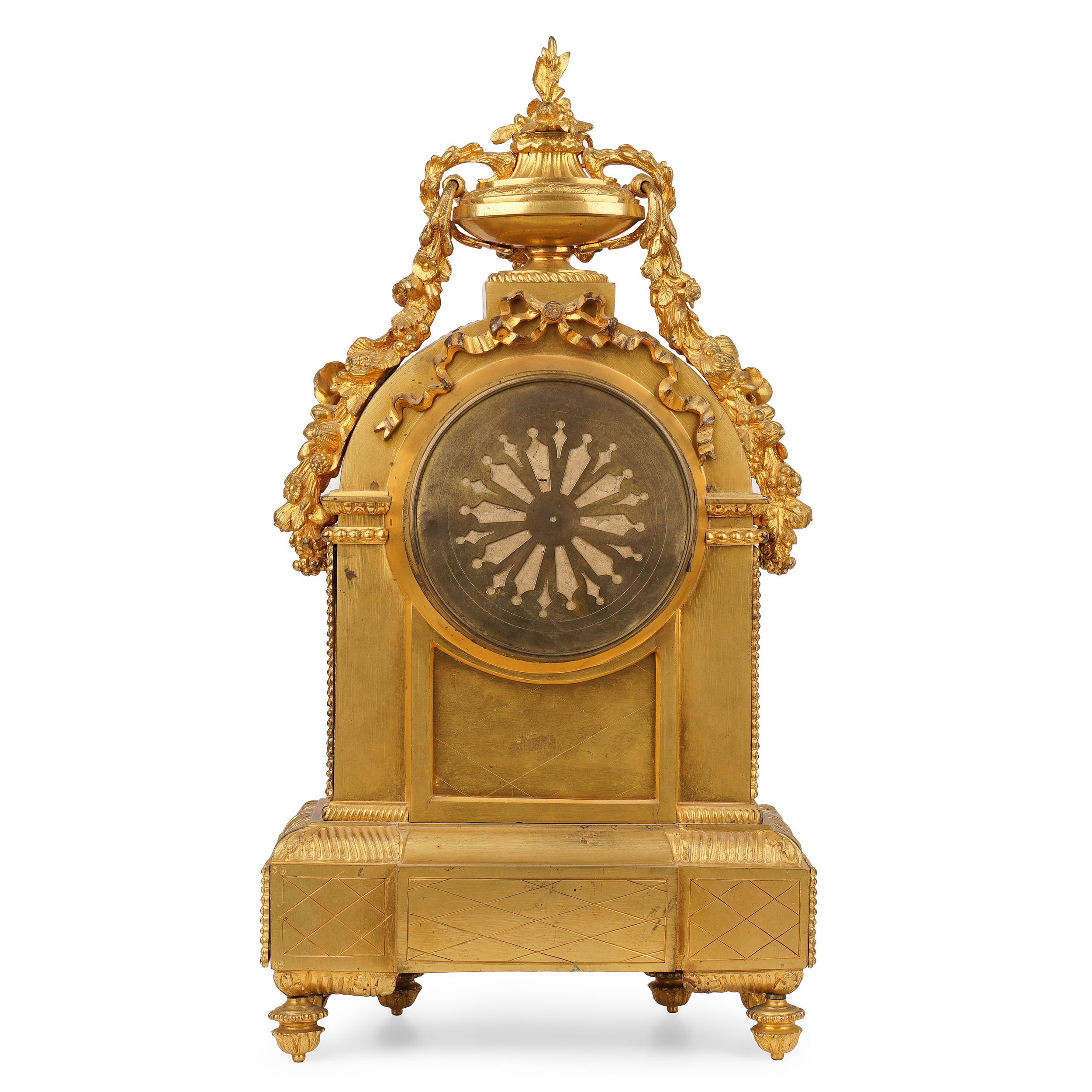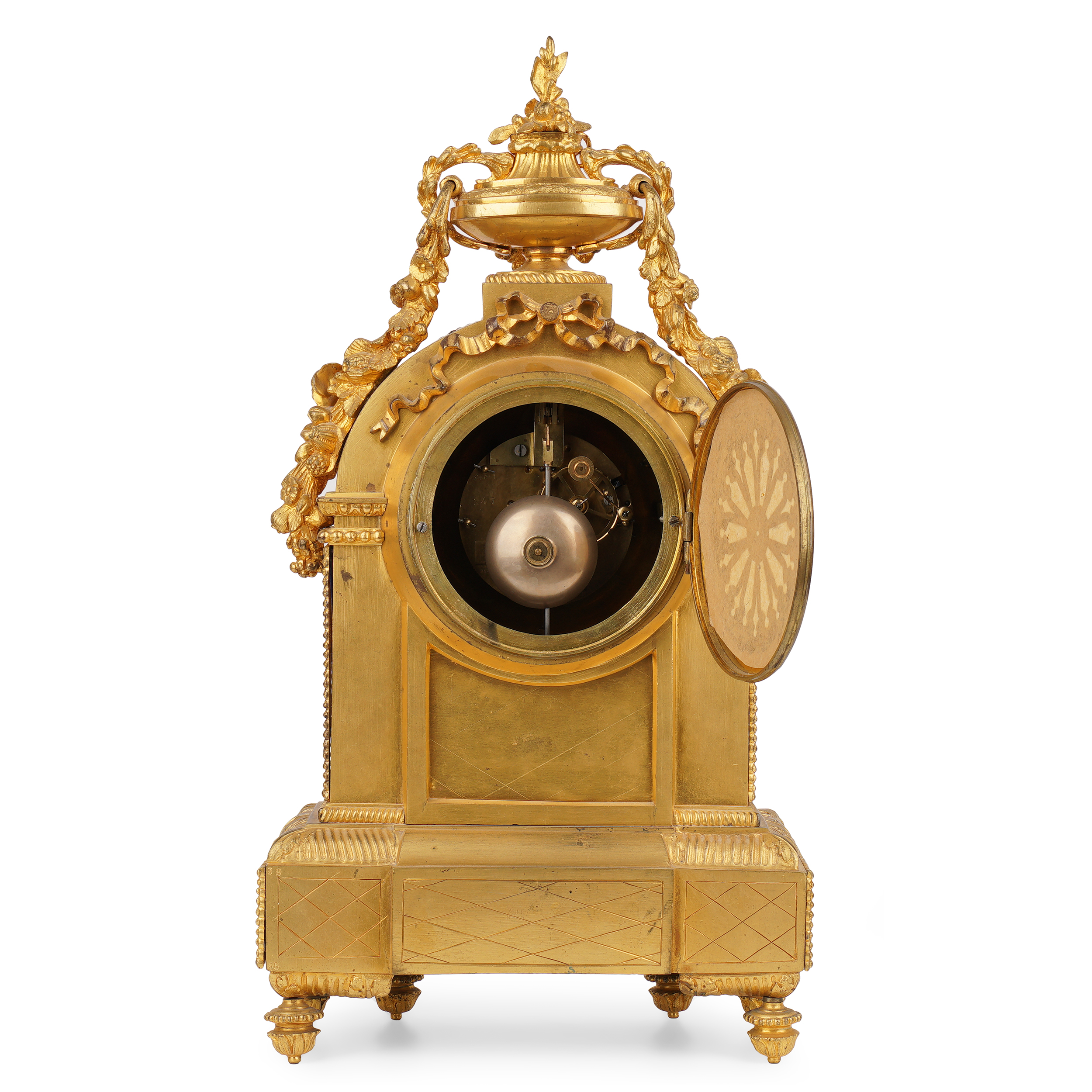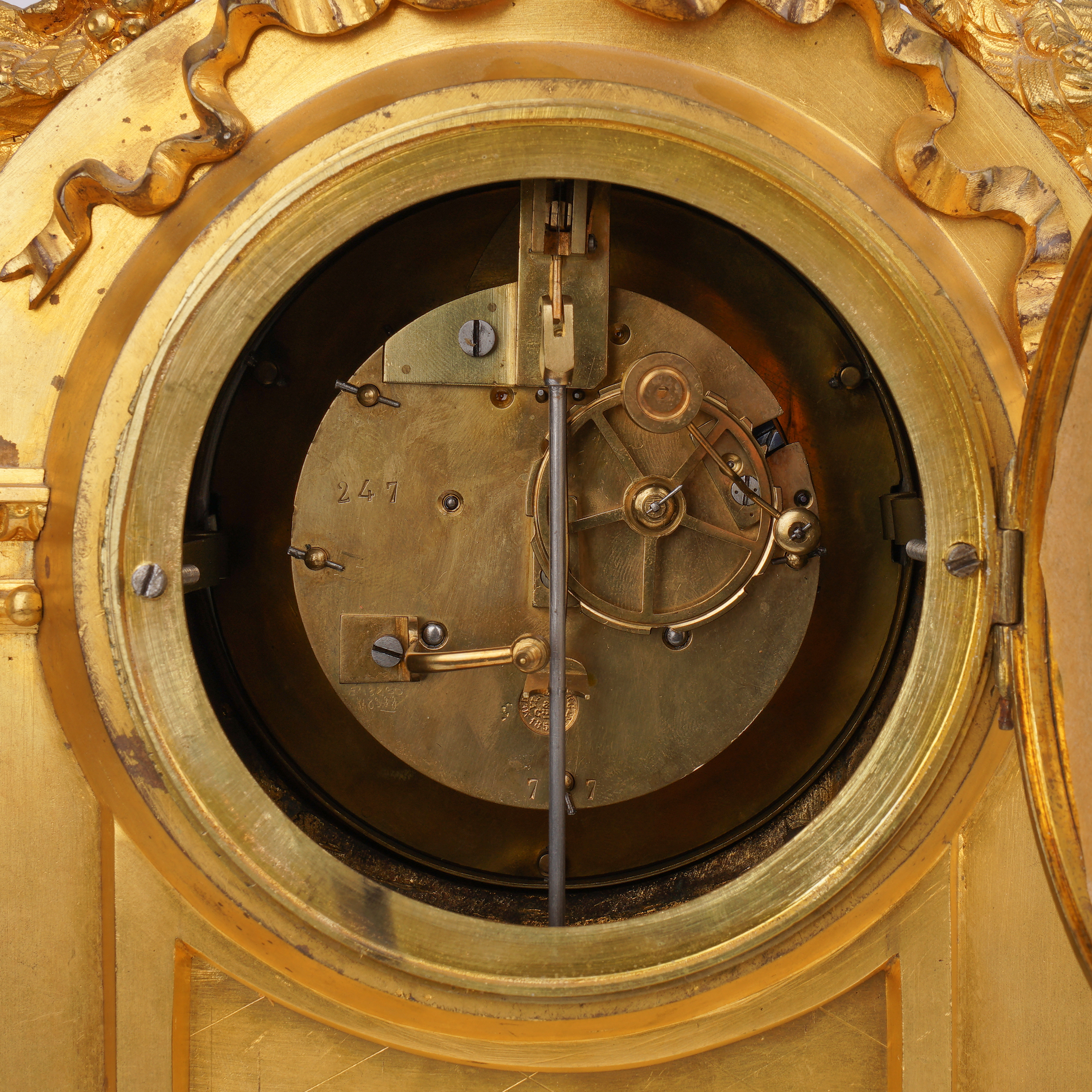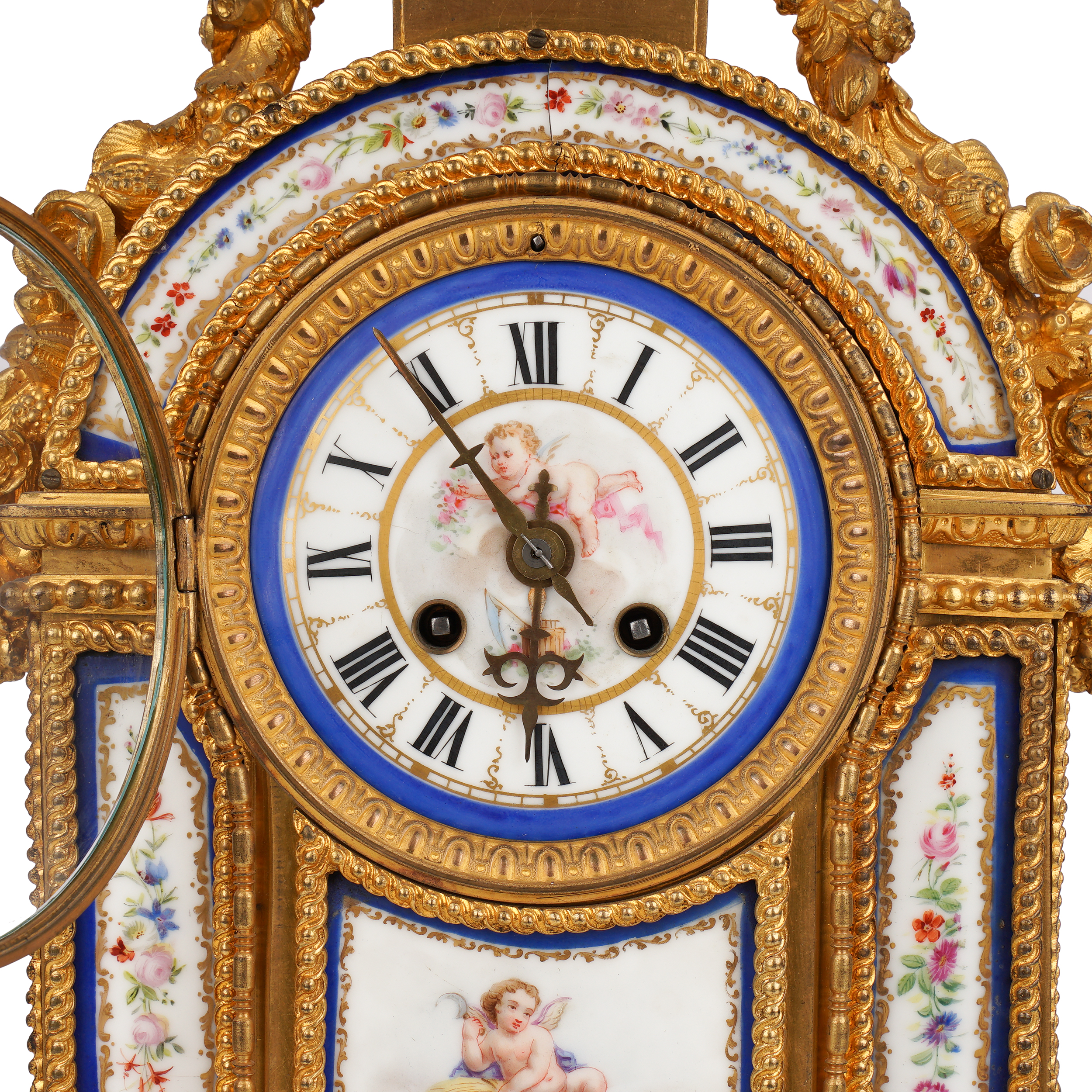 Корпус украшен свисающими по бокам гирляндами дамасских роз и навершием в виде стилизованной вазы. Бронза, литье, золочение, чеканка, фарфор, полихромная роспись, монтировка; эмалевый циферблат с росписью в медальоне, с римскими цифрами часов и делением на минуты, стрелки вороненые, Севрская или Лиможская мануфактура, Франция, 1880-е годы, размер (в/ш/г):