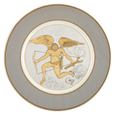 Выполнен в манере фарфоровой мануфактуры Мейсен XVIII века. Ножки декорированы фигурками путти в виде аллегорий времен года, плакетки расписаны на темы пастушеских сцен.