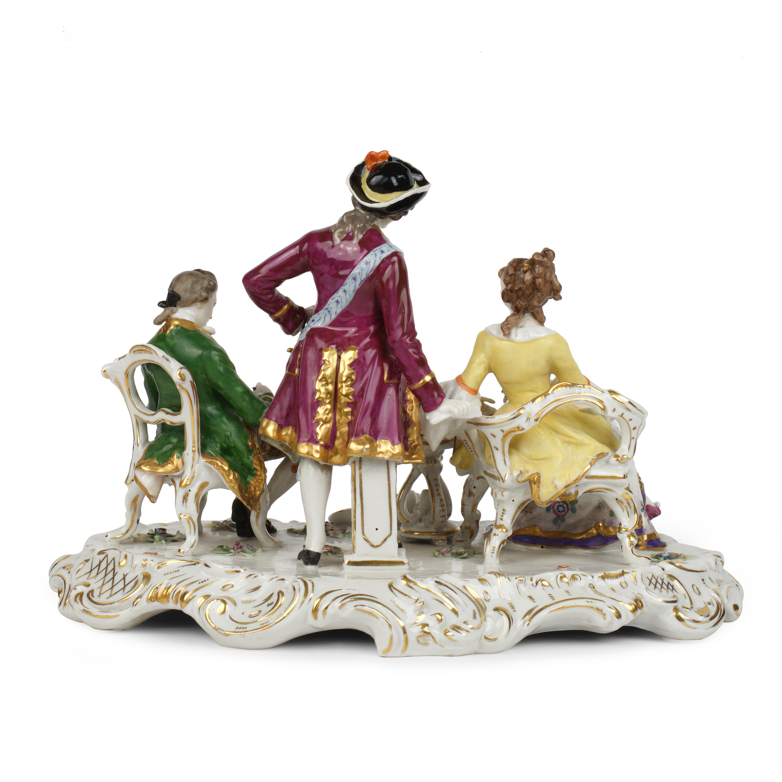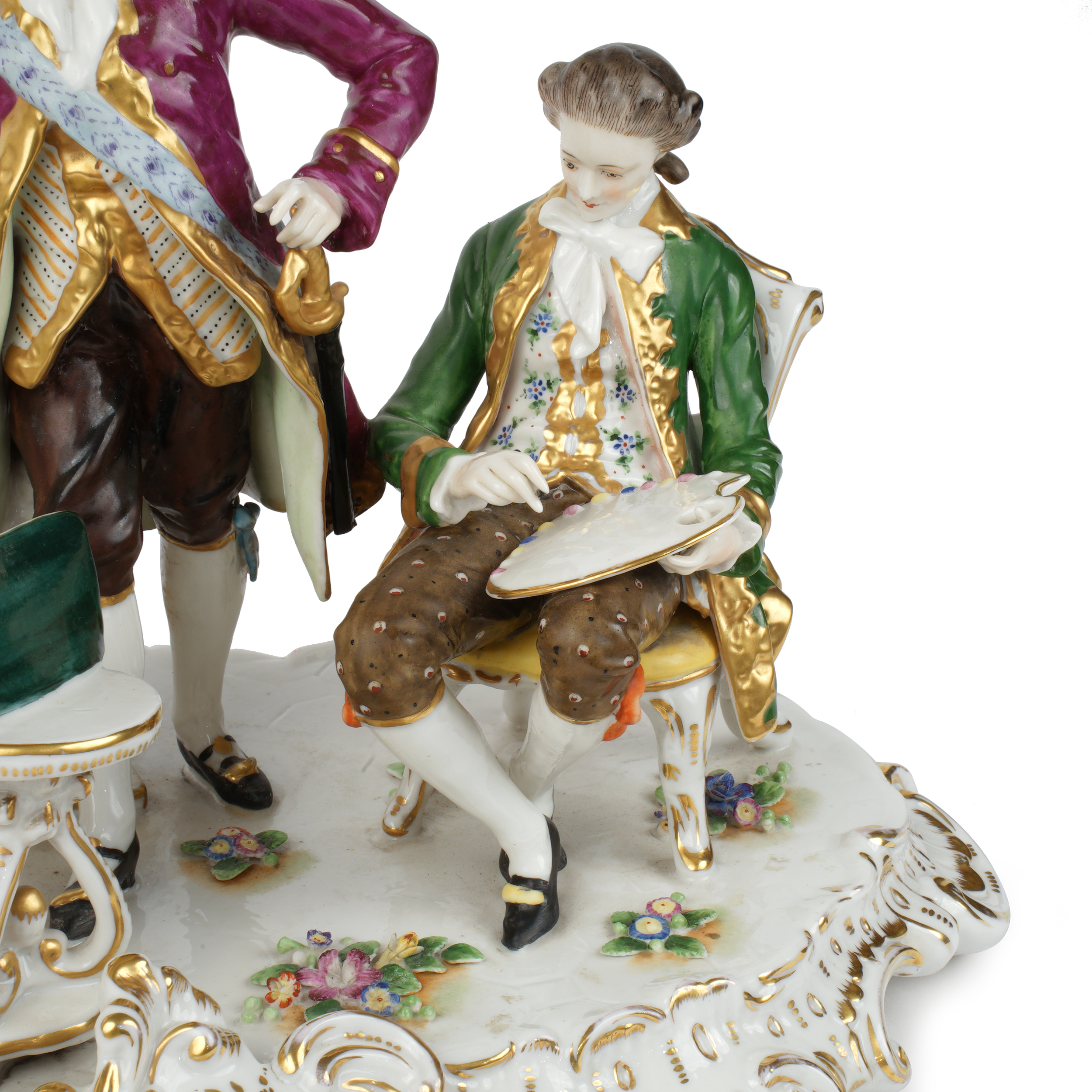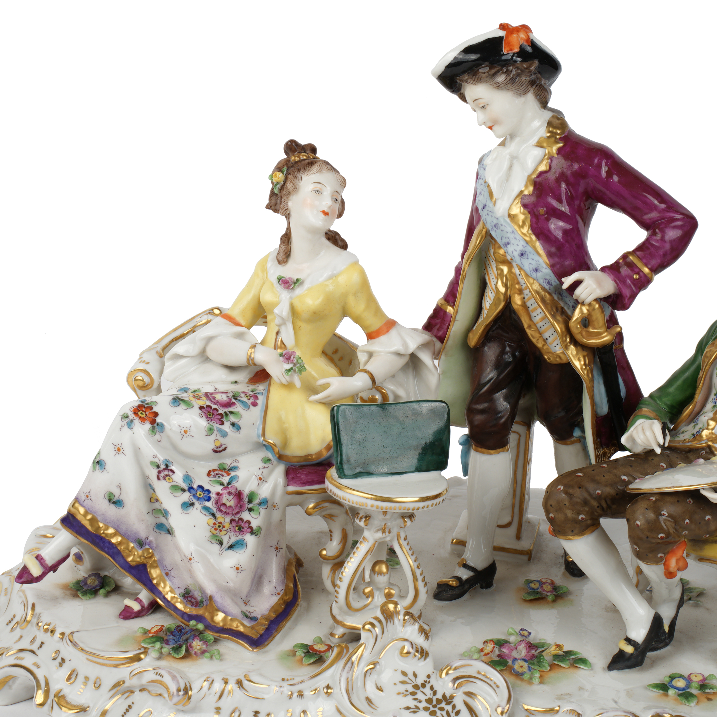 Красочная композиция выполнена из фарфора в лучших традициях мейсенских мастеров. Непринужденность и естественность поз героев этюда – прекрасной дамы и двух ее кавалеров, яркость их нарядов и легкая золотая вязь на белоснежном фоне основания притягивают взгляд, а истинных знатоков и вовсе приведут в искреннее восхищение. Композиция станет яркой нотой, придающей аутентичность интерьеру в стиле классика или барокко.