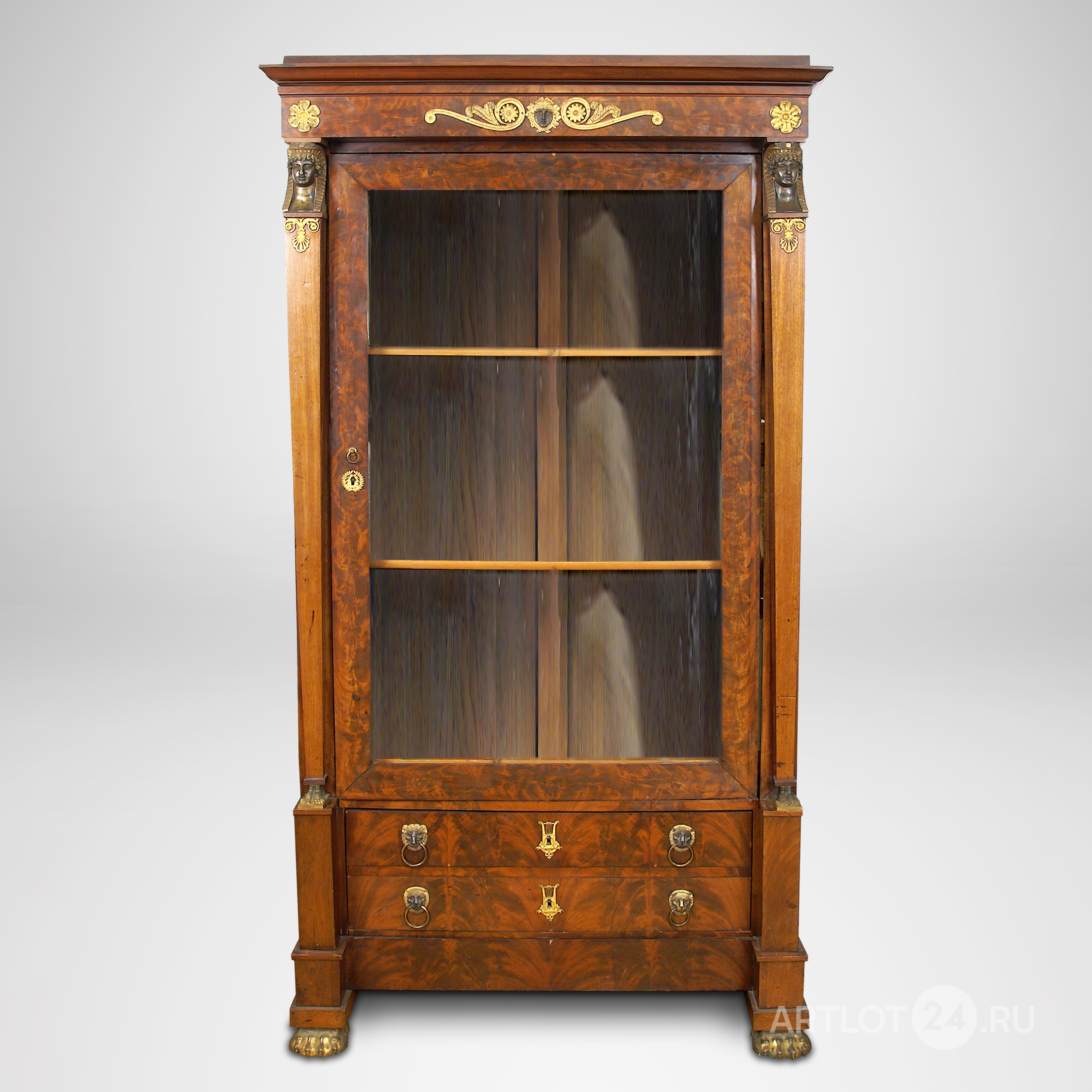 Декорирован накладками из золоченой и патинированной бронзы в виде кариатид. Красное дерево, бронза, золочение, патинирование, металл, стекло, Франция, первая четверть XIX века, размер (в/ш/г): 206 х 105 х 50 см