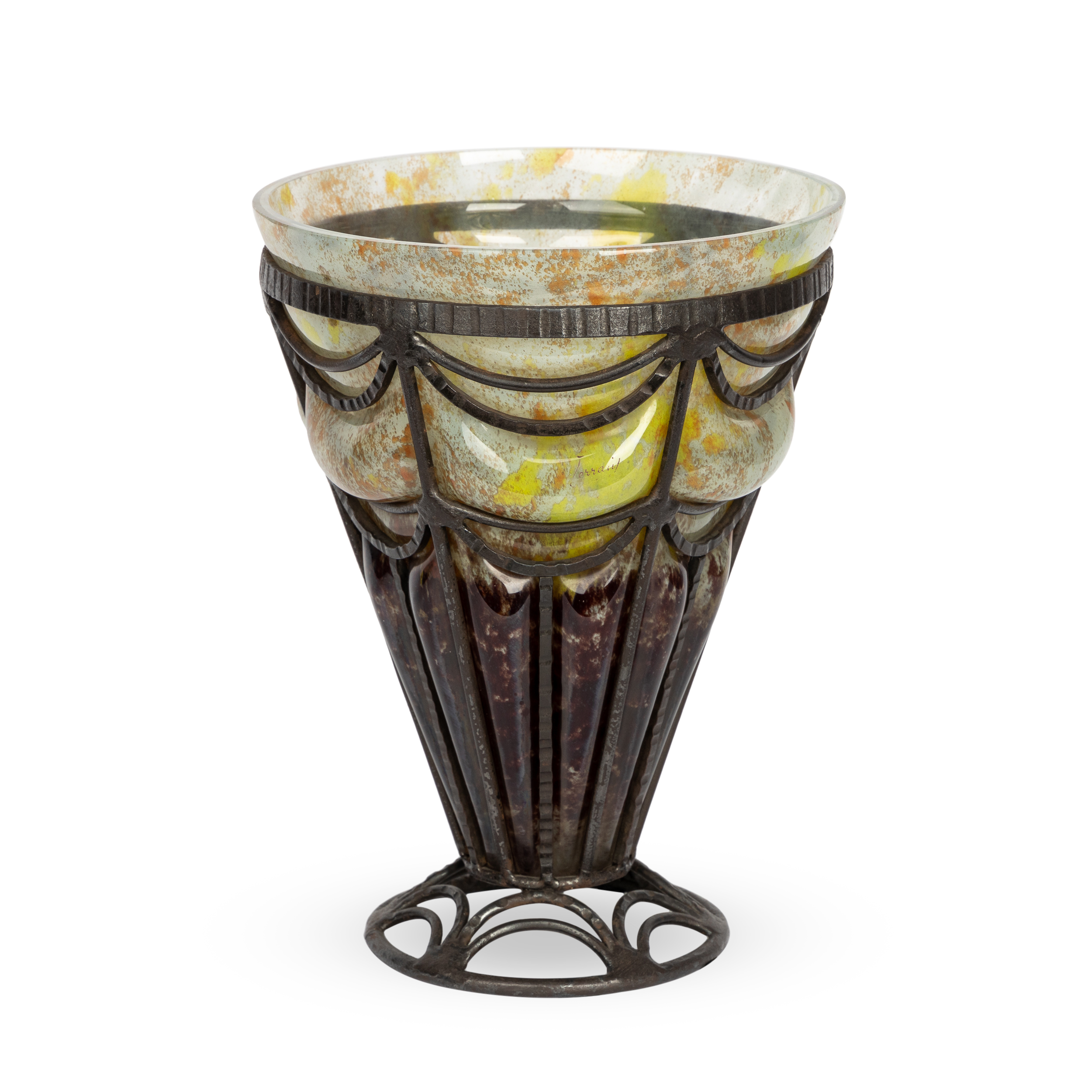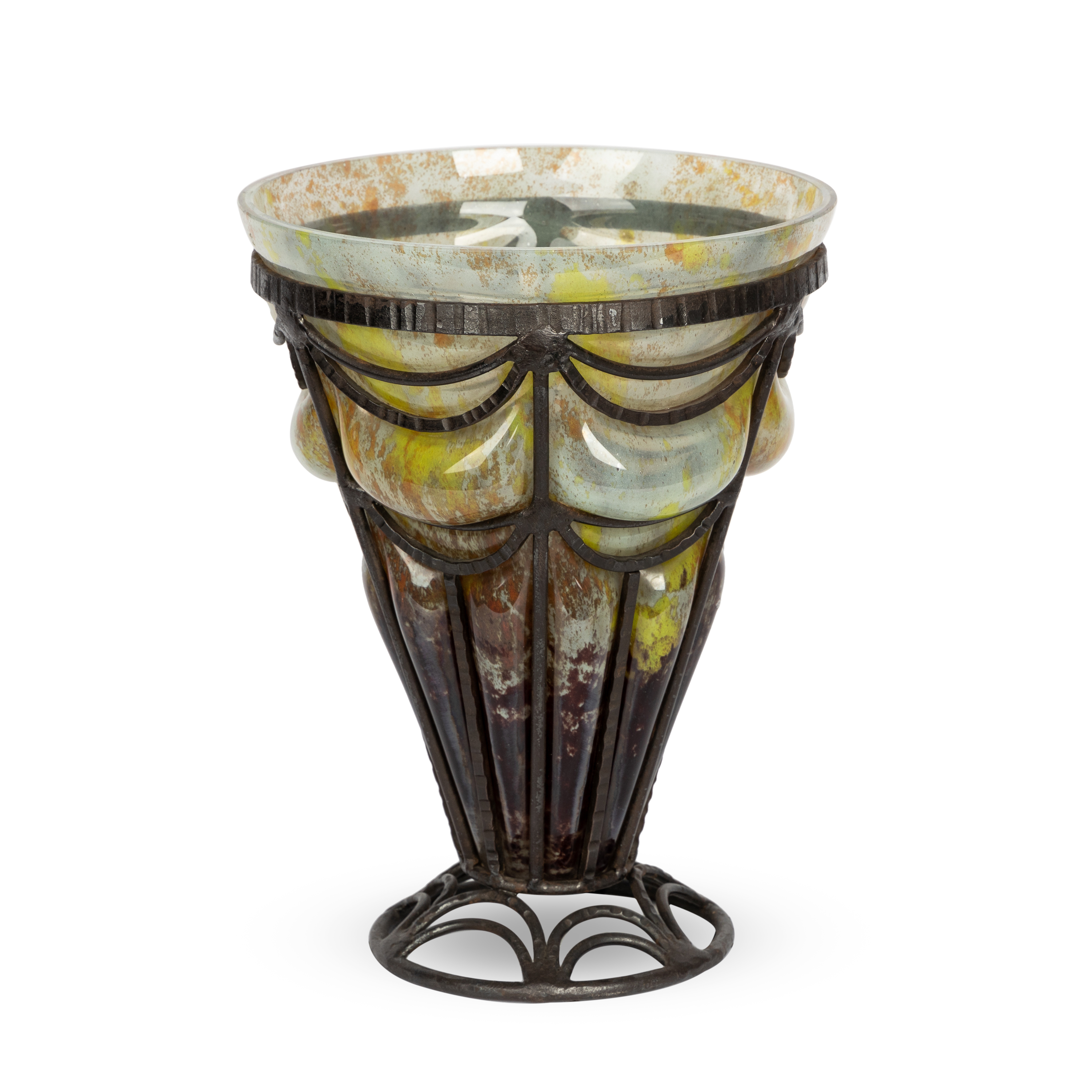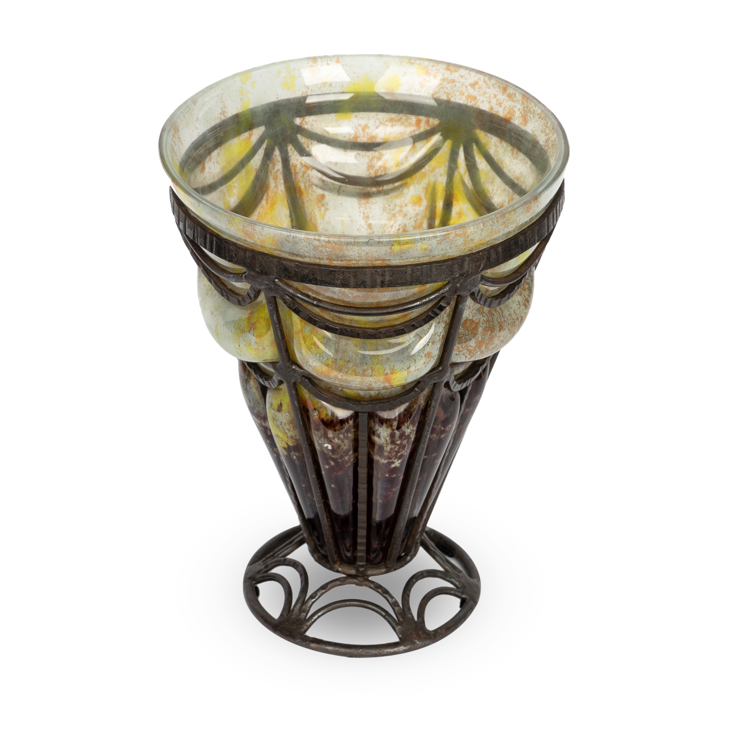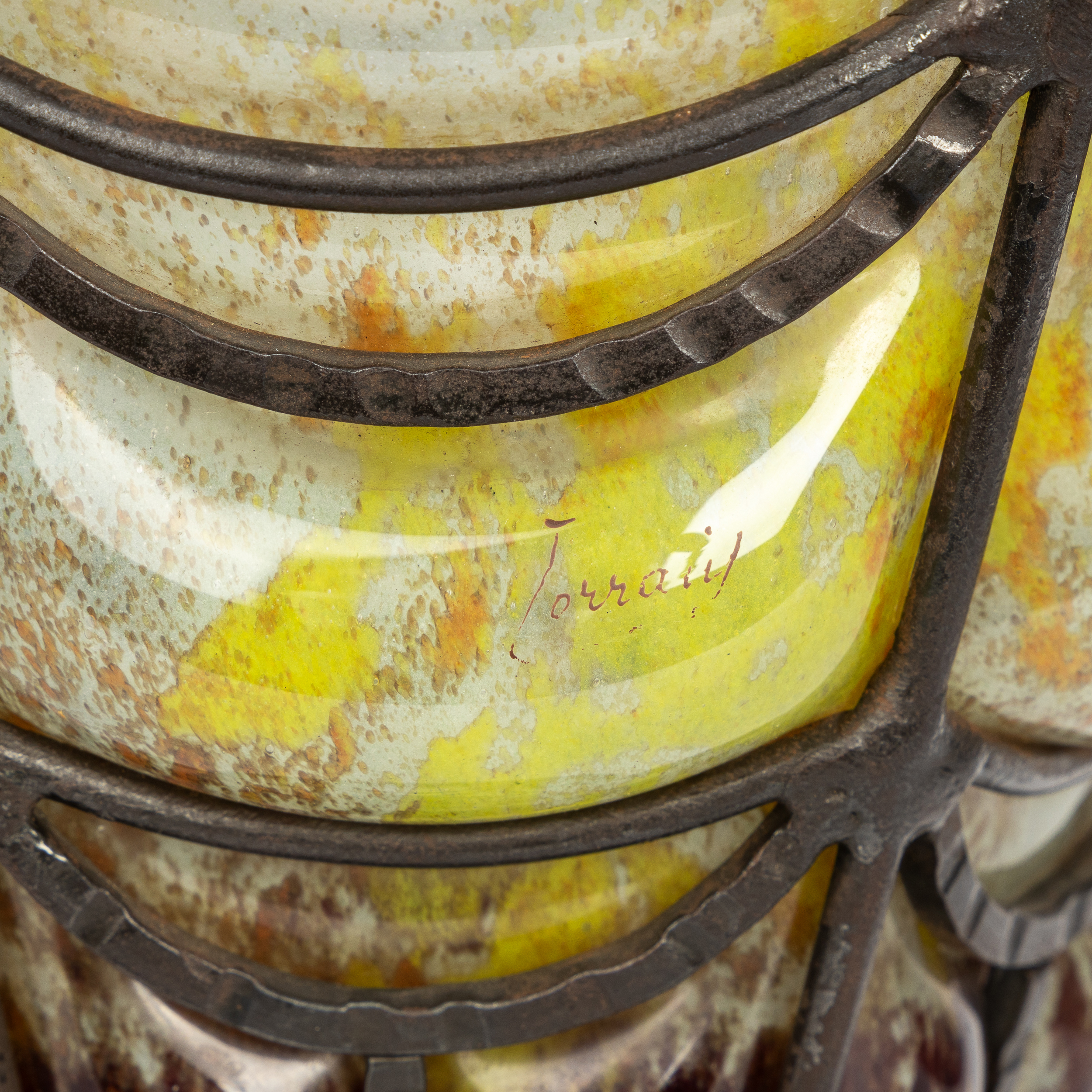 Ваза по модели дизайнера Шарля Шнайдера (Charles Schnieder, 1881-1952). Литье в форму в технике пат-де-вер, многослойное стекло, пудра, металлическая оплетка в технике ковки; на стекле подпись: «Lorraine», высота – 31 см, диаметр – 23 см.