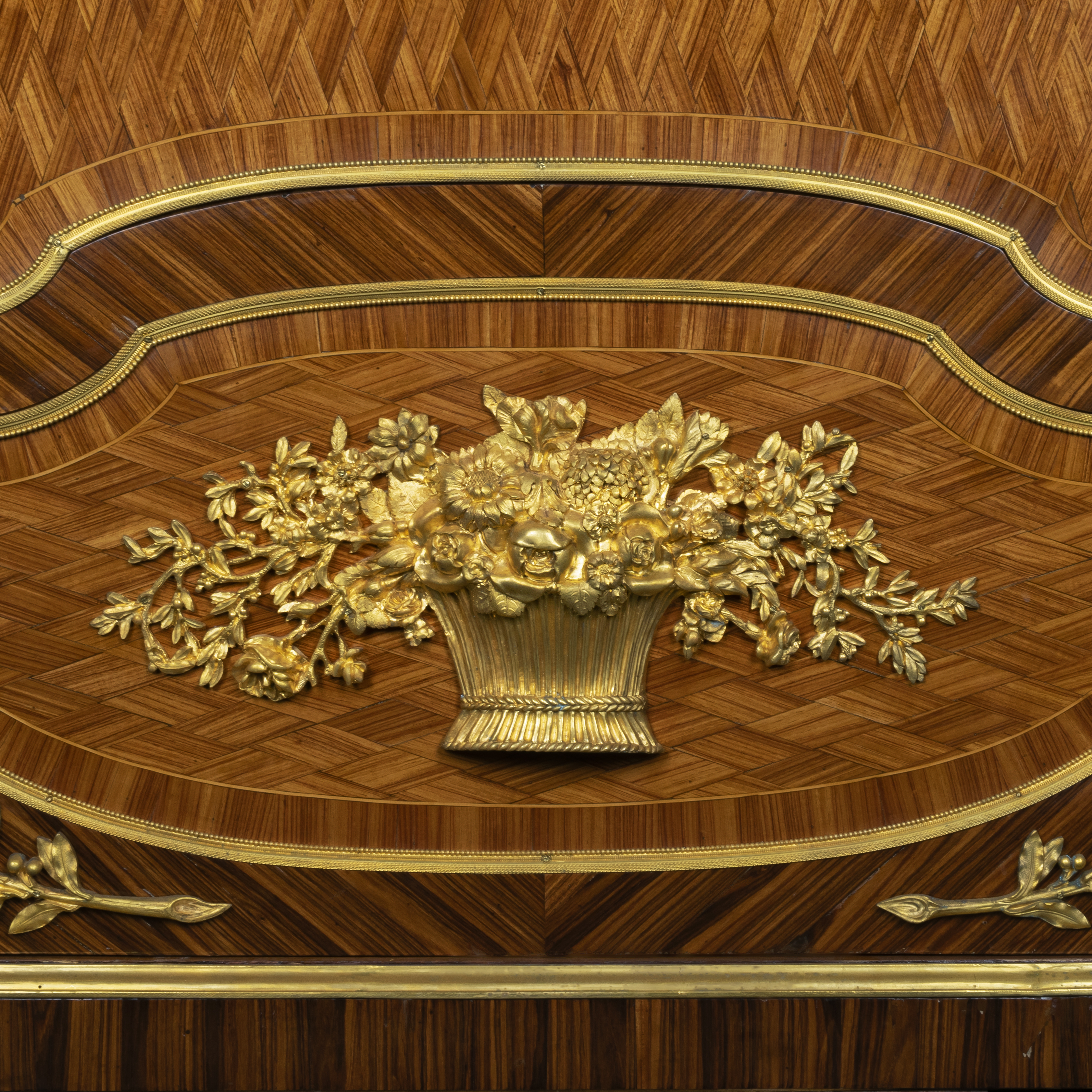 Красное дерево, кингвуд, паркетри, тюльпановое дерево, мрамор, стекло, бронза, золочение. Выполнена в манере Франсуа Линке (1855-1946). На замочной пластине клеймо Duvivier/77, St. Antoine/Paris, circ". Размер 158х144х42,5 см.