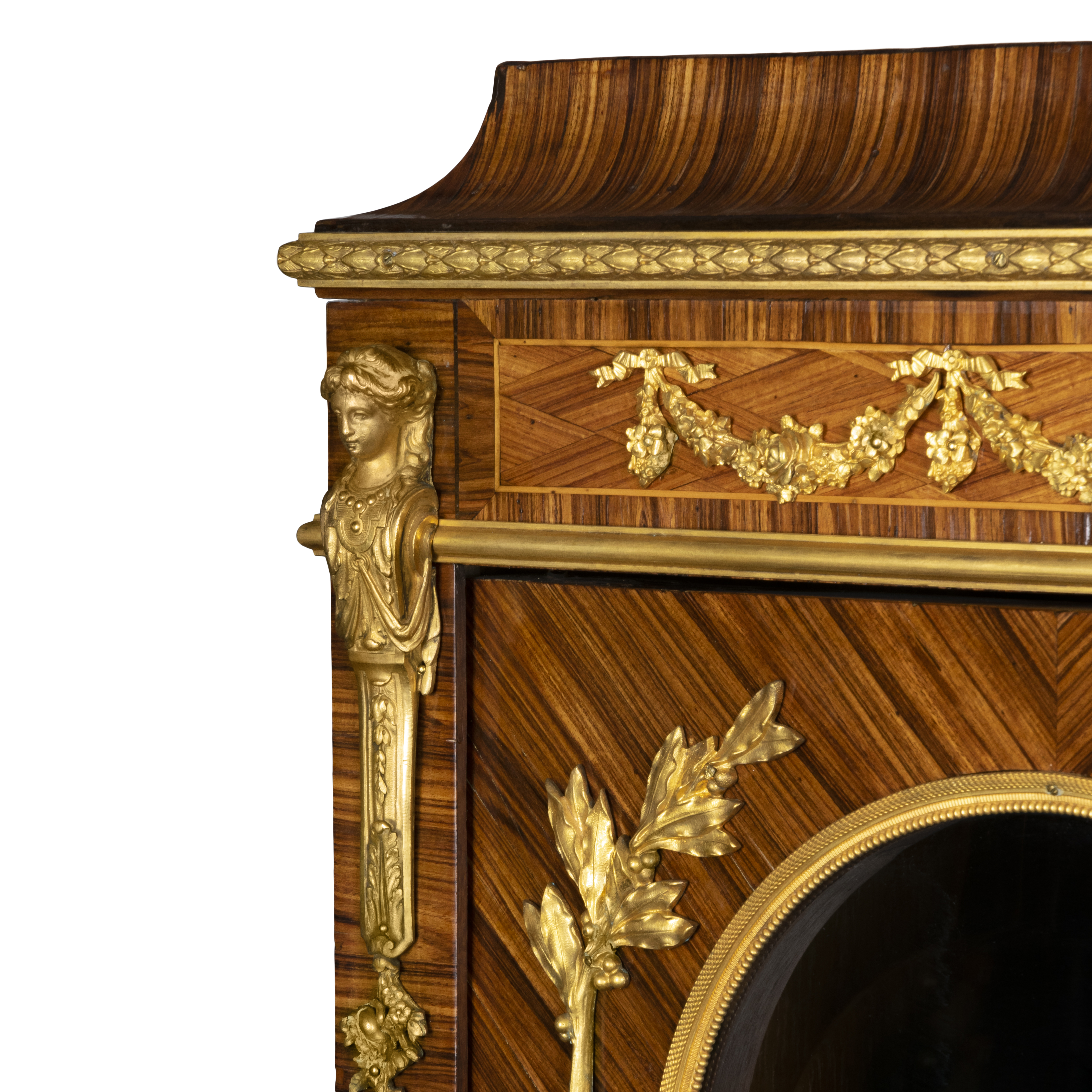 Красное дерево, кингвуд, паркетри, тюльпановое дерево, мрамор, стекло, бронза, золочение. Выполнена в манере Франсуа Линке (1855-1946). На замочной пластине клеймо Duvivier/77, St. Antoine/Paris, circ". Размер 158х144х42,5 см.