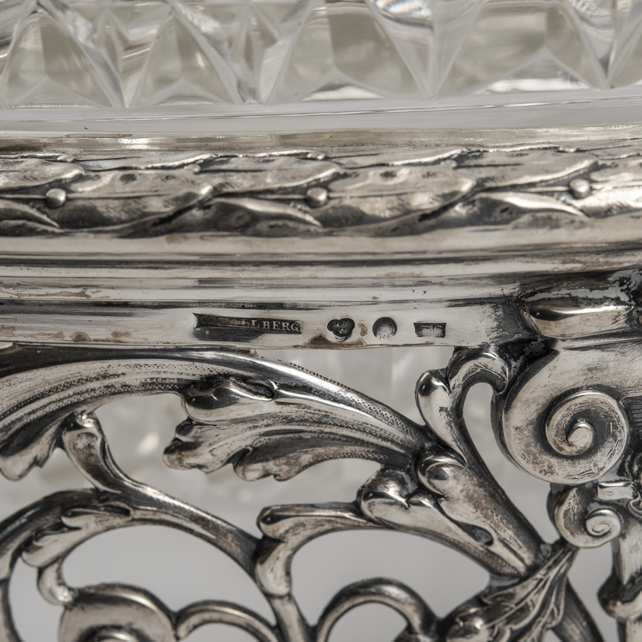Клейма: 813 проба, «Три короны» на рифленом фоне в щитке, форма которого представляет собой символ трилистника, нечитаемое клеймо, в прямоугольнике «V6», именник мастерской «C.G. Hallberg», фирма Густава Хальберга (Hallbergs Guldsmeds), Поставщик шведского королевского двора;