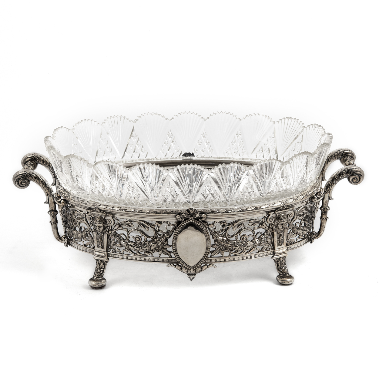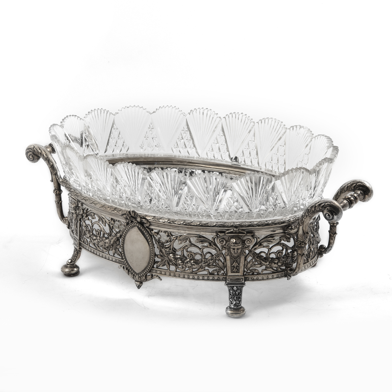 Белый металл, литье, ручная доработка, полировка, хрусталь, резьба с алмазной гранью.