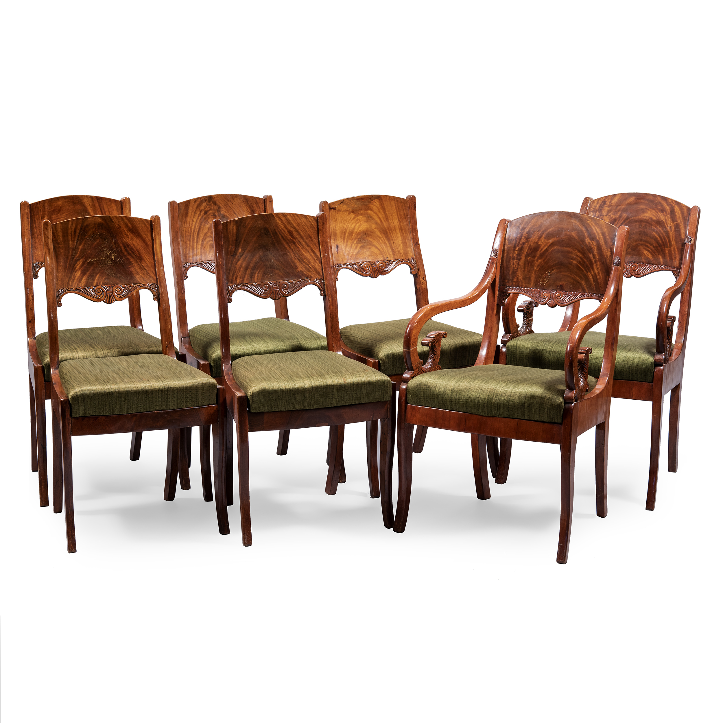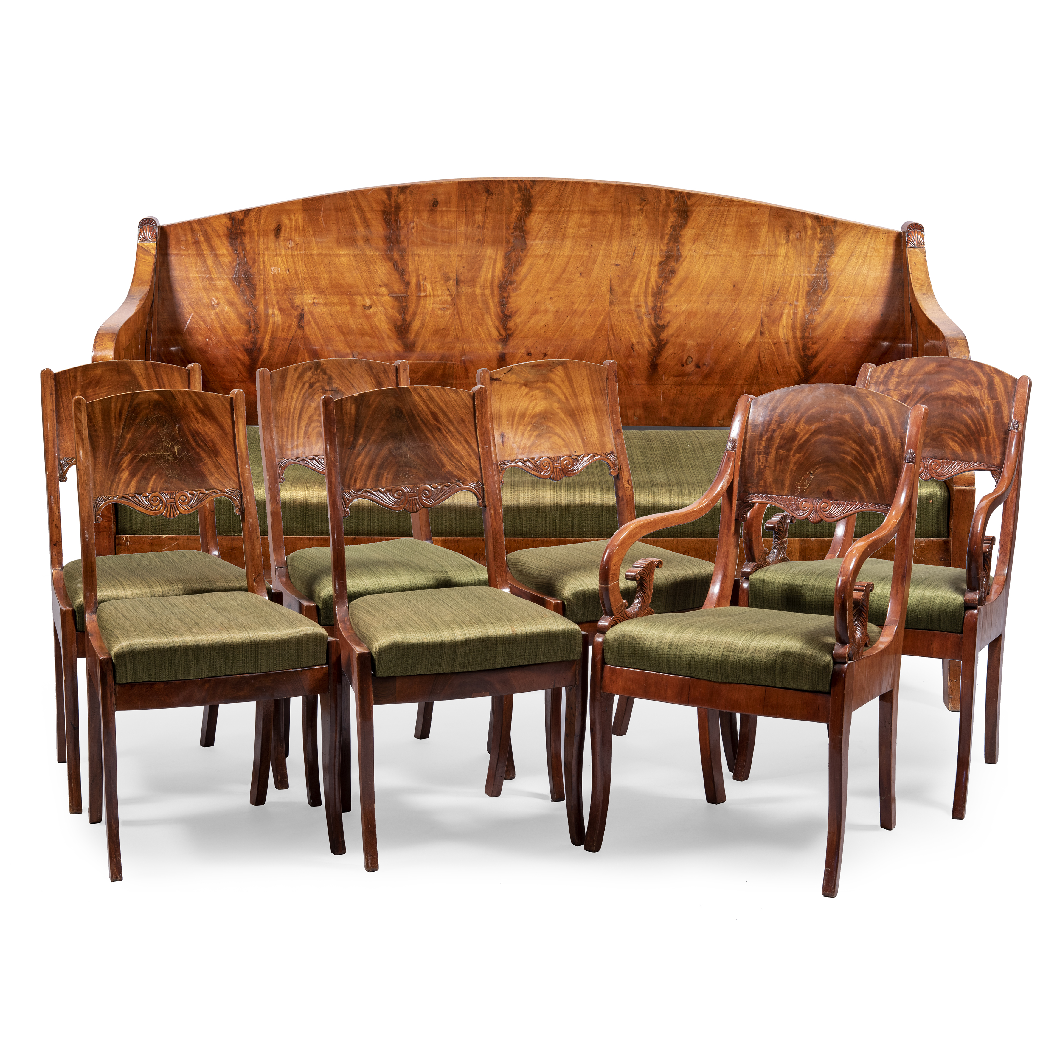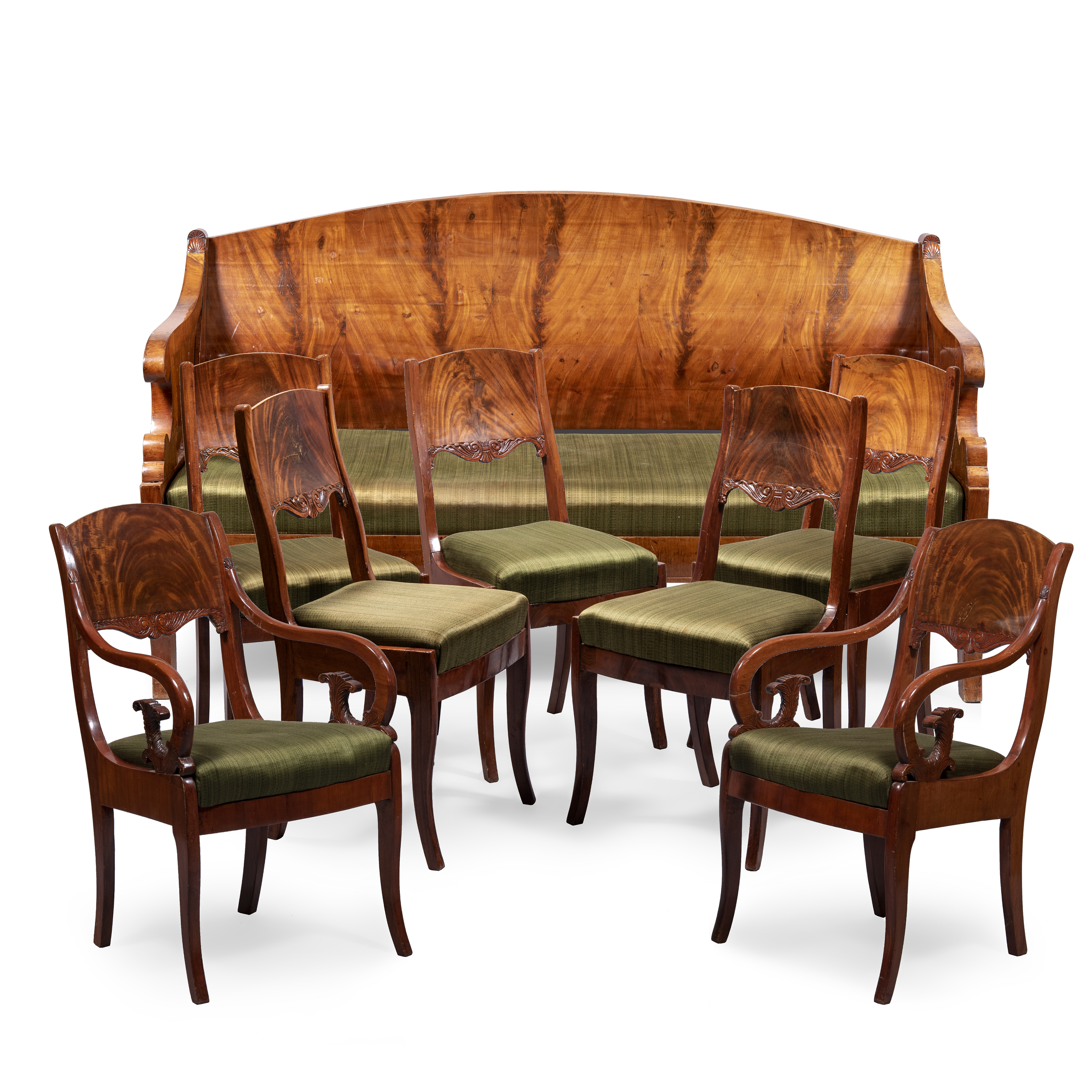 8 предметов: Диван, комплект из пяти стульев и двух кресел. Дуб (основа), фанерование красным деревом, резьба, обивка тканью, размер (в/ш/г):
