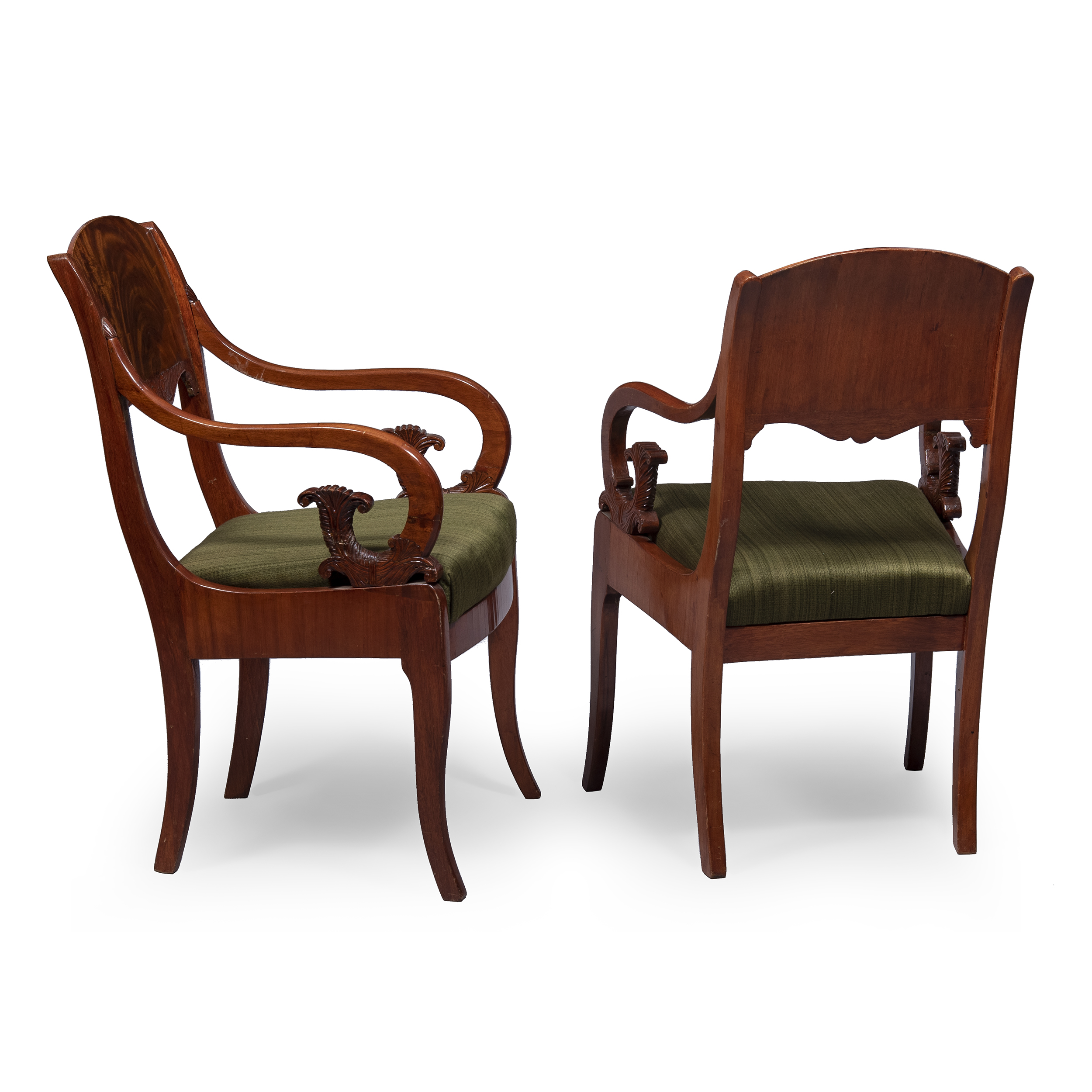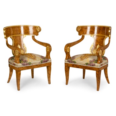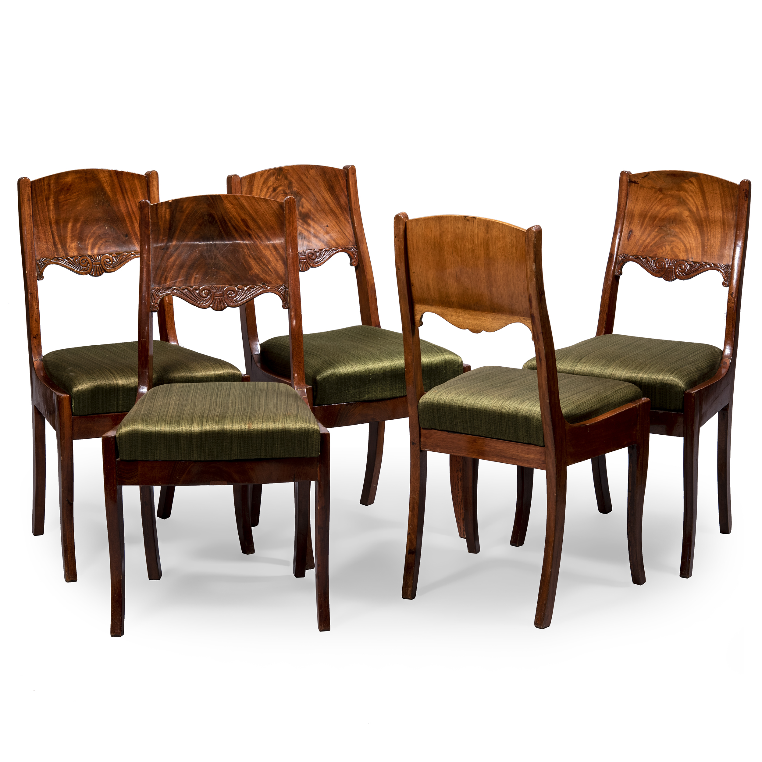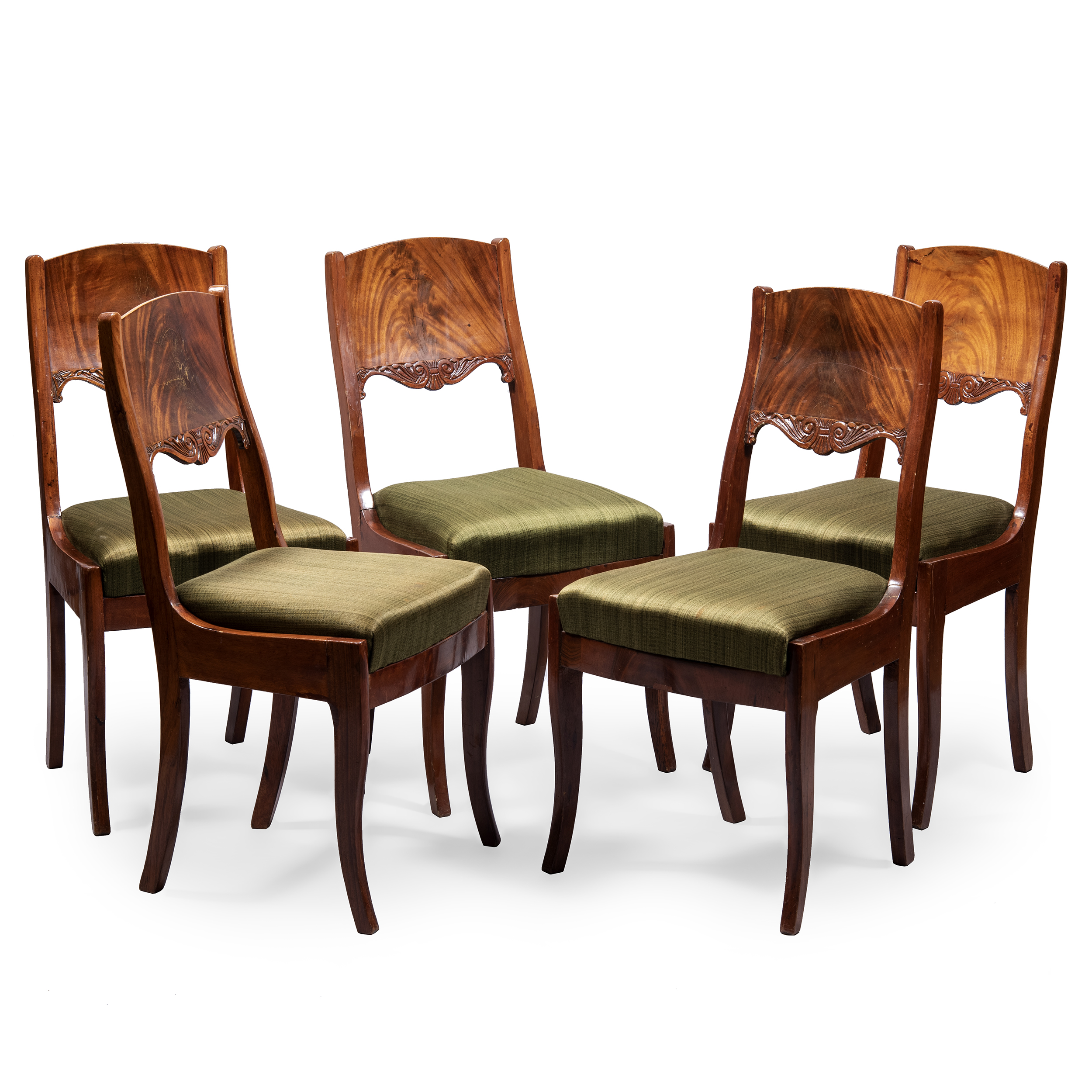 8 предметов: Диван, комплект из пяти стульев и двух кресел. Дуб (основа), фанерование красным деревом, резьба, обивка тканью, размер (в/ш/г):