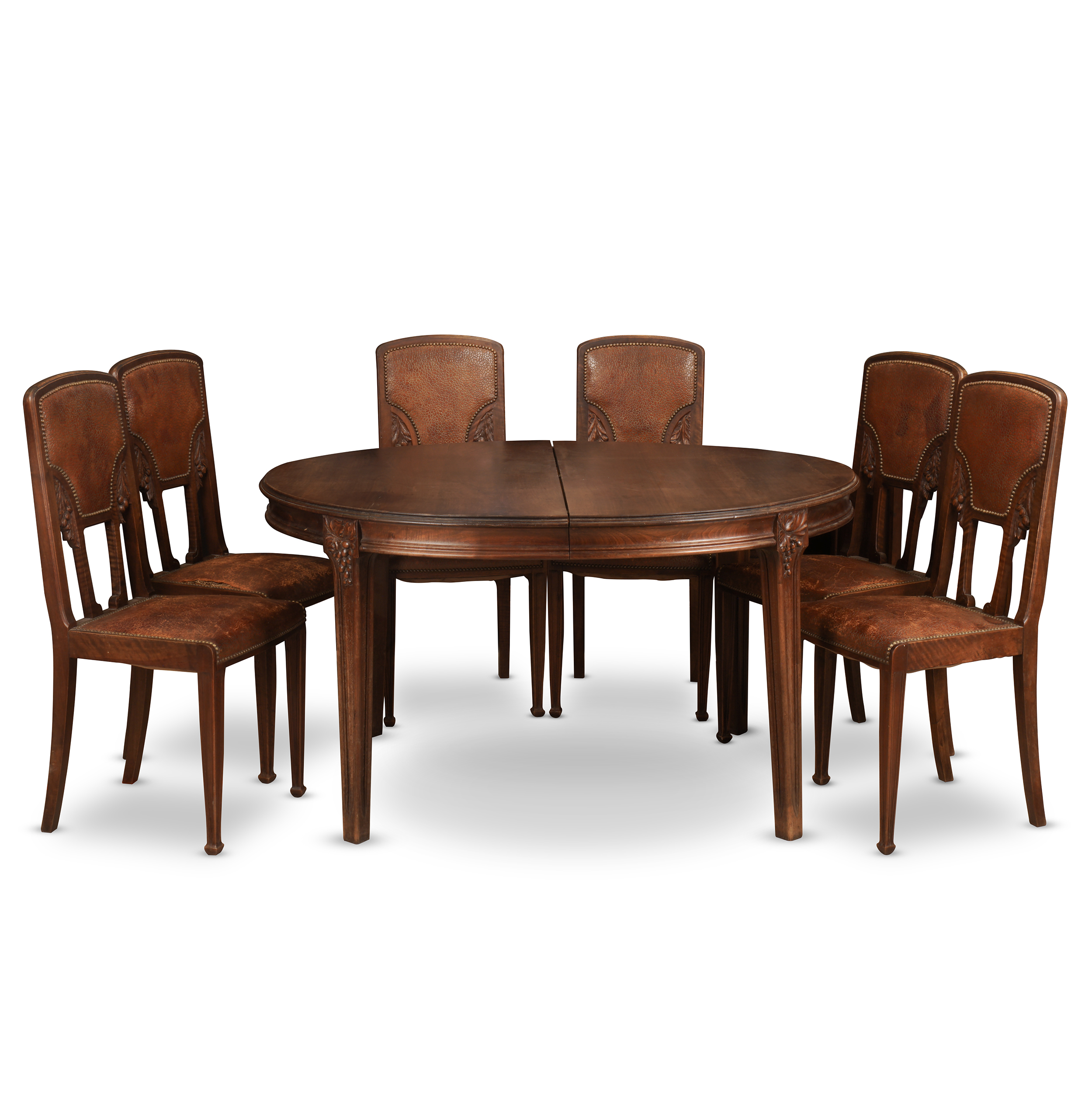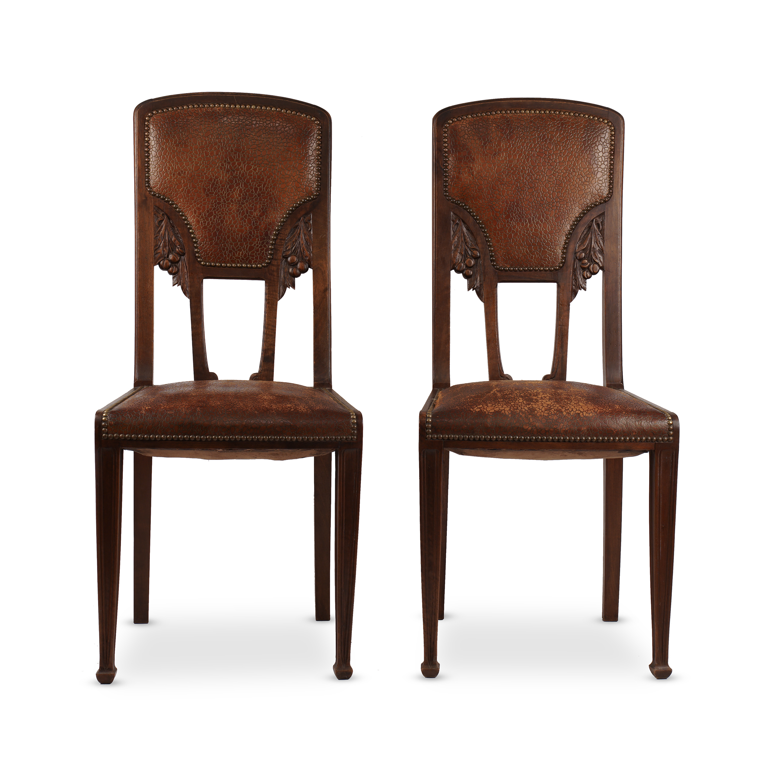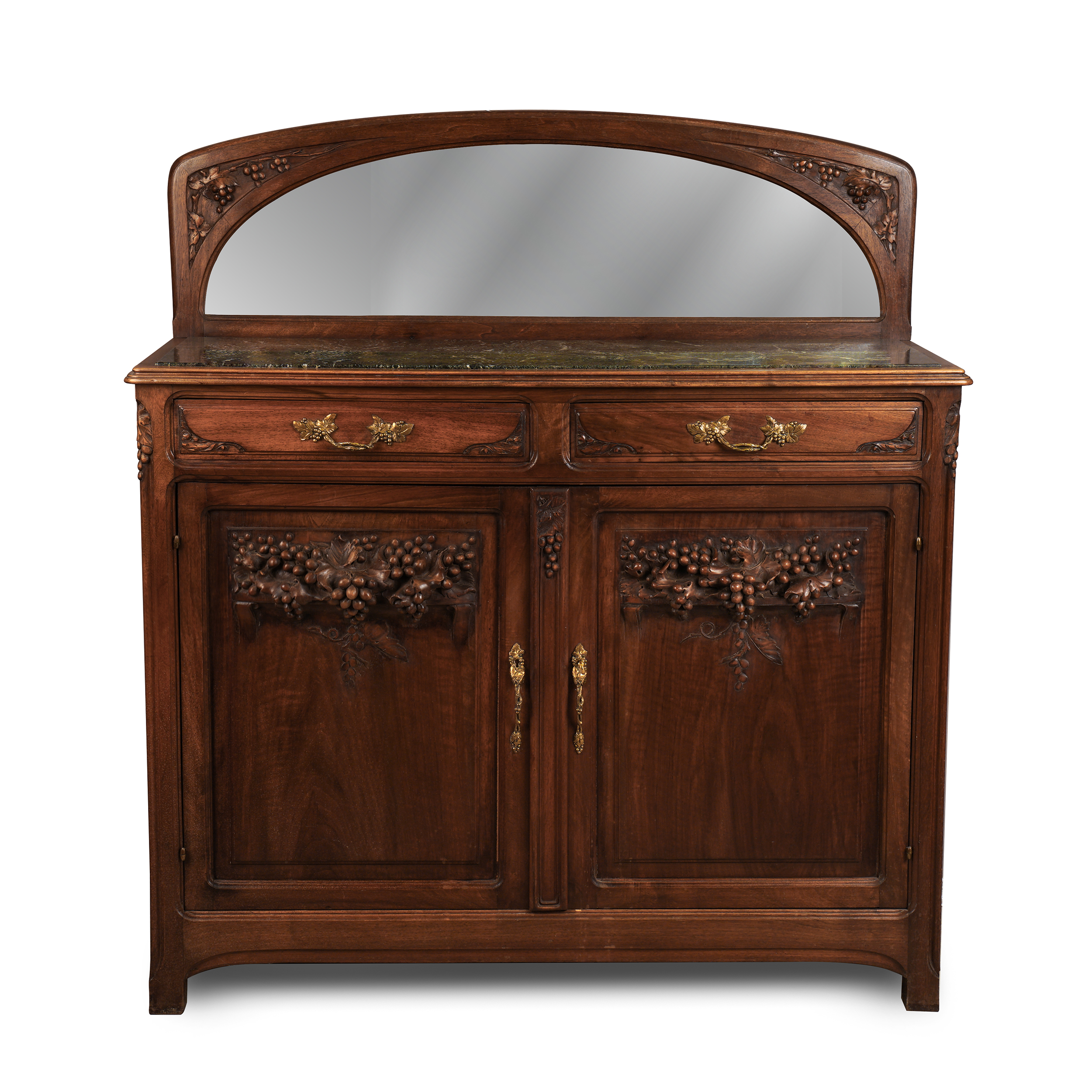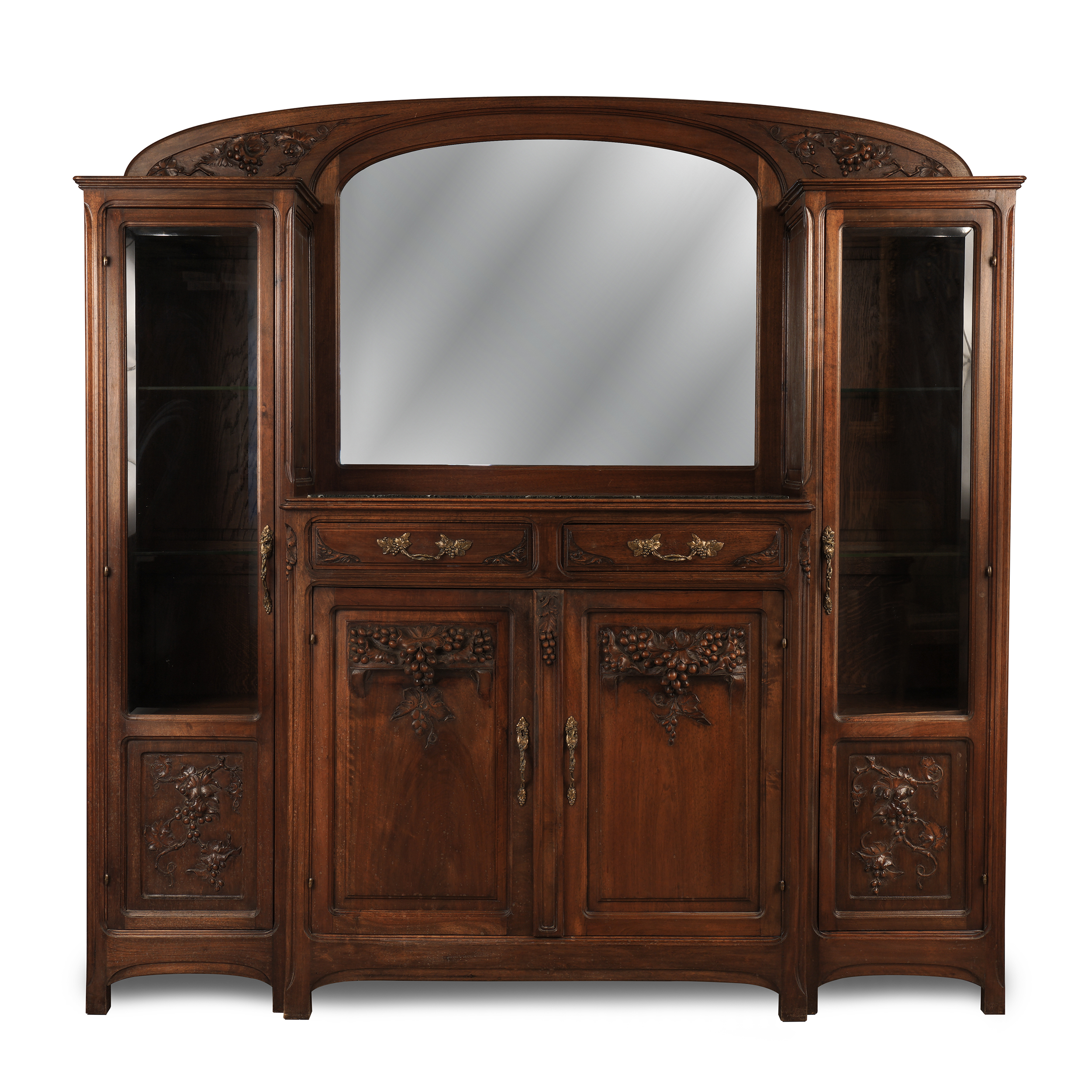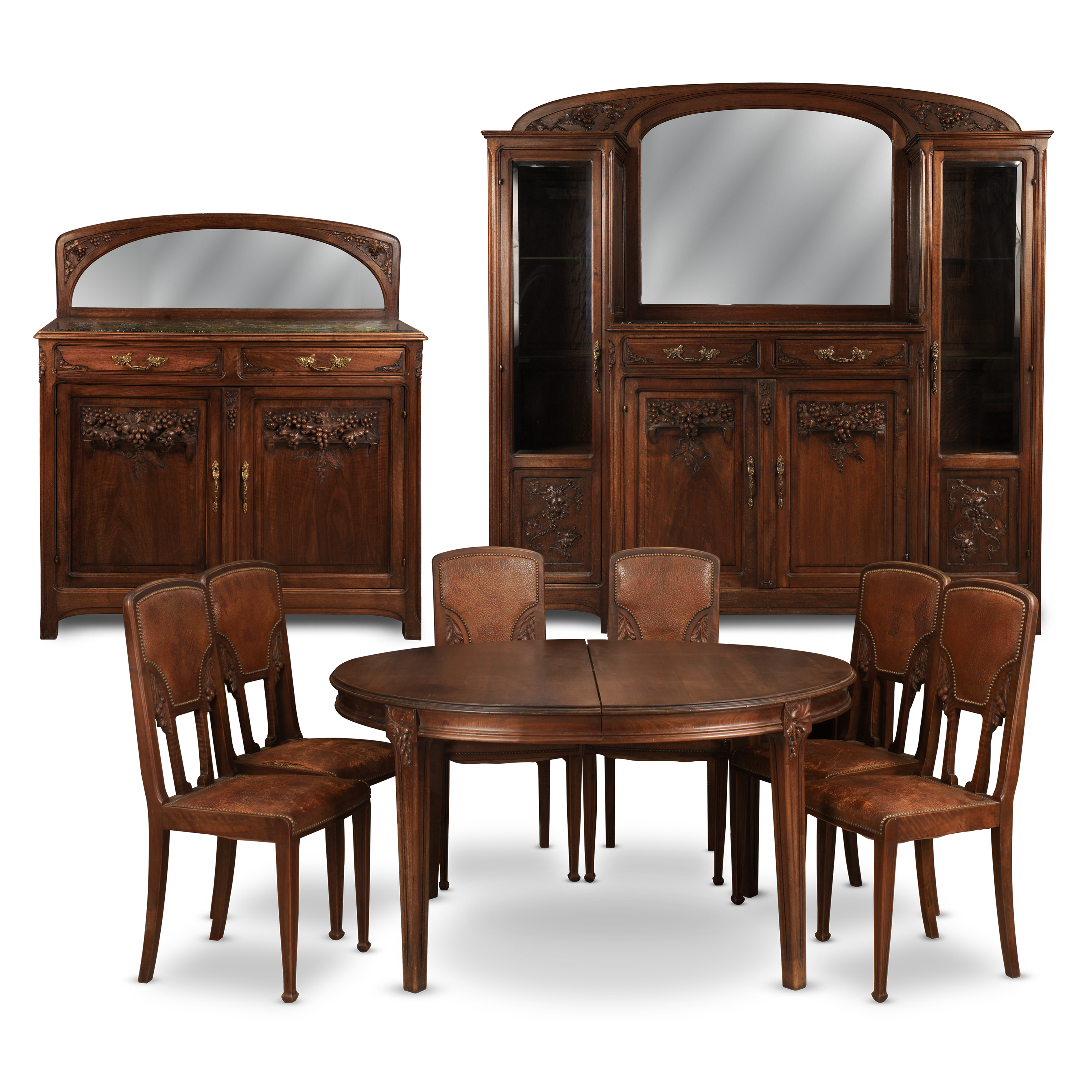 Массив ореха, резьба, тонировка, зеркальное стекло с фацетом, стекло, мрамор, кожа, фабрика Готье – Пуансиньон (Gauthier-Poinsignon), Школа Нанси, Франция, около 1915 года. Размер (в/ш/г): буфет 182 х 180х 45 см, поставец 137х 125 х 46 см, стол высота 74 х 138 х 118 см (три выдвижных створки, каждая по 44 см, из тополя), в разложенном виде 270 см, стулья - 97х44х40 см.