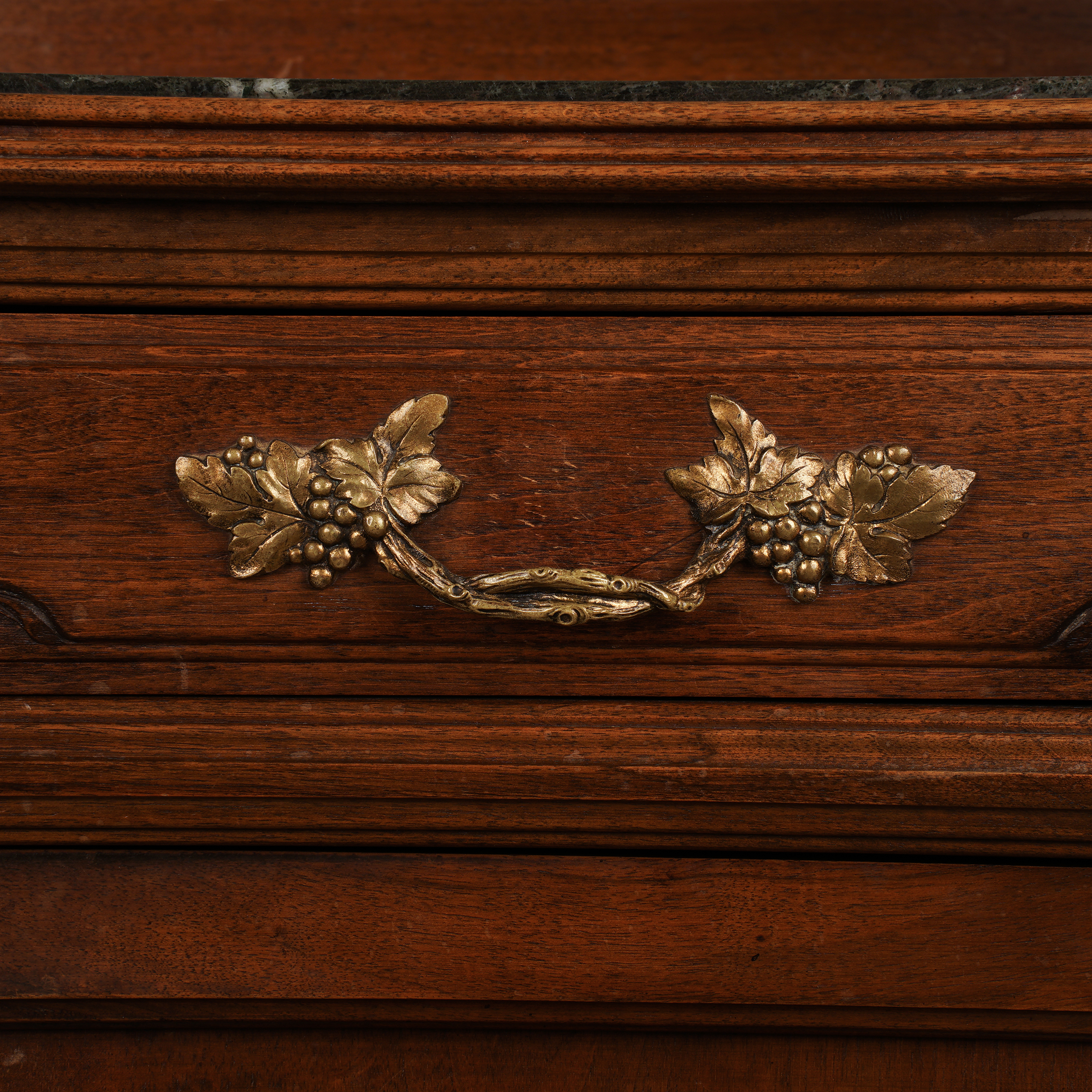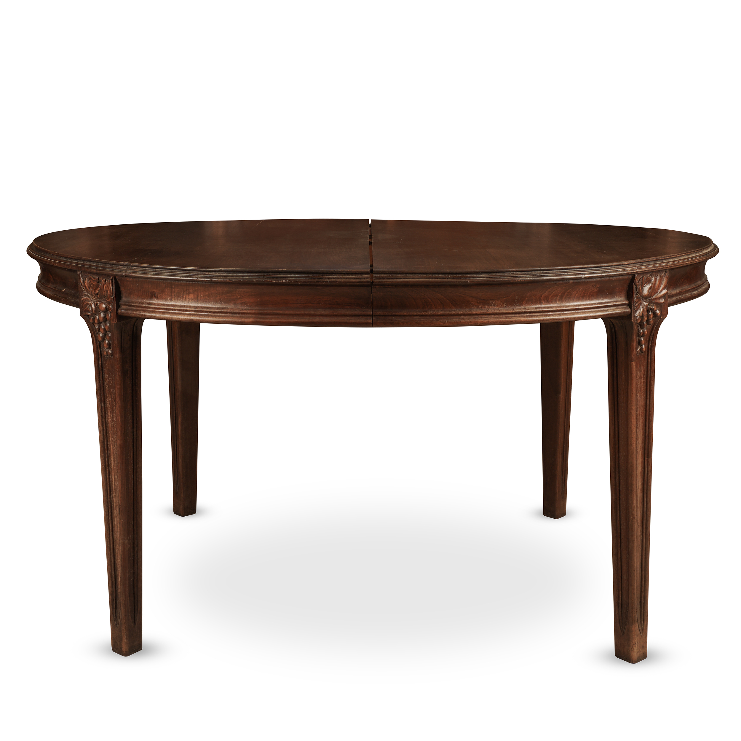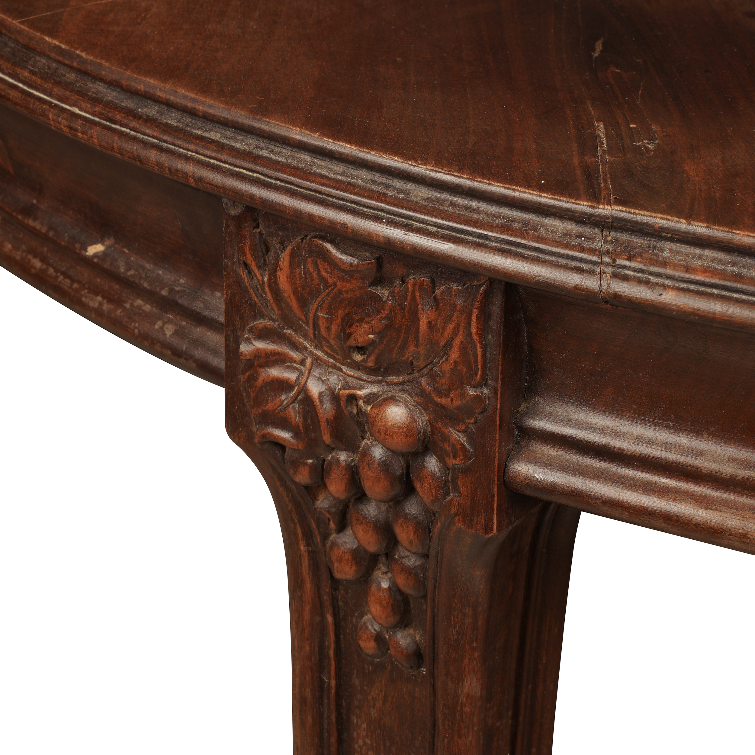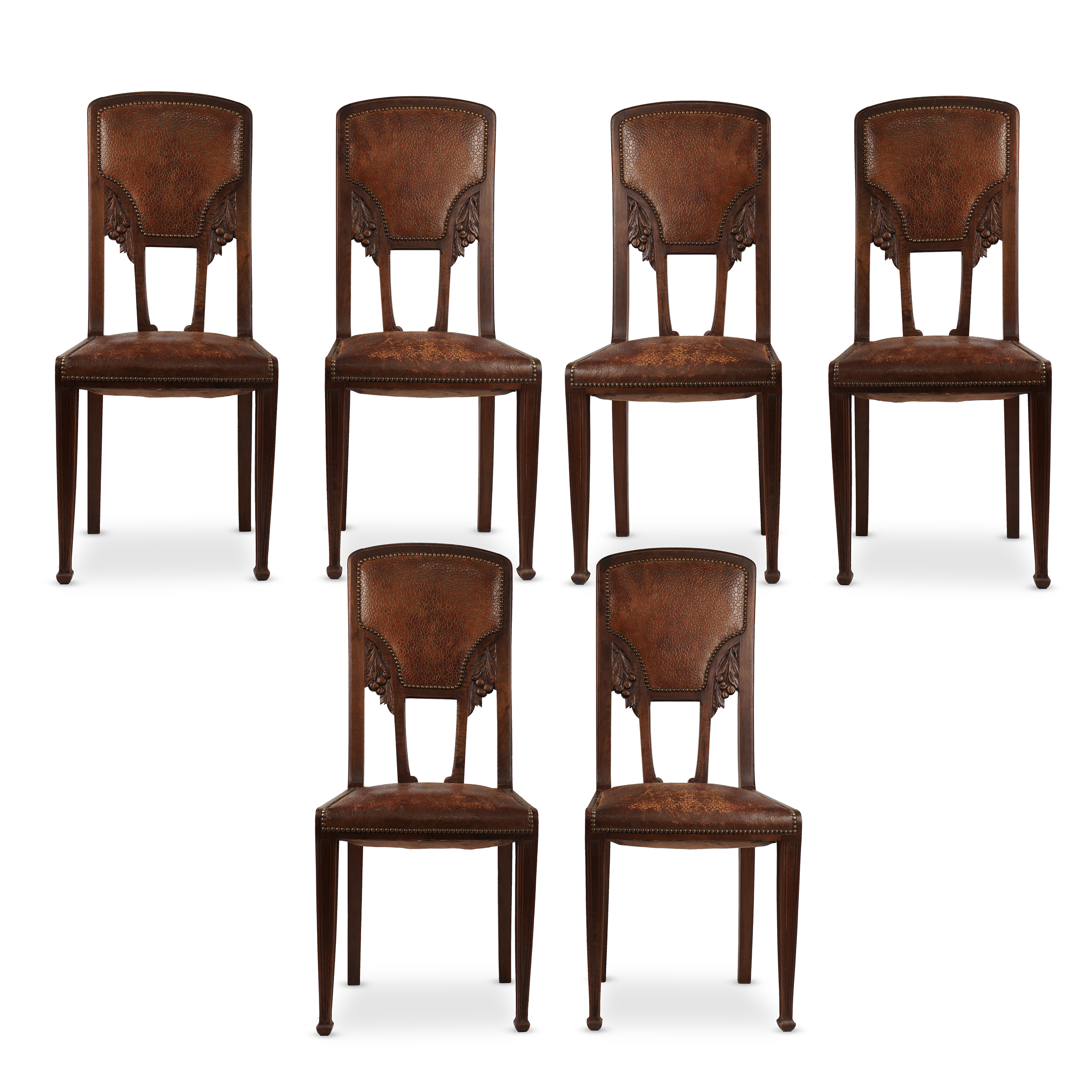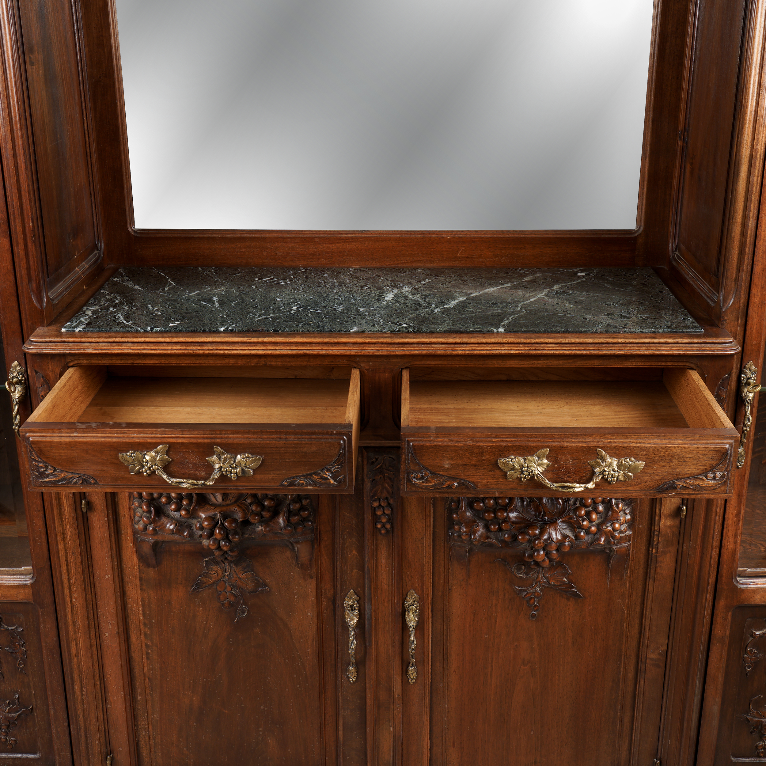 Массив ореха, резьба, тонировка, зеркальное стекло с фацетом, стекло, мрамор, кожа, фабрика Готье – Пуансиньон (Gauthier-Poinsignon), Школа Нанси, Франция, около 1915 года. Размер (в/ш/г): буфет 182 х 180х 45 см, поставец 137х 125 х 46 см, стол высота 74 х 138 х 118 см (три выдвижных створки, каждая по 44 см, из тополя), в разложенном виде 270 см, стулья - 97х44х40 см.