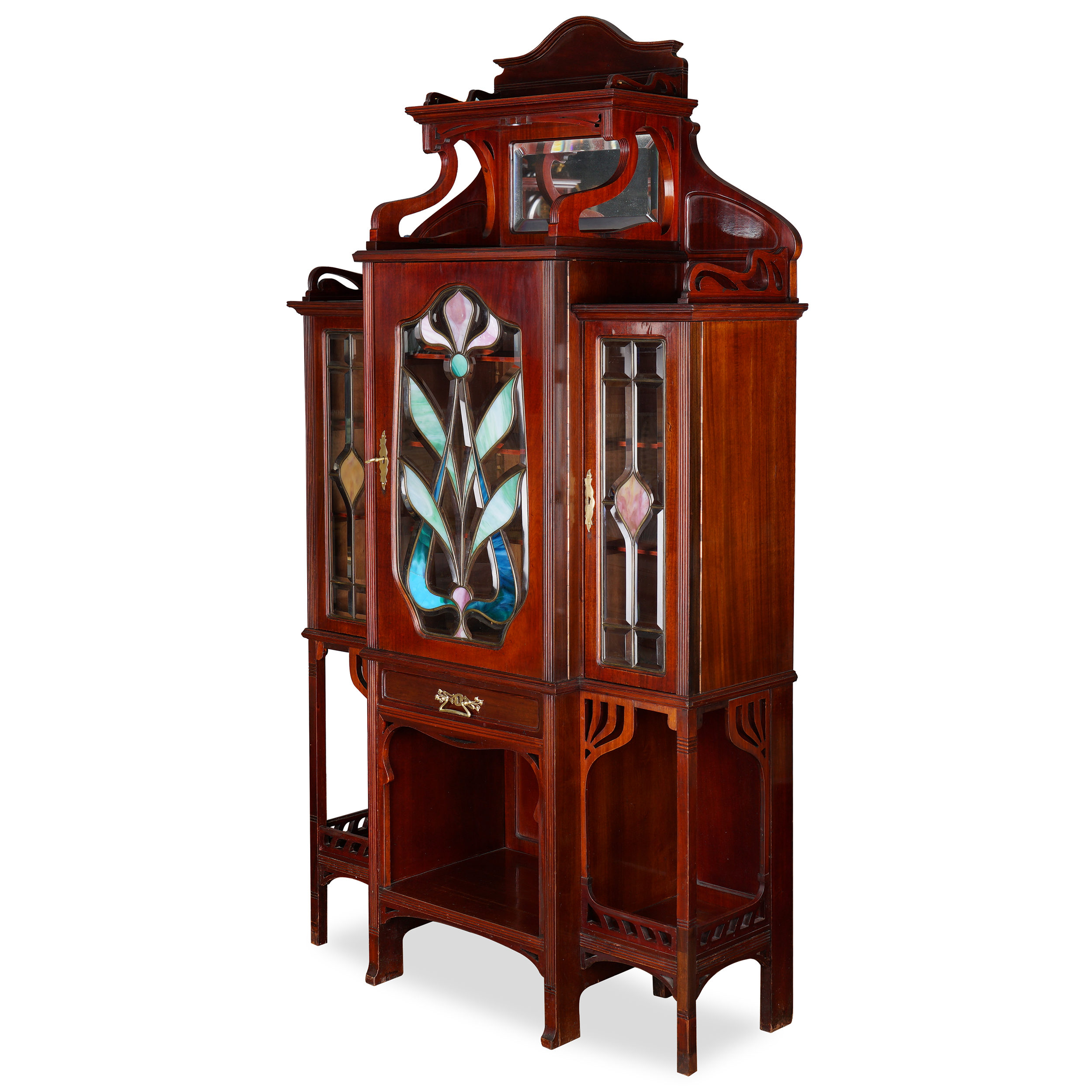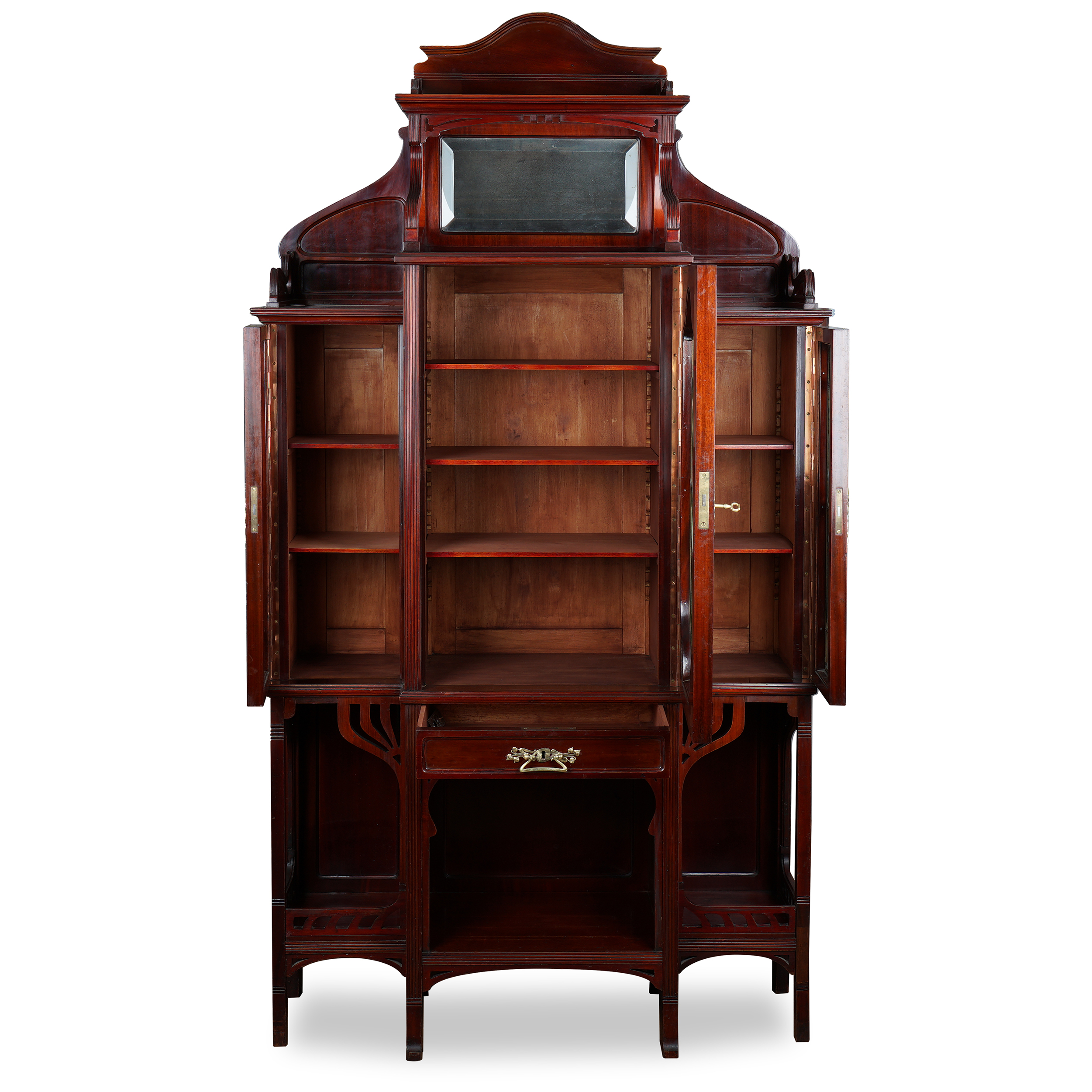 Красное дерево (фанеровка), хвойные породы (основа), резьба, прозрачное и цветное фацетное стекло, зеркальное стекло, бронза