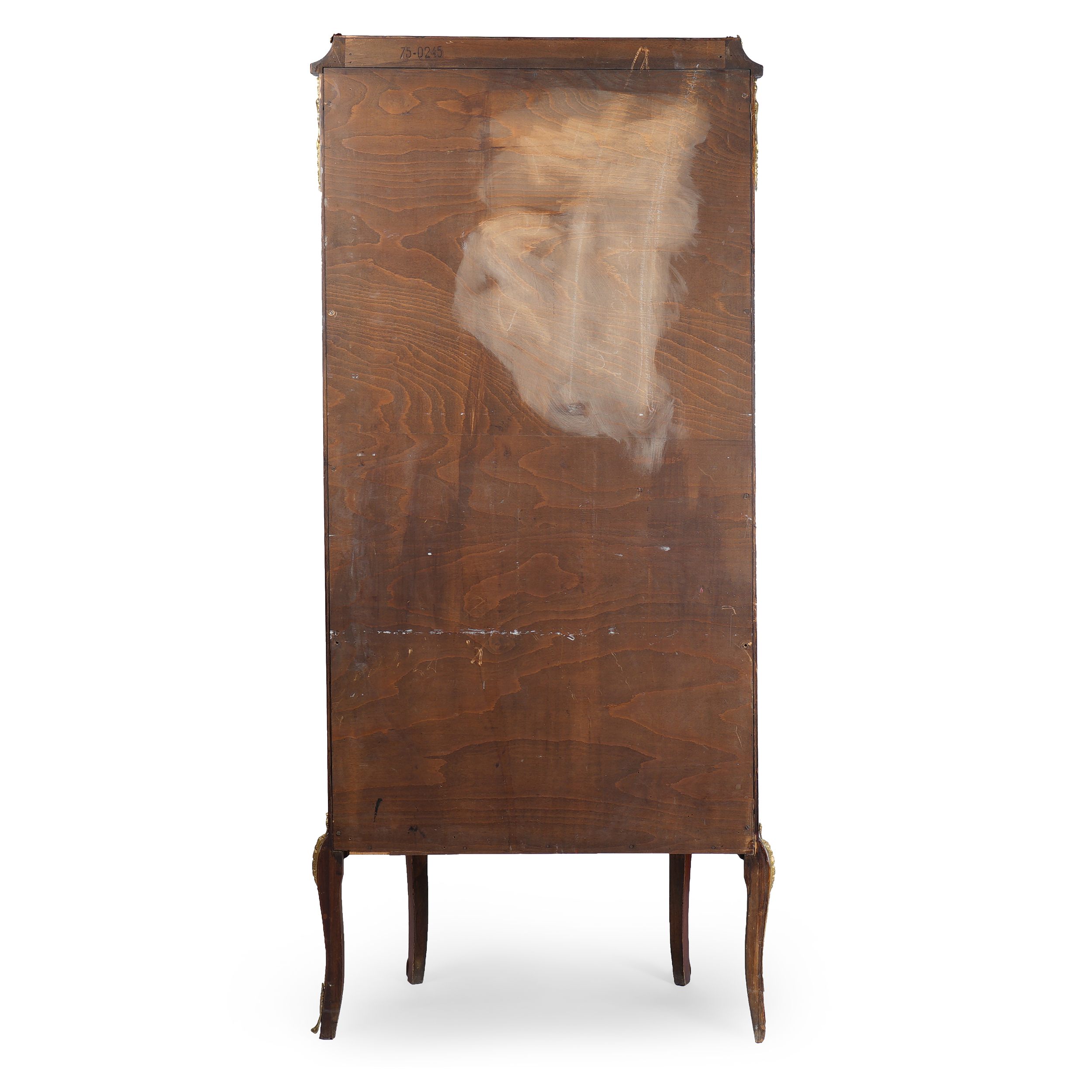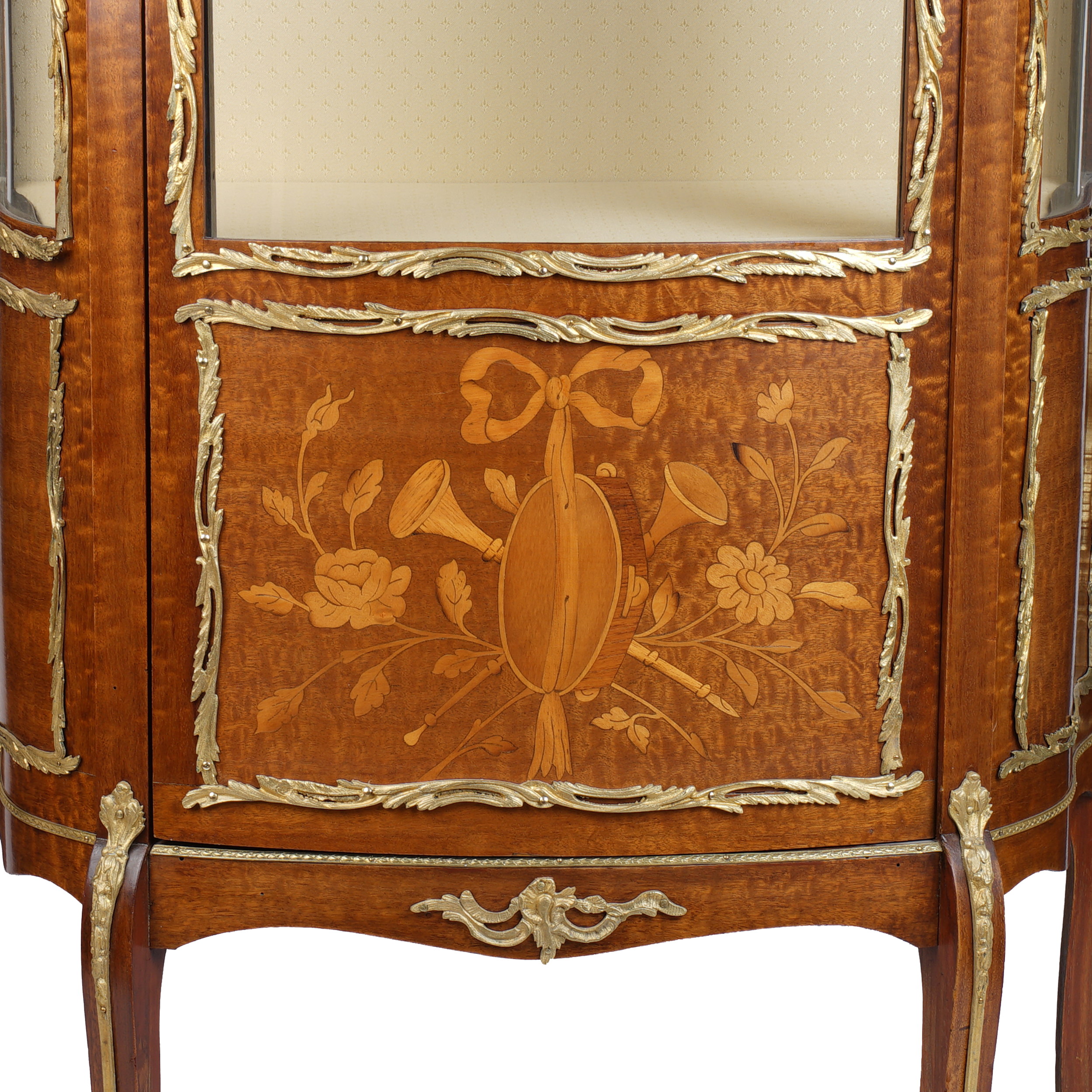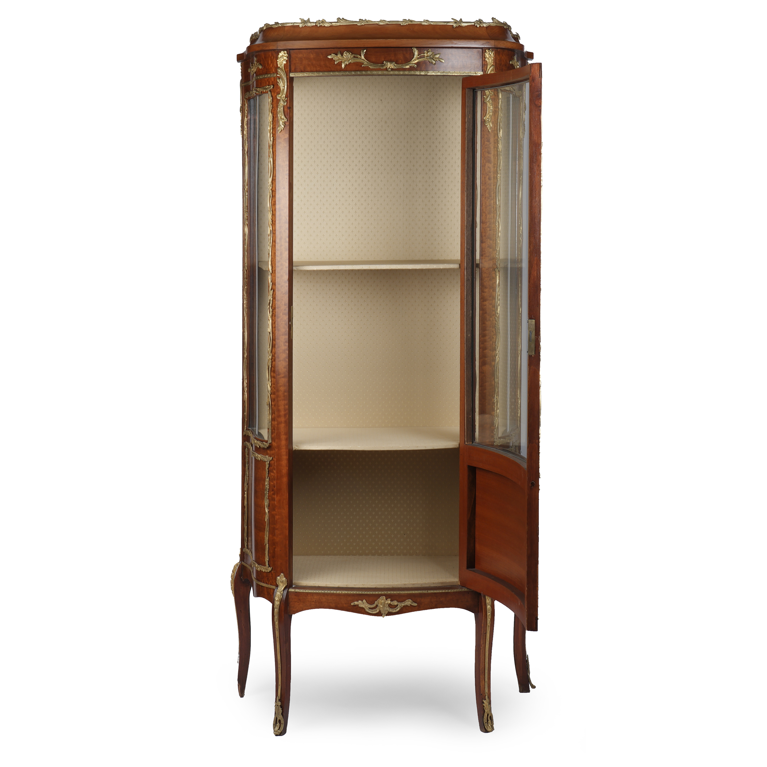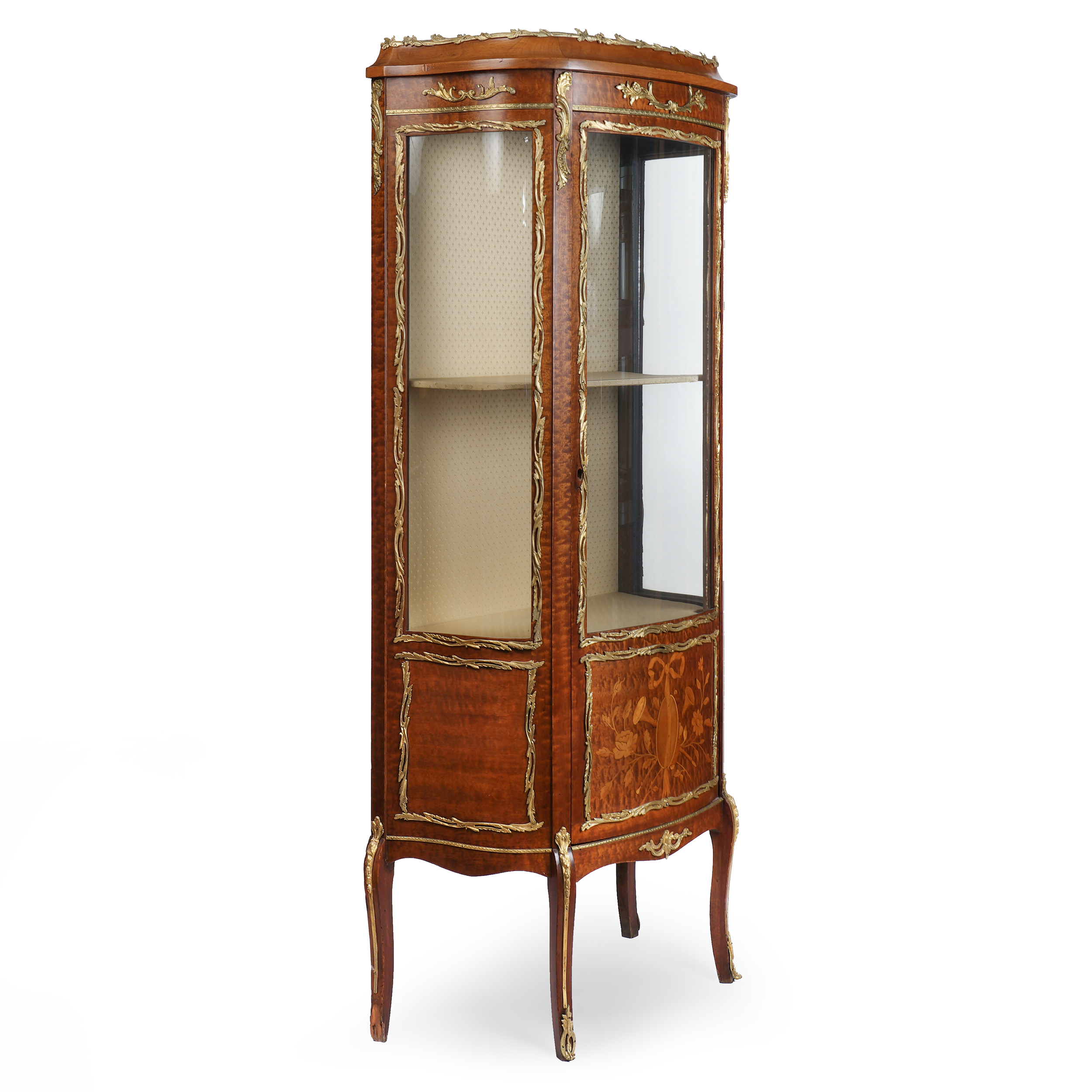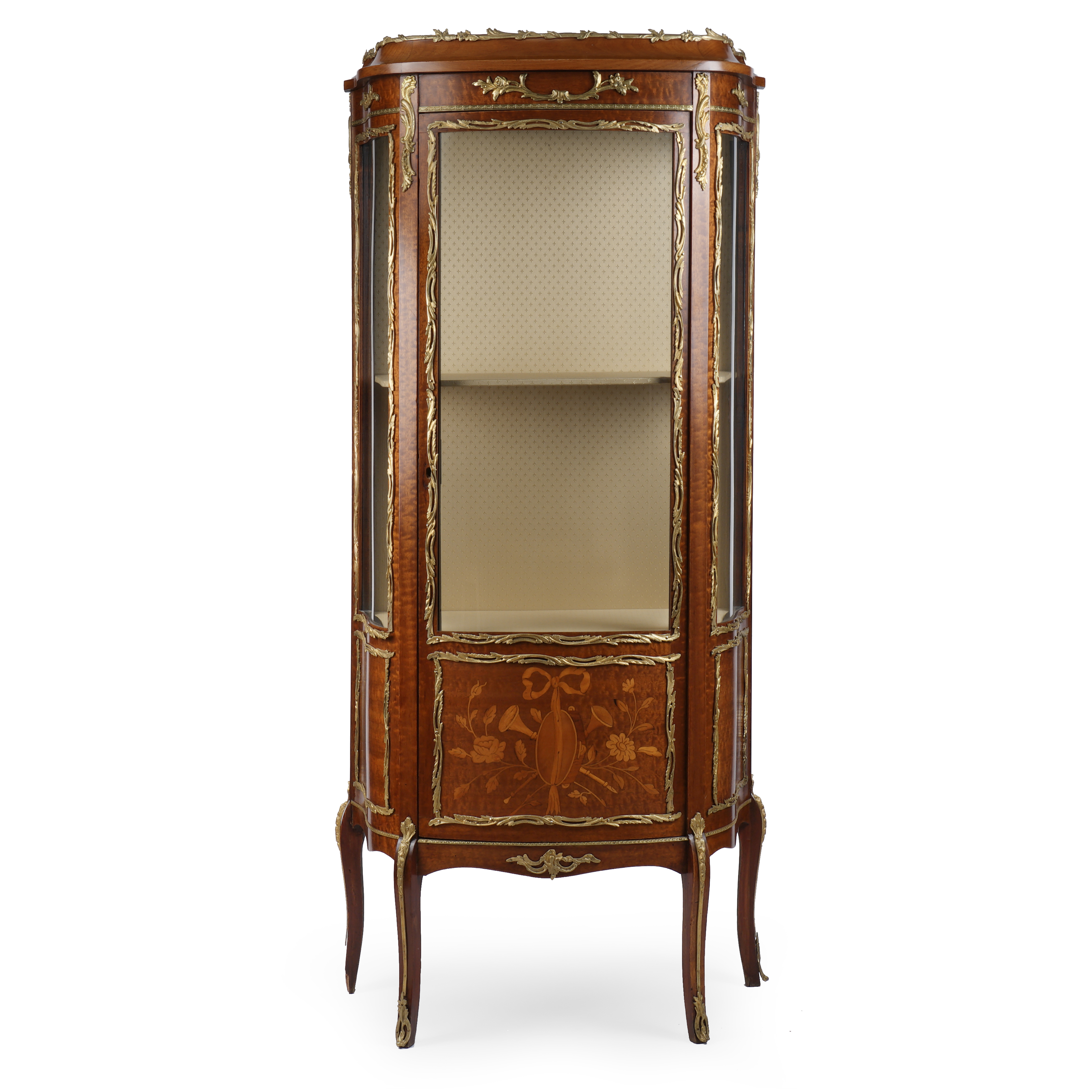 Витринный шкаф с ножками-кабриоль. Розовое дерево, маркетри, бронзовые элементы, стекло, Франция, XIX век, размер (в/ш/г) 147 х 63 х 28 см.