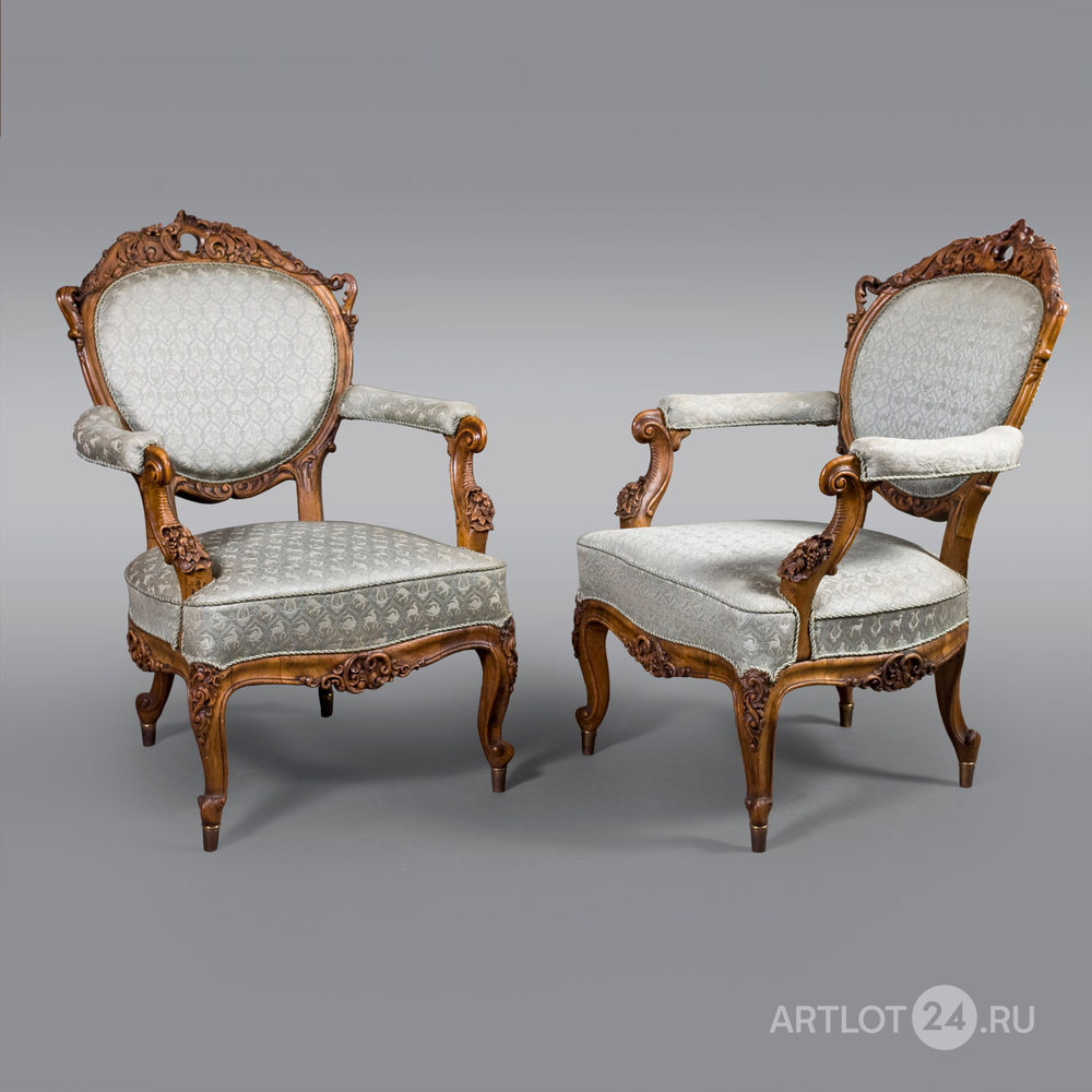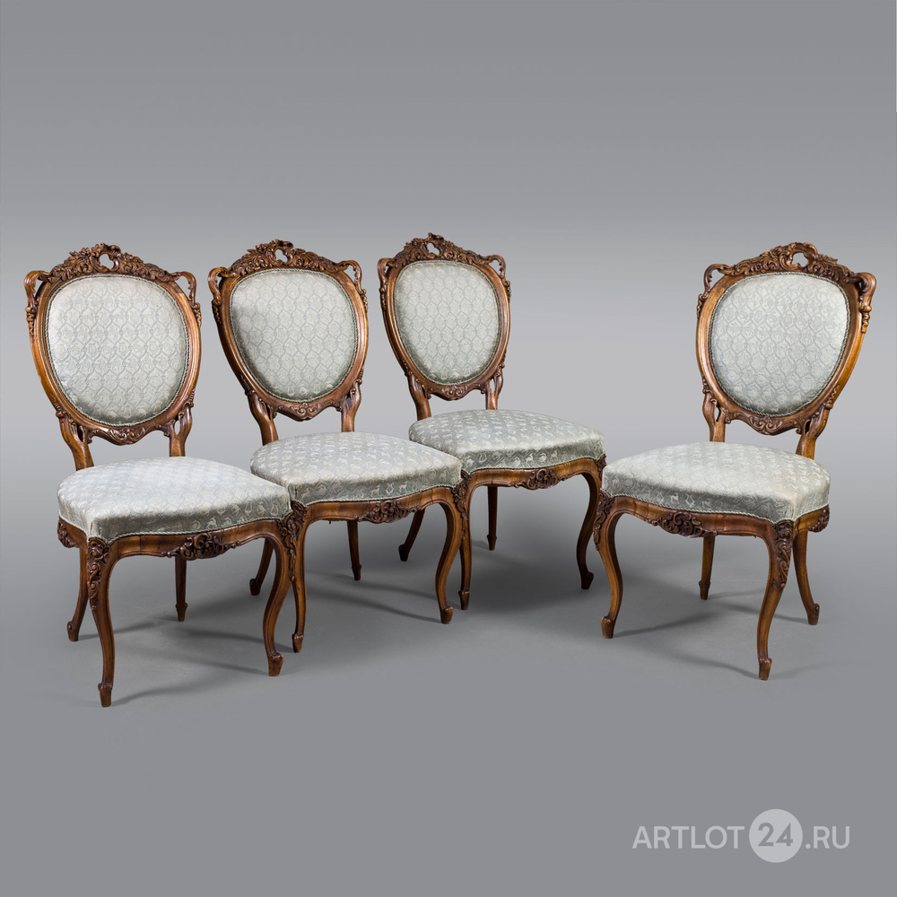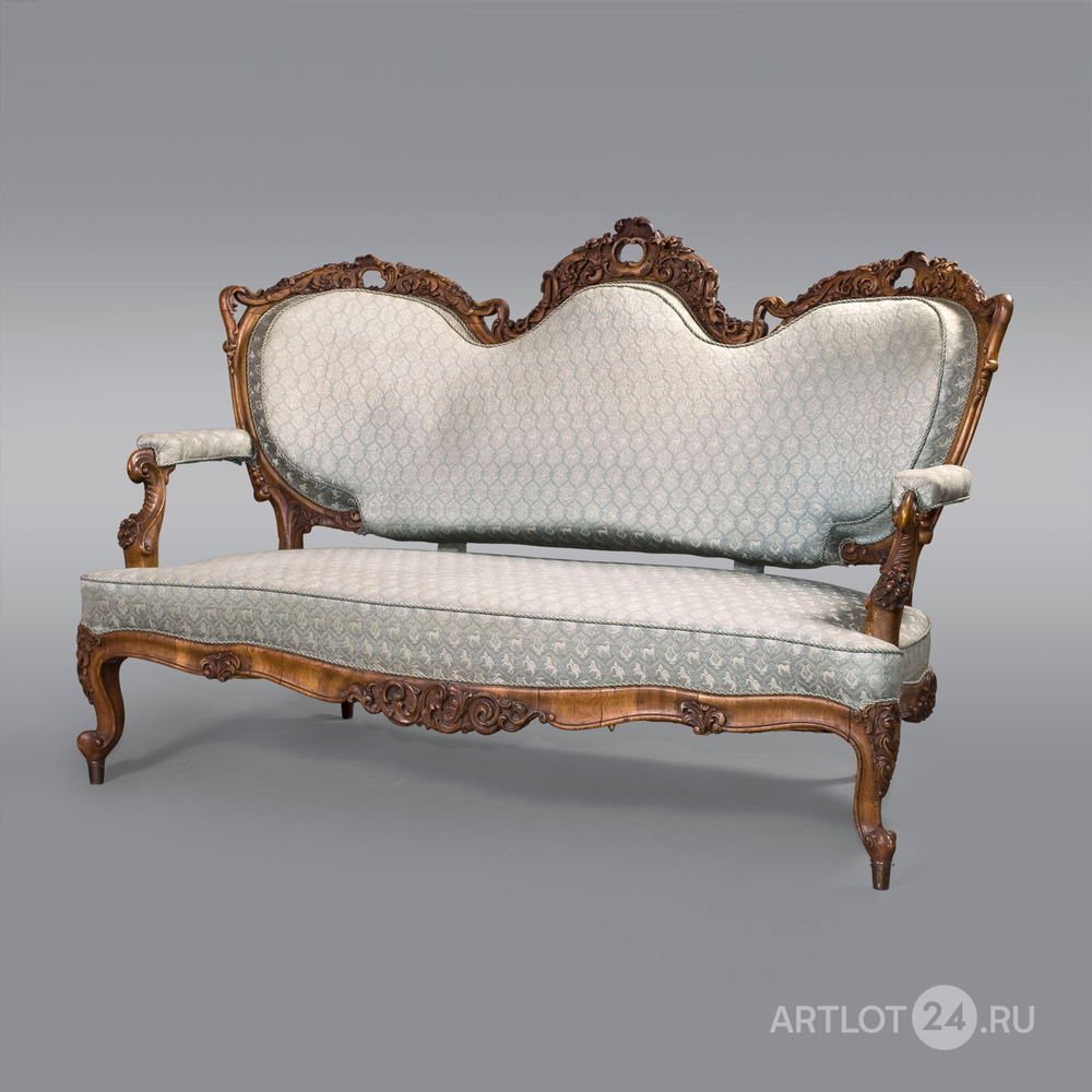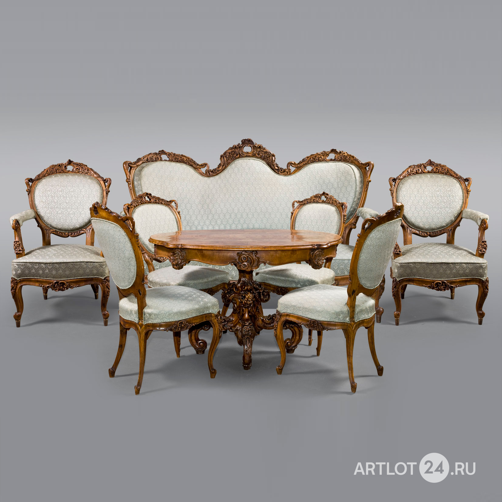 Диван, стол, два кресла и четыре стула. Орех (массив, шпонирование), фигурная резьба, Франция, середина XIX века; размеры (в/ш/г):