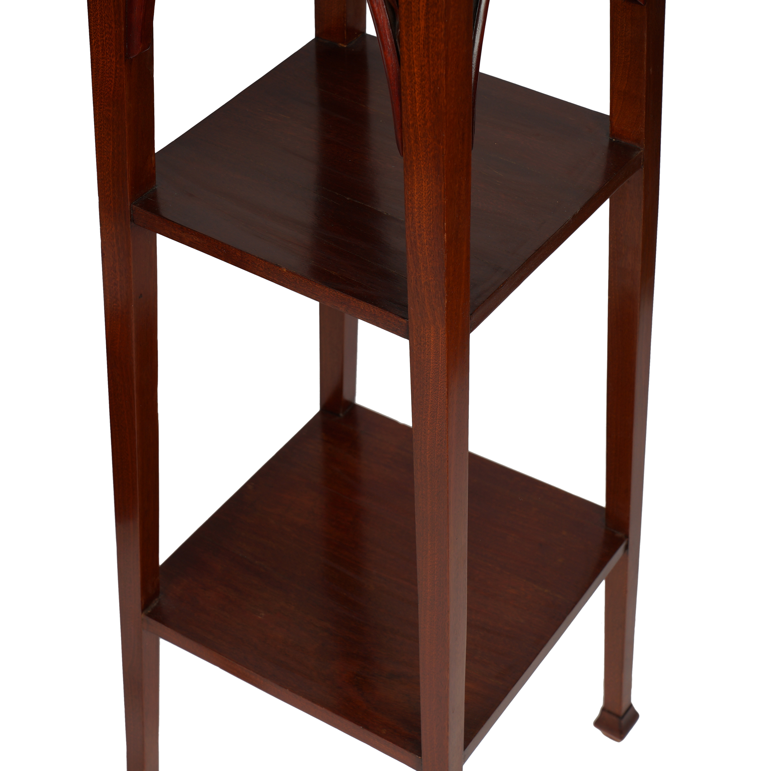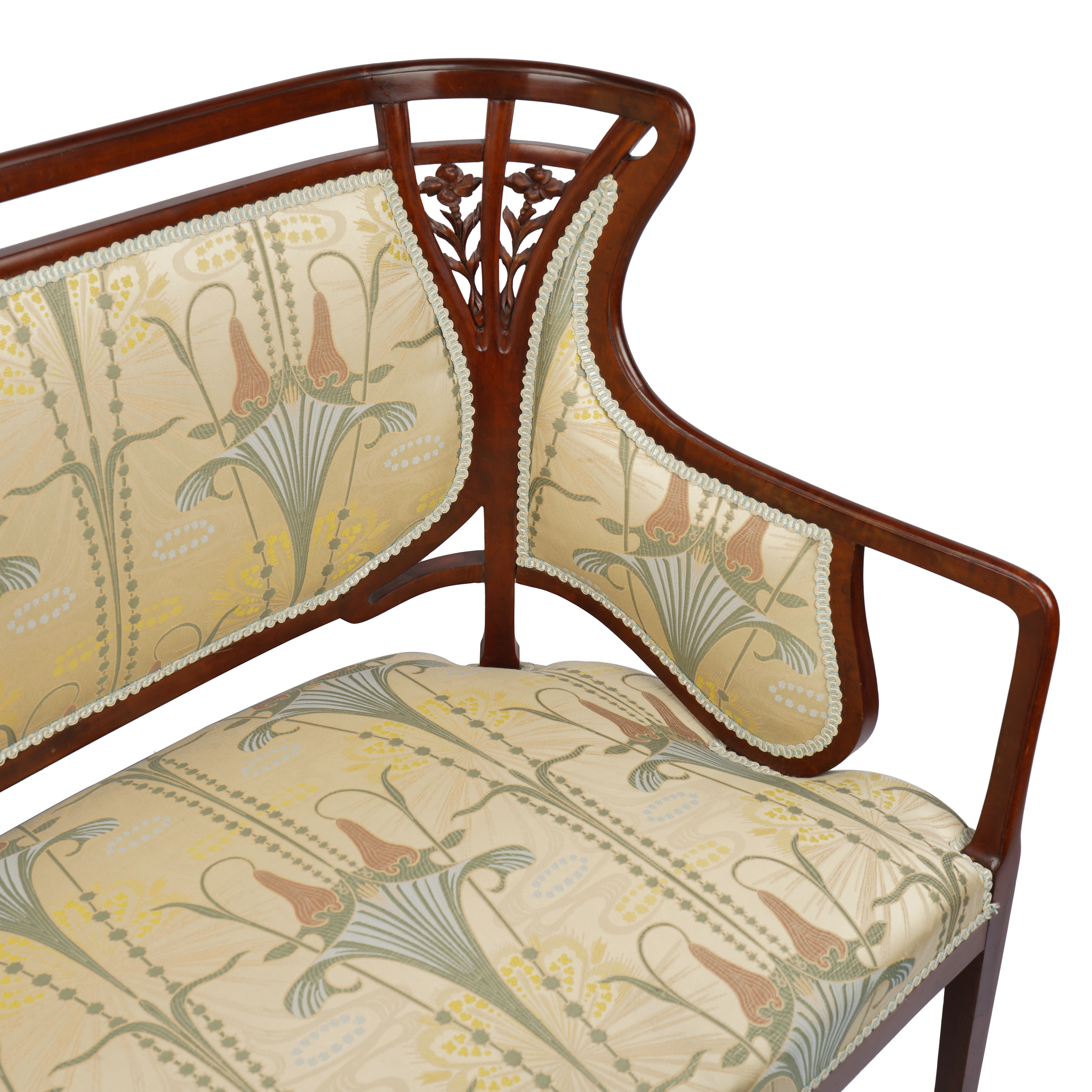 Мебельному гарнитуру присущи характерные черты как конкретно русского модерна, так и его общеевропейские черты. Это особые детали, вдохновленные миром живой природы, яркая стилизация, обтекаемые формы. Модерну свойственно использование дорогих материалов – так, здесь выбрано красное дерево, прекрасно подчеркивающее на контрасте нежность узоров на светлой обивке. Темный цвет породы заявляет о высоком статусе владельца, выделяясь не броским, но благородным оттенком.