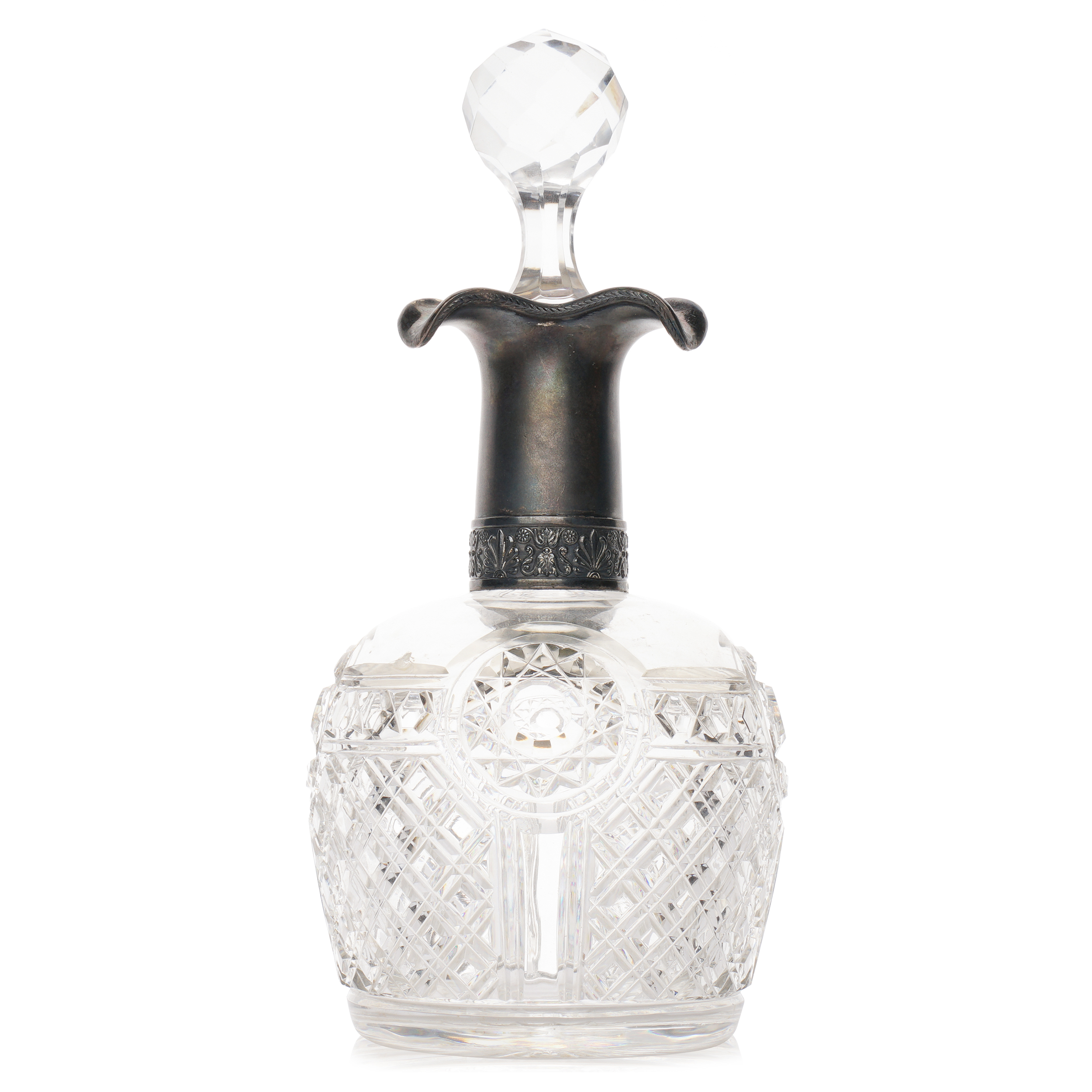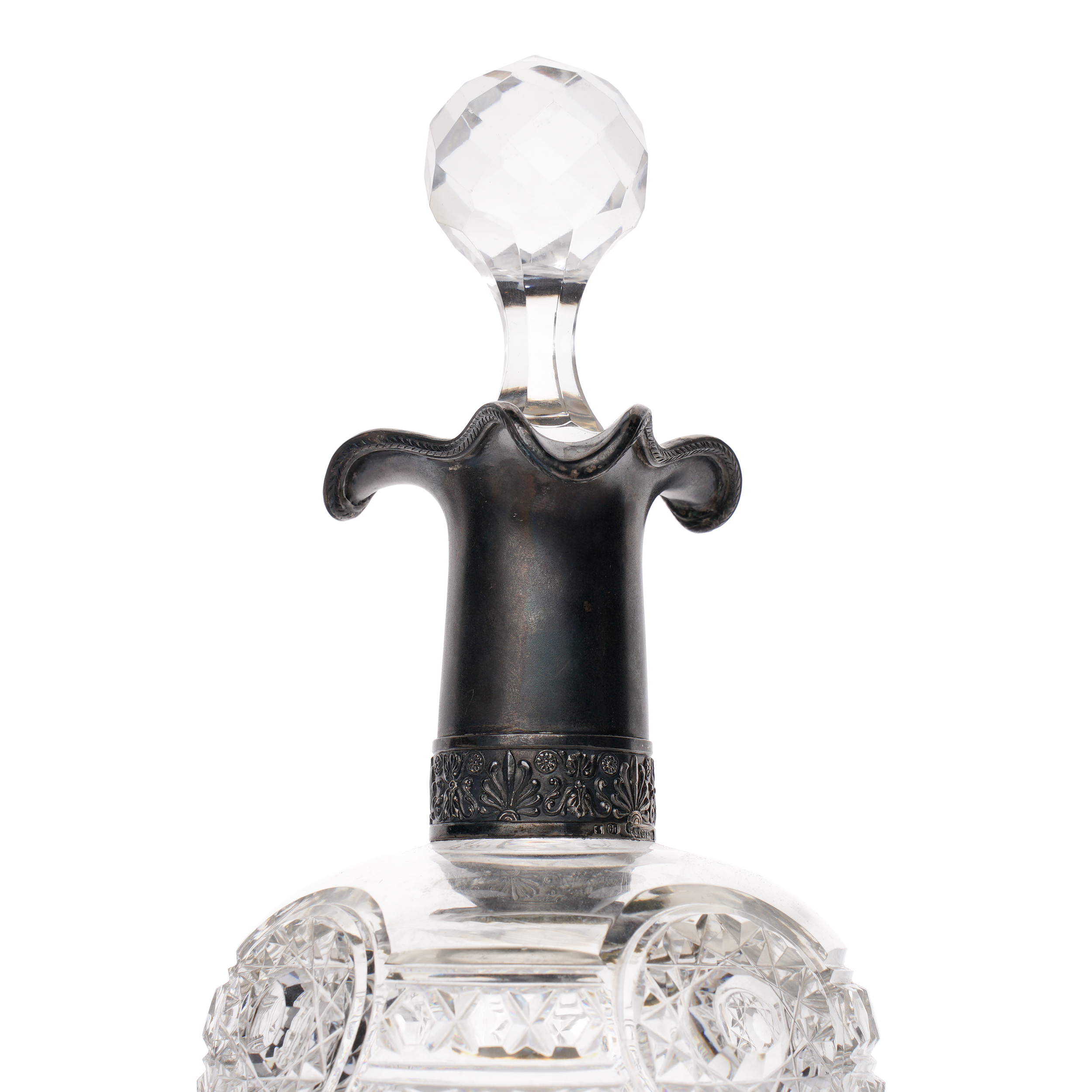 Хрусталь Баккара (предположительно), ручное гранение, шлифовка, серебро 84 пробы, чеканка, монтировка. Клейма: Клеймо «В.ГОРДОНЪ», именник мастера «СП», клеймо 84 Петербургского пробирного управления