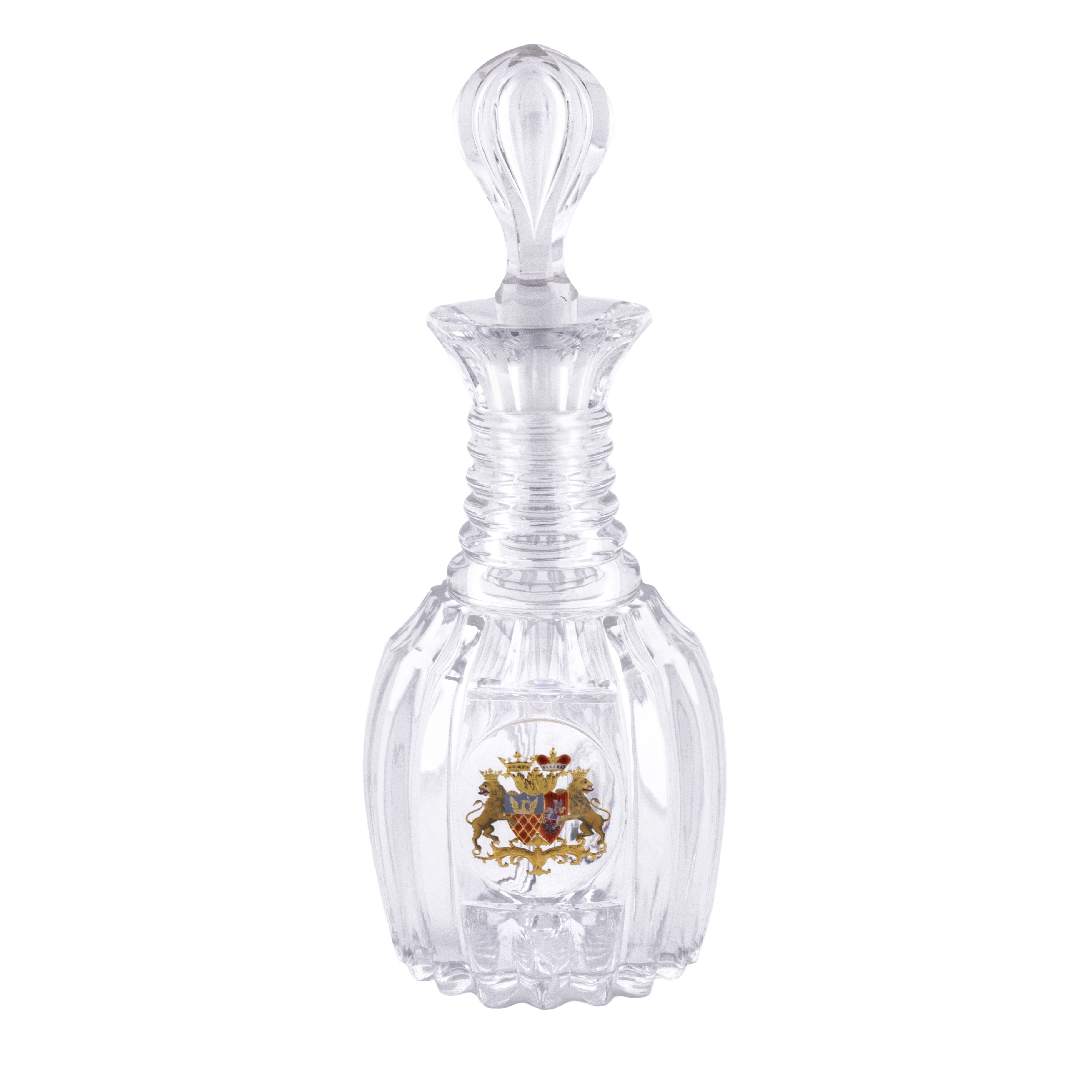 Бесцветный хрусталь, выдувание, шлифовка, гравировка, роспись полихромными эмалевыми красками между стенками «оптического» медальона, золочение. Россия, Санкт-Петербург, Императорский стеклянный завод, вторая треть XIX века, высота – 27 см (на горлышке выгравировано «2Д»).