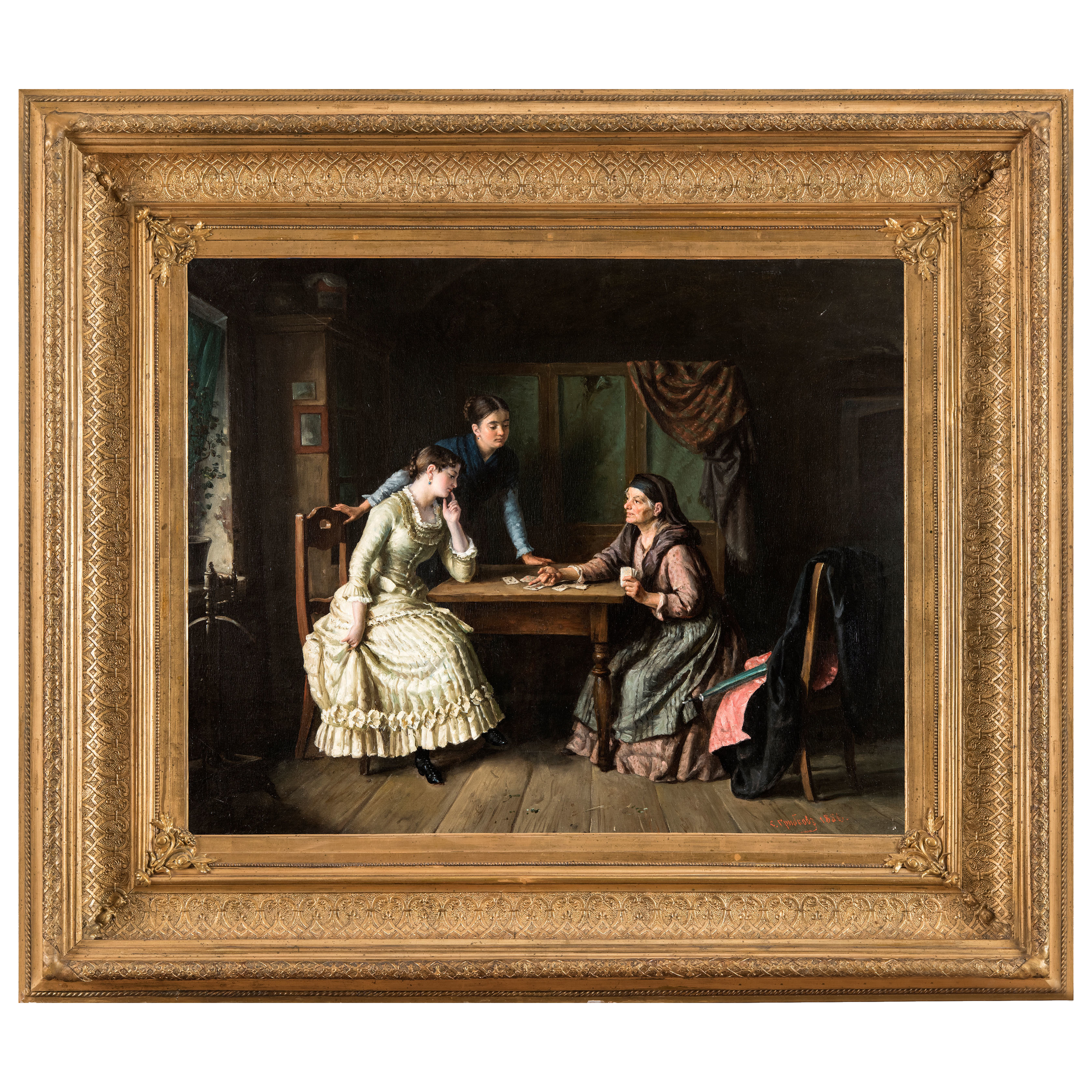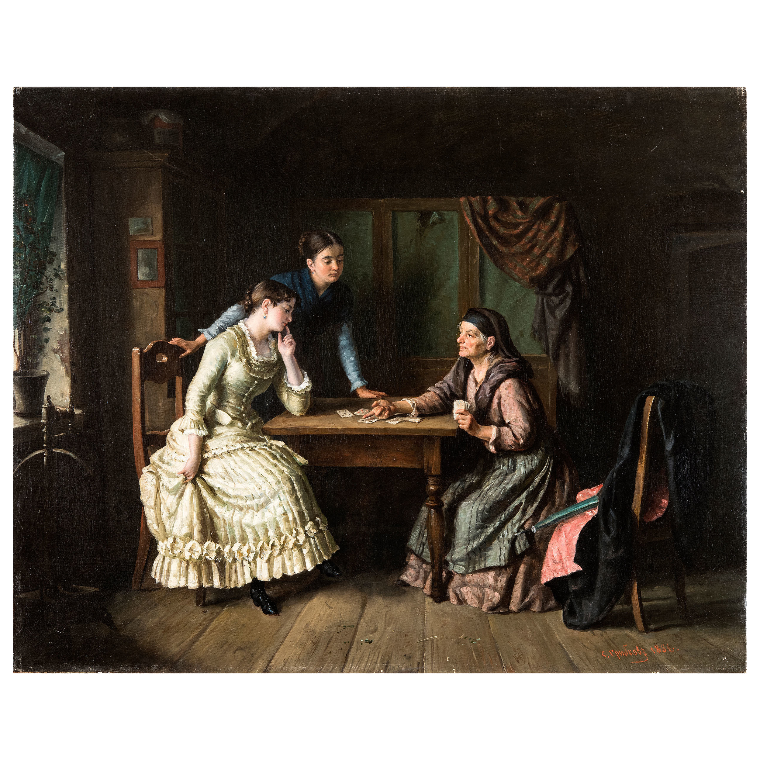 Картина «Гадание» в полной мере укладывается в канву творческого наследия Сергея Ивановича Грибкова, изображавшего быт крестьян, красоту русских обрядов и семейных традиций. Его произведения – это рассказы о жизни крестьян и купечества, о дворянских гнездах. Сюжет картины разворачивается вокруг мистического действа - гадалка предсказывает судьбу молодой девушки, переживающей за возможное скорое замужество и будущее в целом. Тщательно проработанные детали интерьера, одежд и характерных лиц говорят о следовании Грибковым передвижнических течений в искусстве.