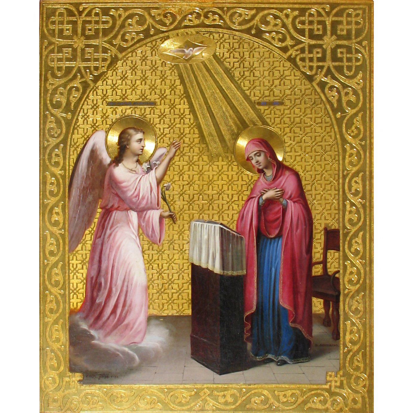 Дерево, левкас, чеканка по вызолоченному левкасу, темпера, сусальное золото, в нижнем левом углу подпись мастера-живописца: «Н. Лихушинъ. 1886 год, С.П.Б», 1886 год, размер: 39,5 х 32 см.