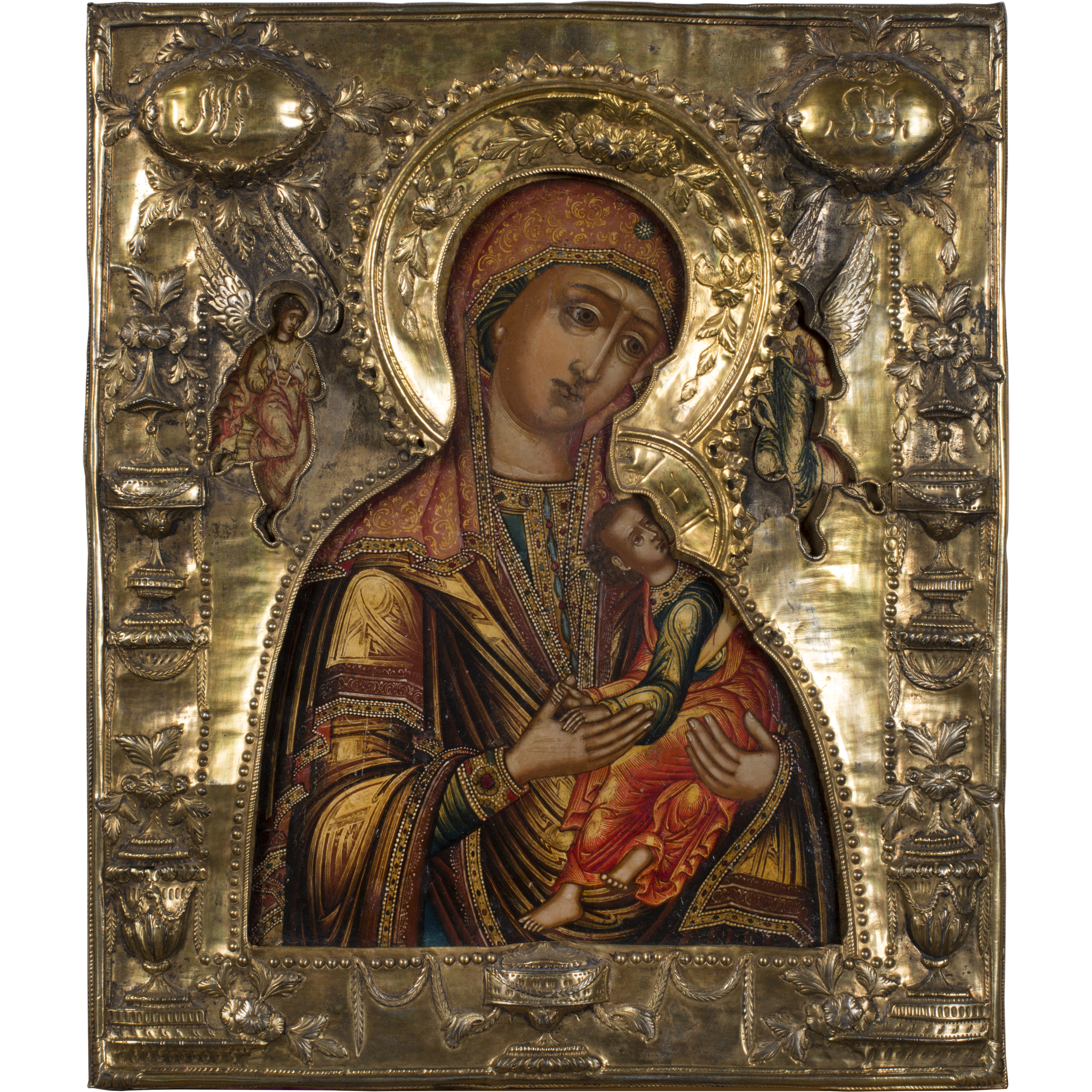 Дерево, врезные торцевые шпонки, левкас, темпера золоченый серебряный оклад (штамп, чеканка, сканый орнамент), на окладе декоративные элементы с «MP» и «ΘΥ» - «Матерь Бога» в верхней части по обе стороны от изображения;