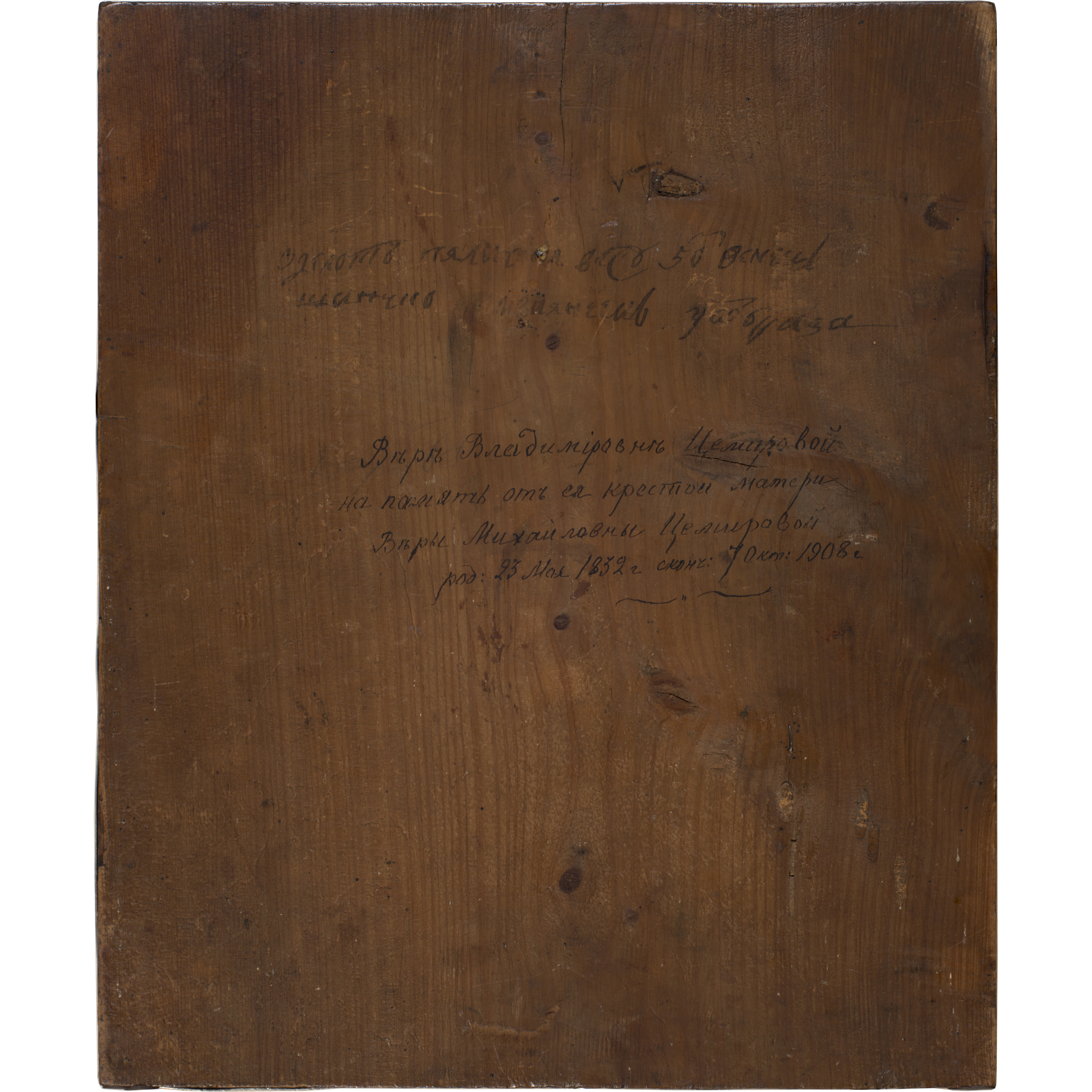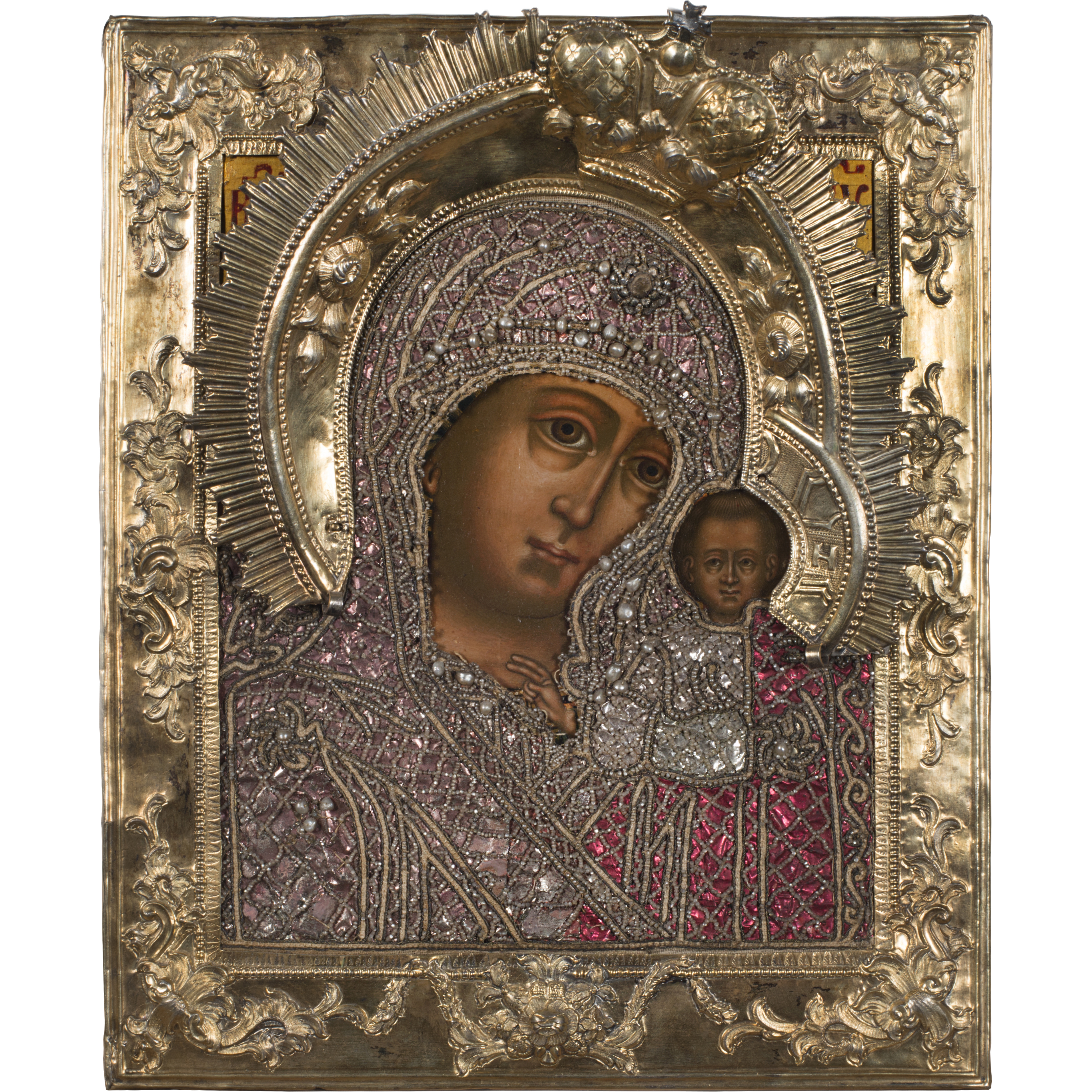 Дерево, левкас, темпера, золоченая серебряная рама оклада с венцом (штамп, чеканка, гравировка), риза вышита речным жемчугом, подсвеченным разноцветной фольгой;