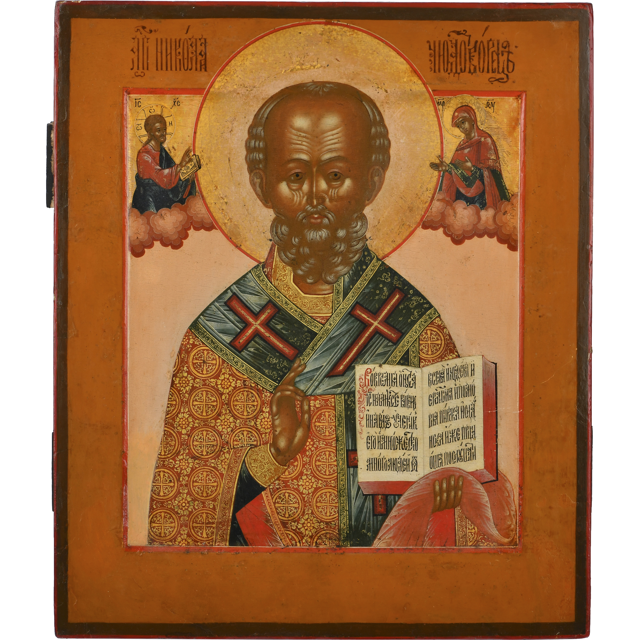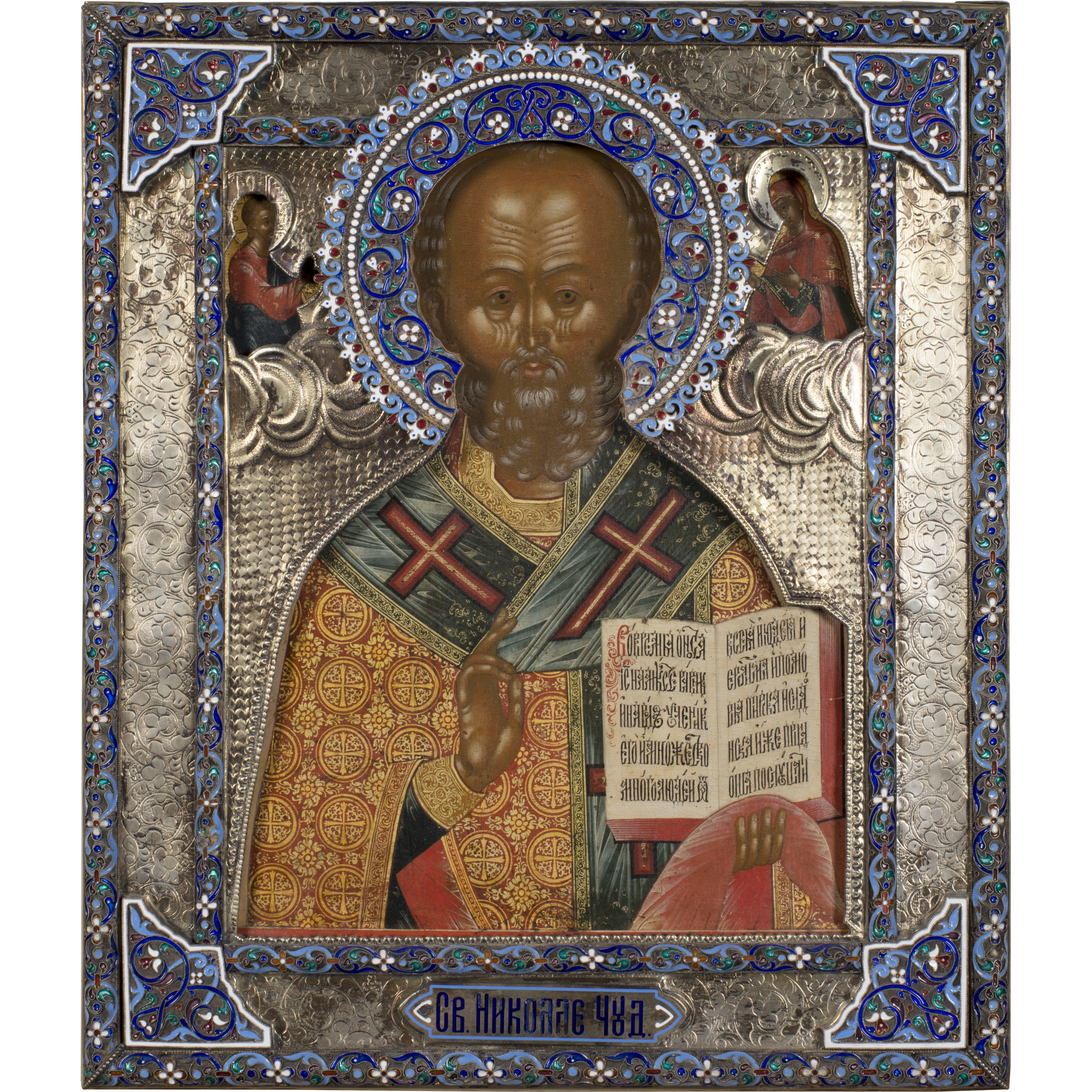 Дерево, врезные сквозные фигурные шпонки, левкас, темпера, золочение; серебряный оклад, украшенный растительным орнаментом в техниках чеканки, штихельной резьбы и полихромных перегородчатых эмалей; на наугольниках эмаль по оброну (выпуклой поверхности); на венце «84» проба, на шильдике, а также на частях оклада клейма «И.Т» в прямоугольных щитках.