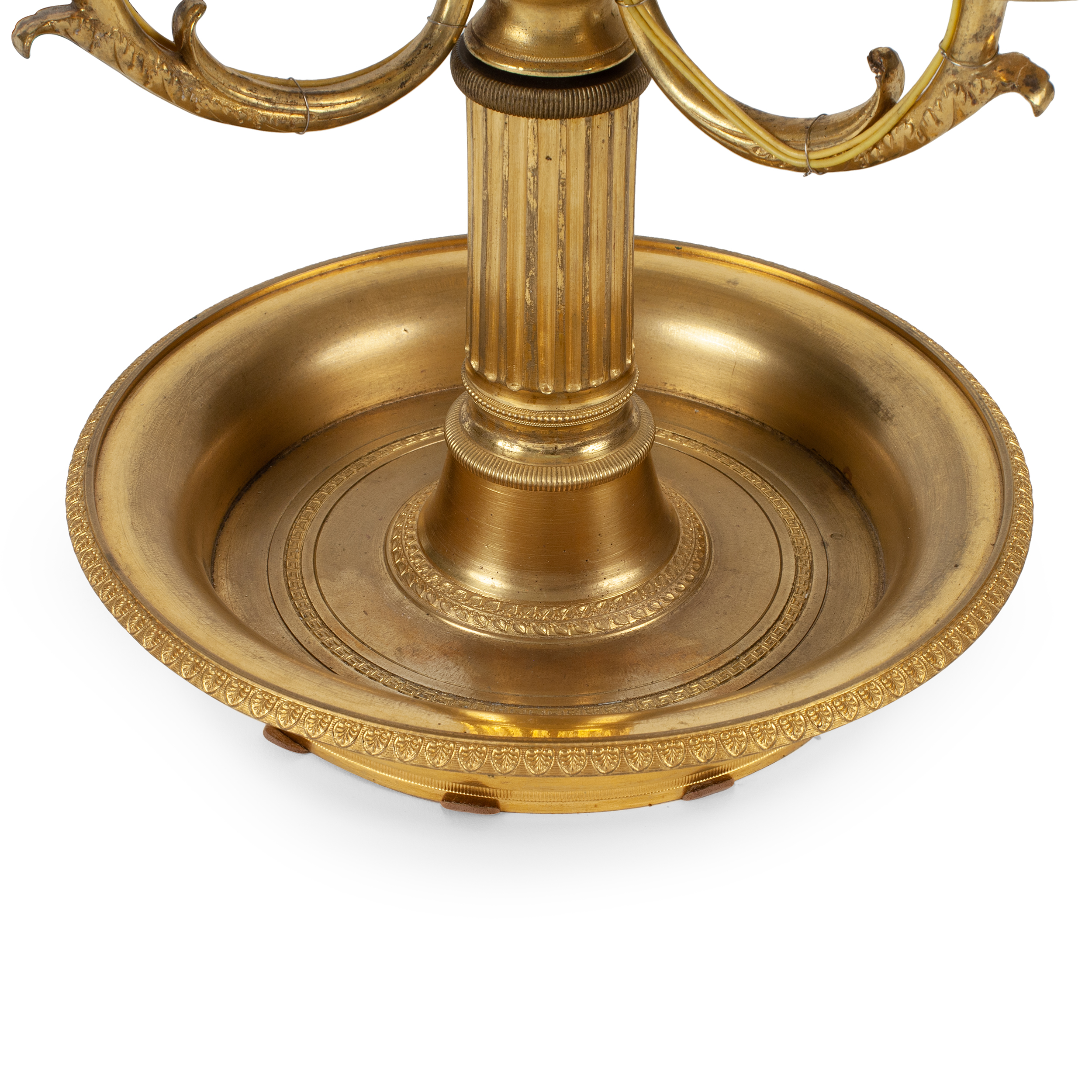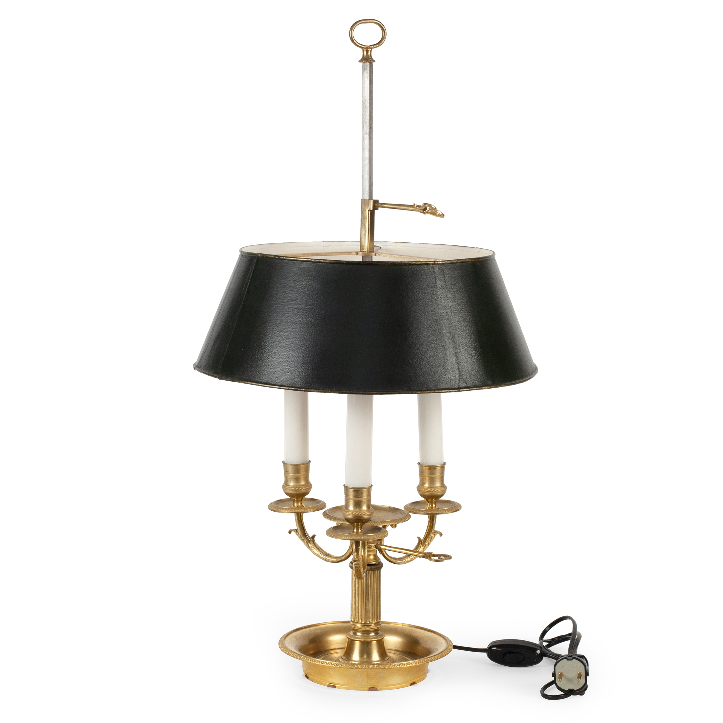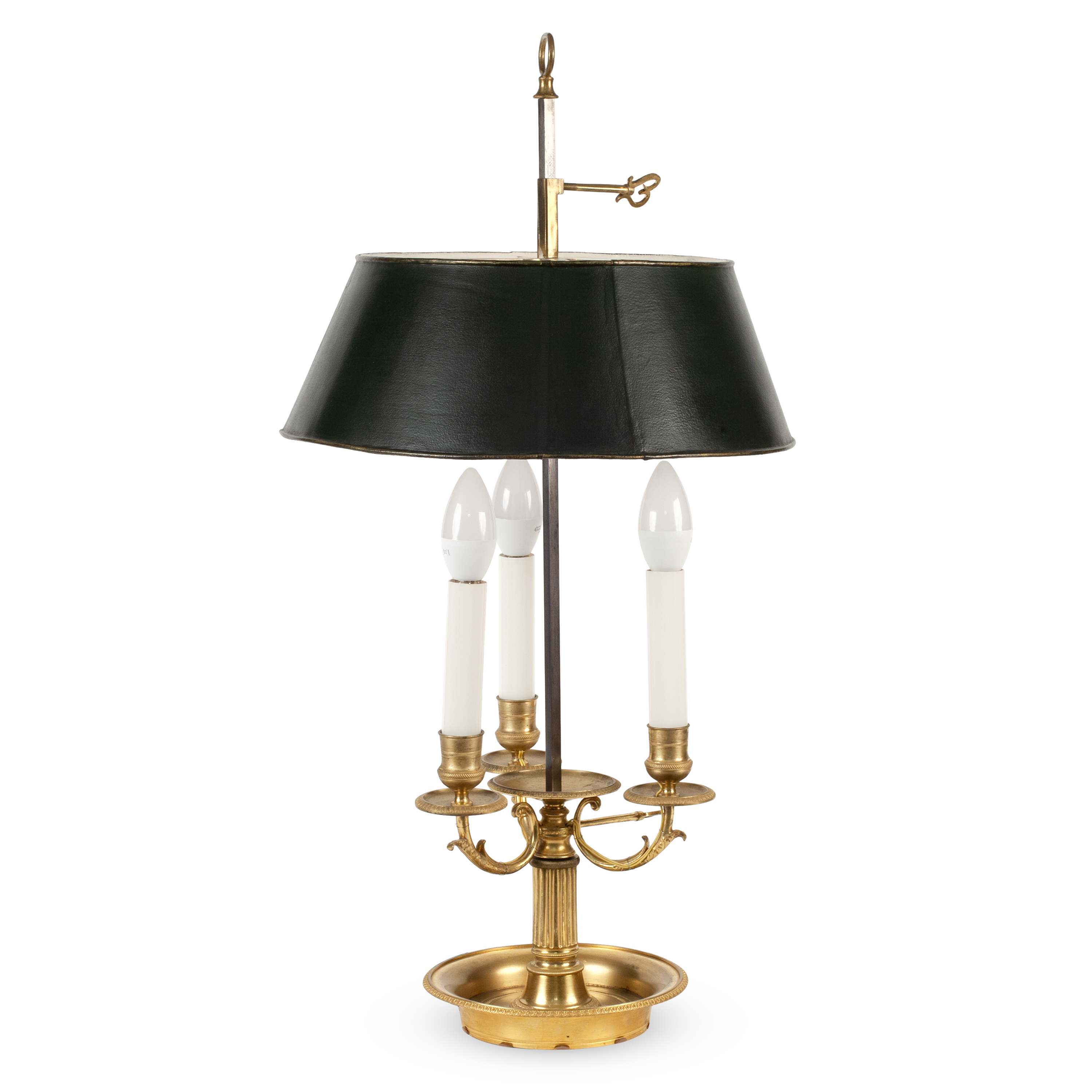 Лампа-бульотка или «буилло» для карточных игр с механизмом регулировки высоты абажура. Бронза, литье, чеканка, металлический абажур, зеленая окраска, на 3 светоточки, Западная Европа, начало ХIХ века, высота - 65 см, диаметр основания – 17см