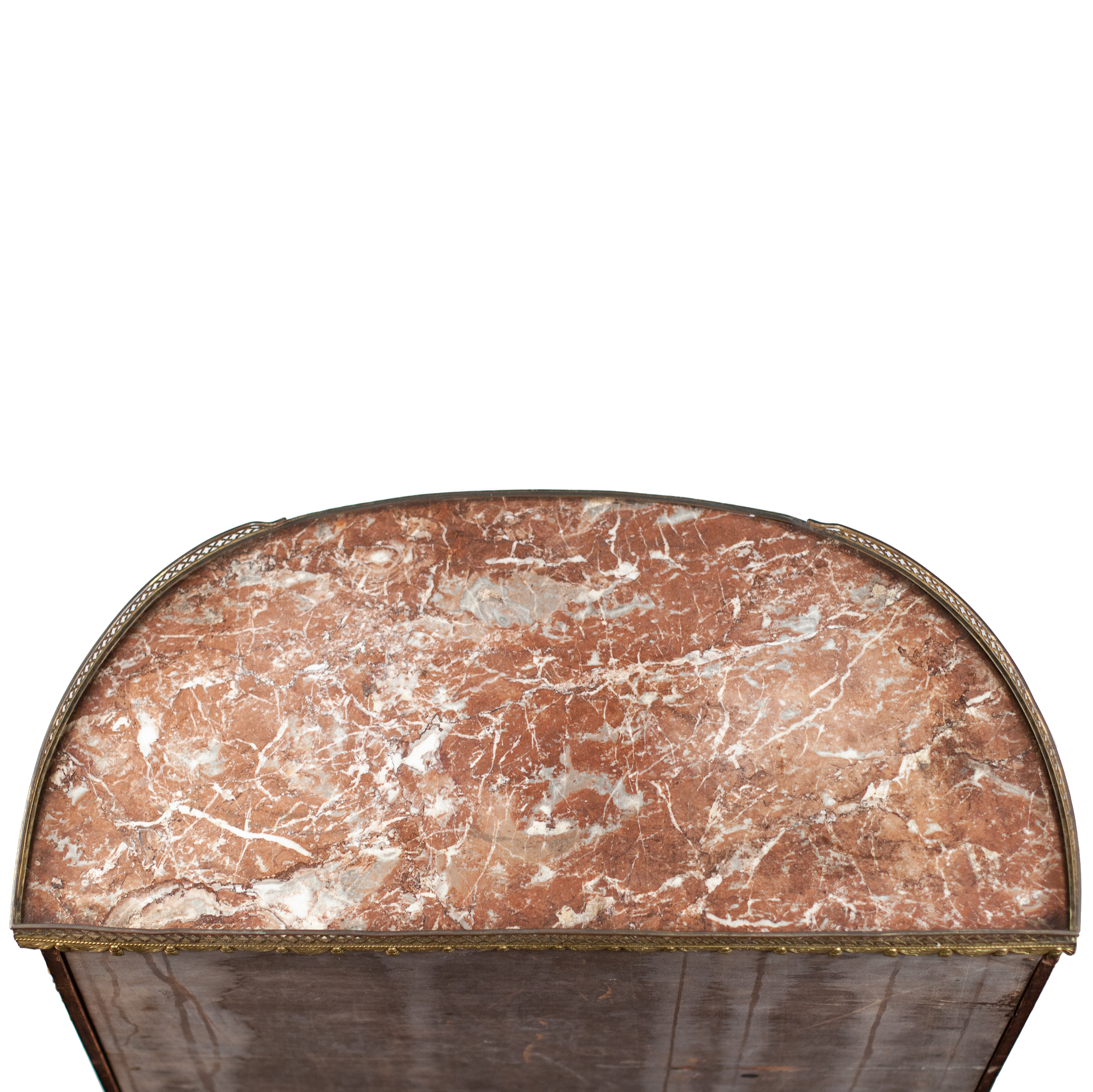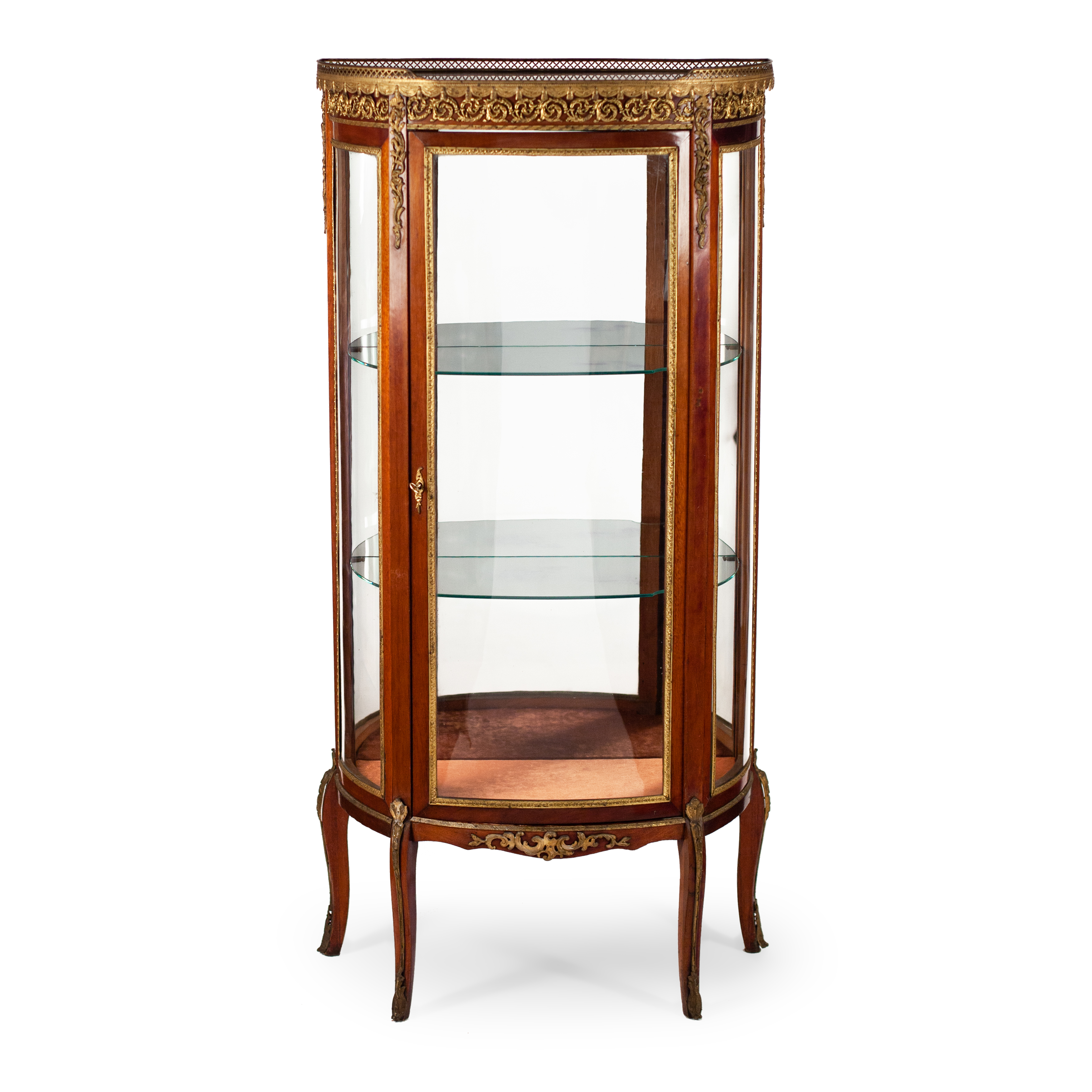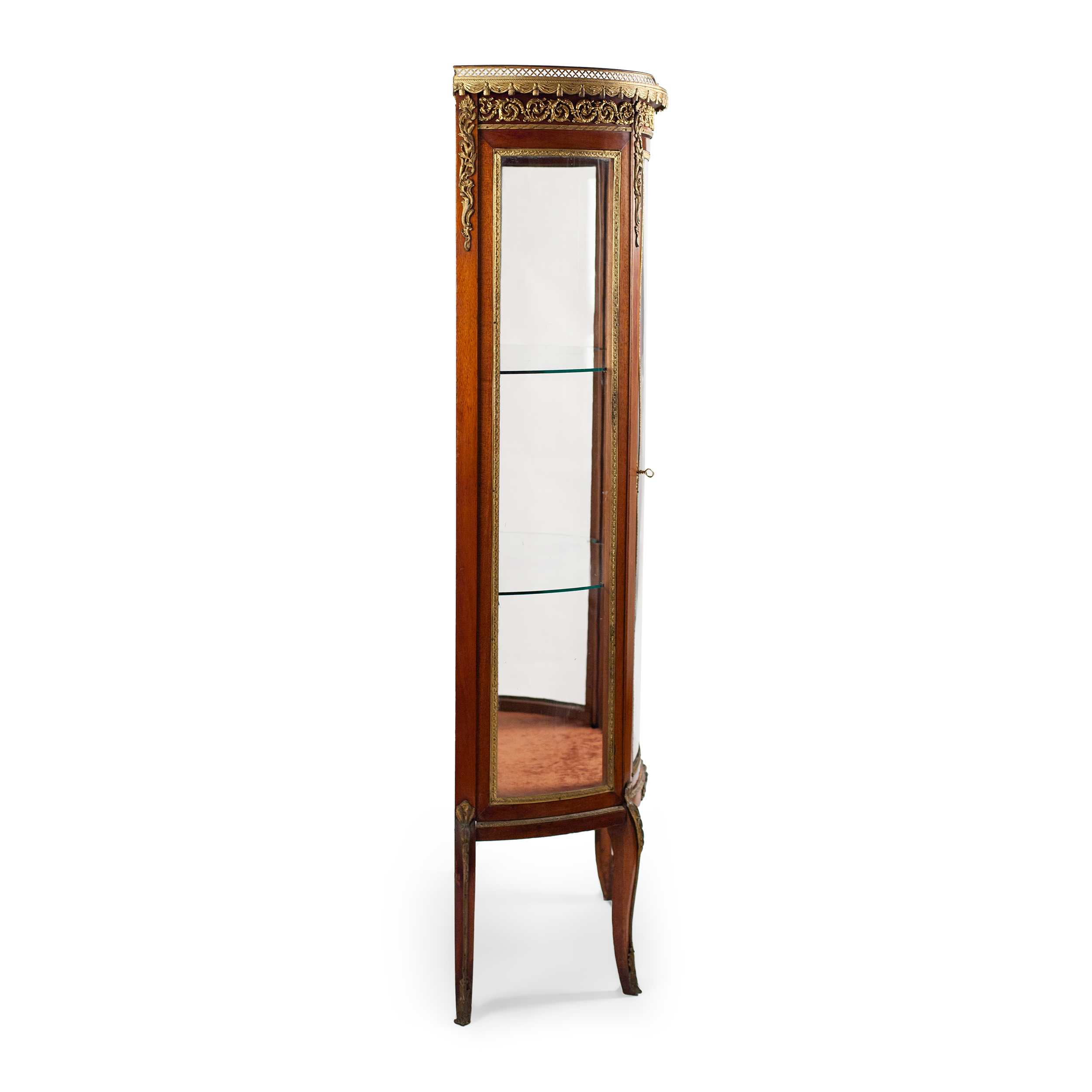 Дерево, шпонирование, бронзовые фигурные накладки, гнутое оригинальное стекло. Фасадная дверца и боковины застеклены.