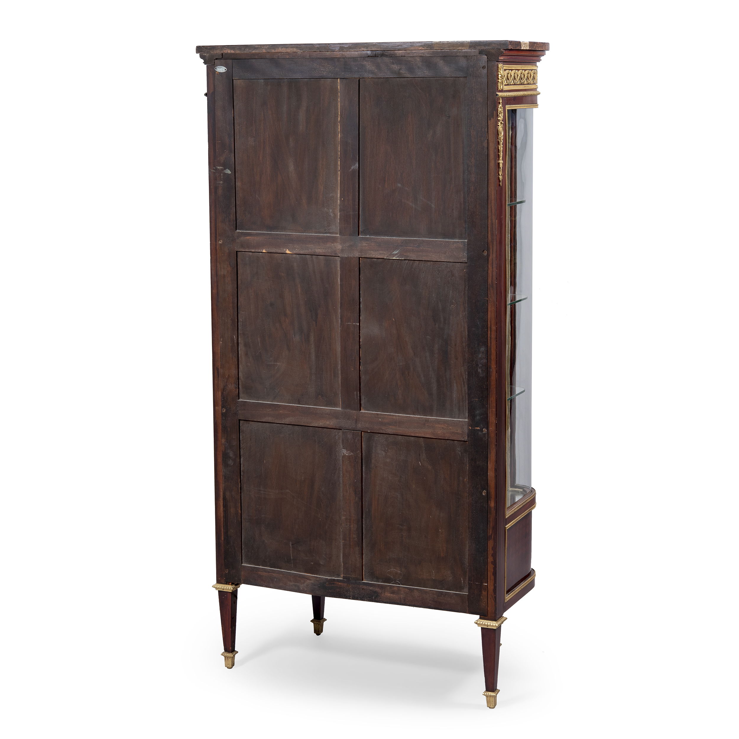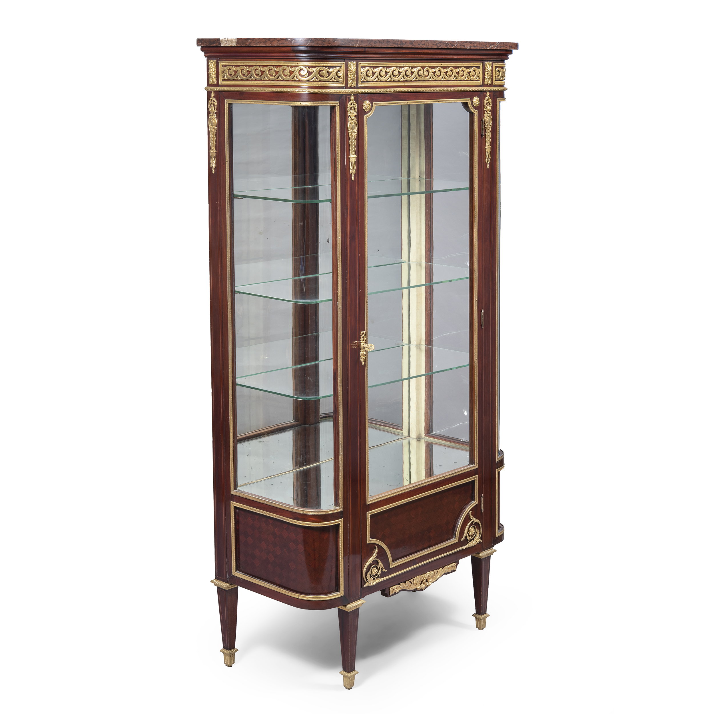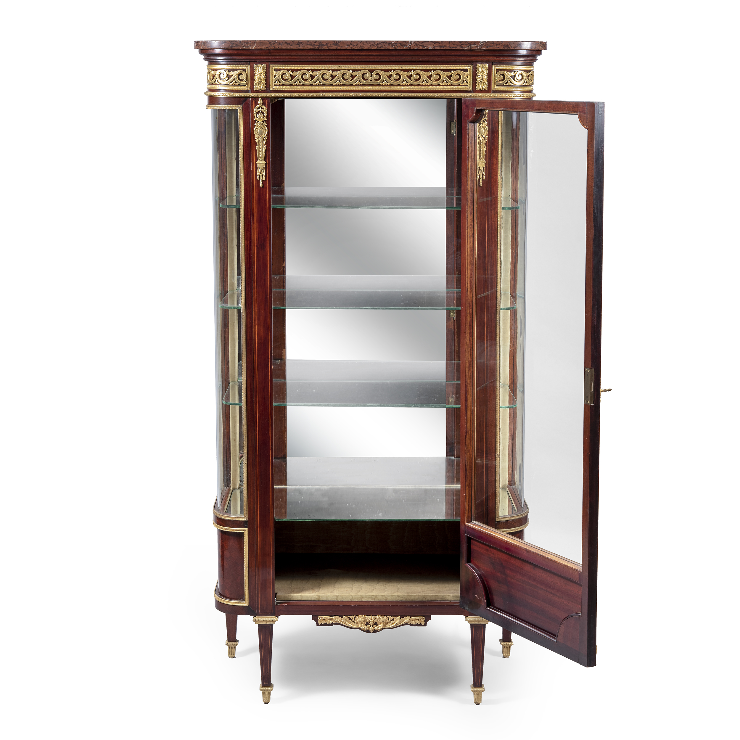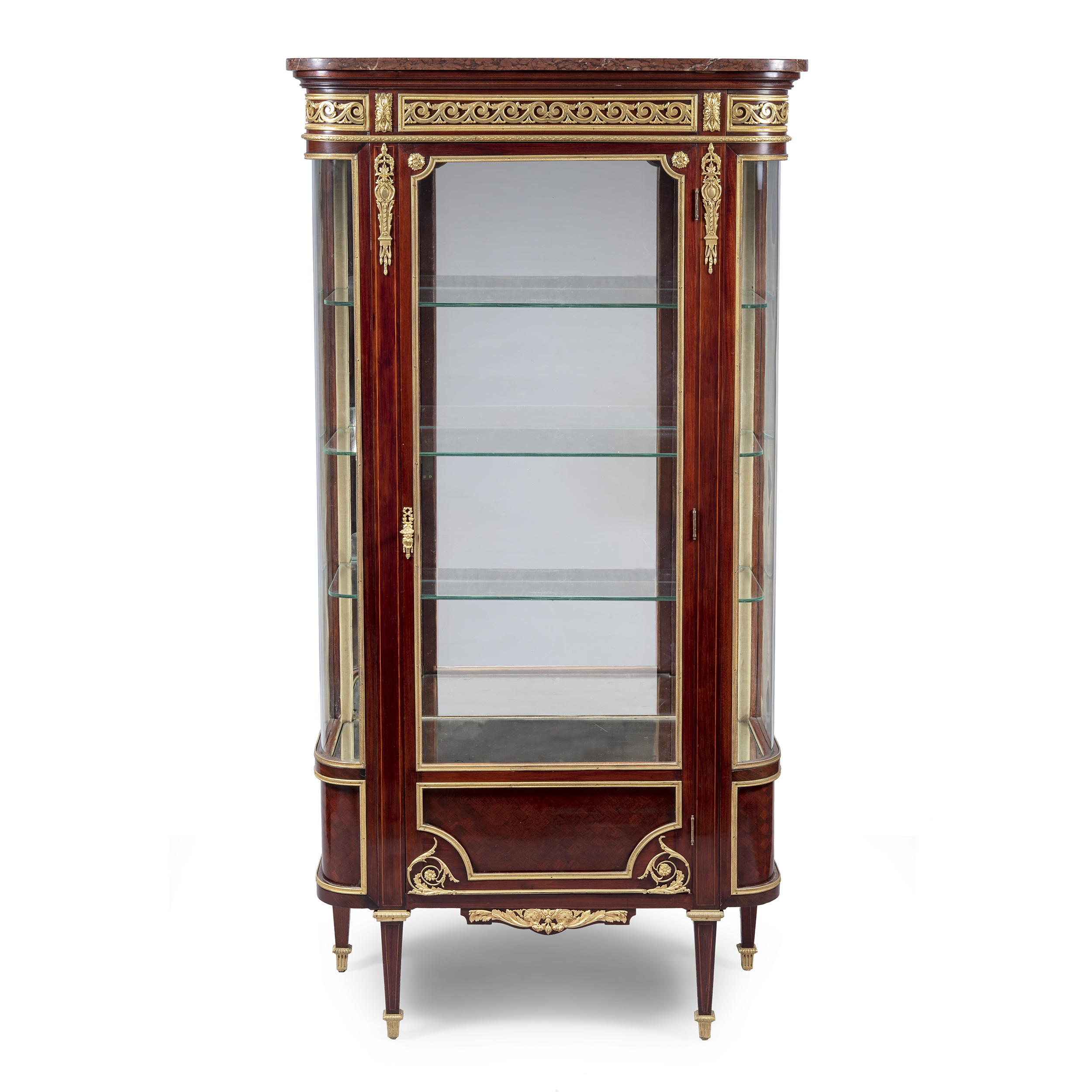 Горка витрина выполнена в манере французских краснодеревщиков эпохи Наполеона III. Хвойные породы (основа), фанеровка красным деревом, полировка, резьба, фигурные декоративные накладки золоченой бронзы, чеканка, мрамор, зеркальное стекло, стекло, Франция, XIX век, размеры(в/ш/г): 169 х 86 х 41 см.