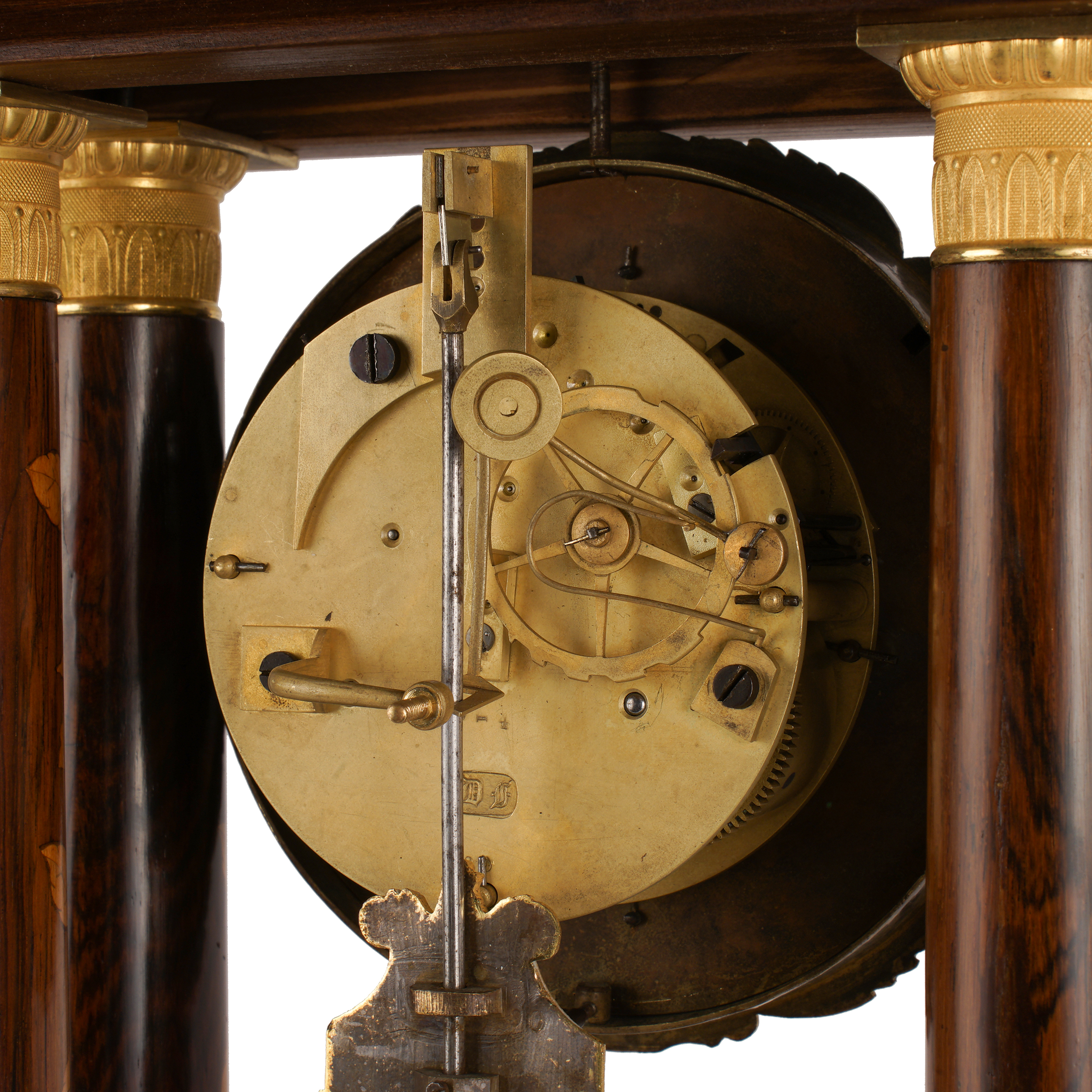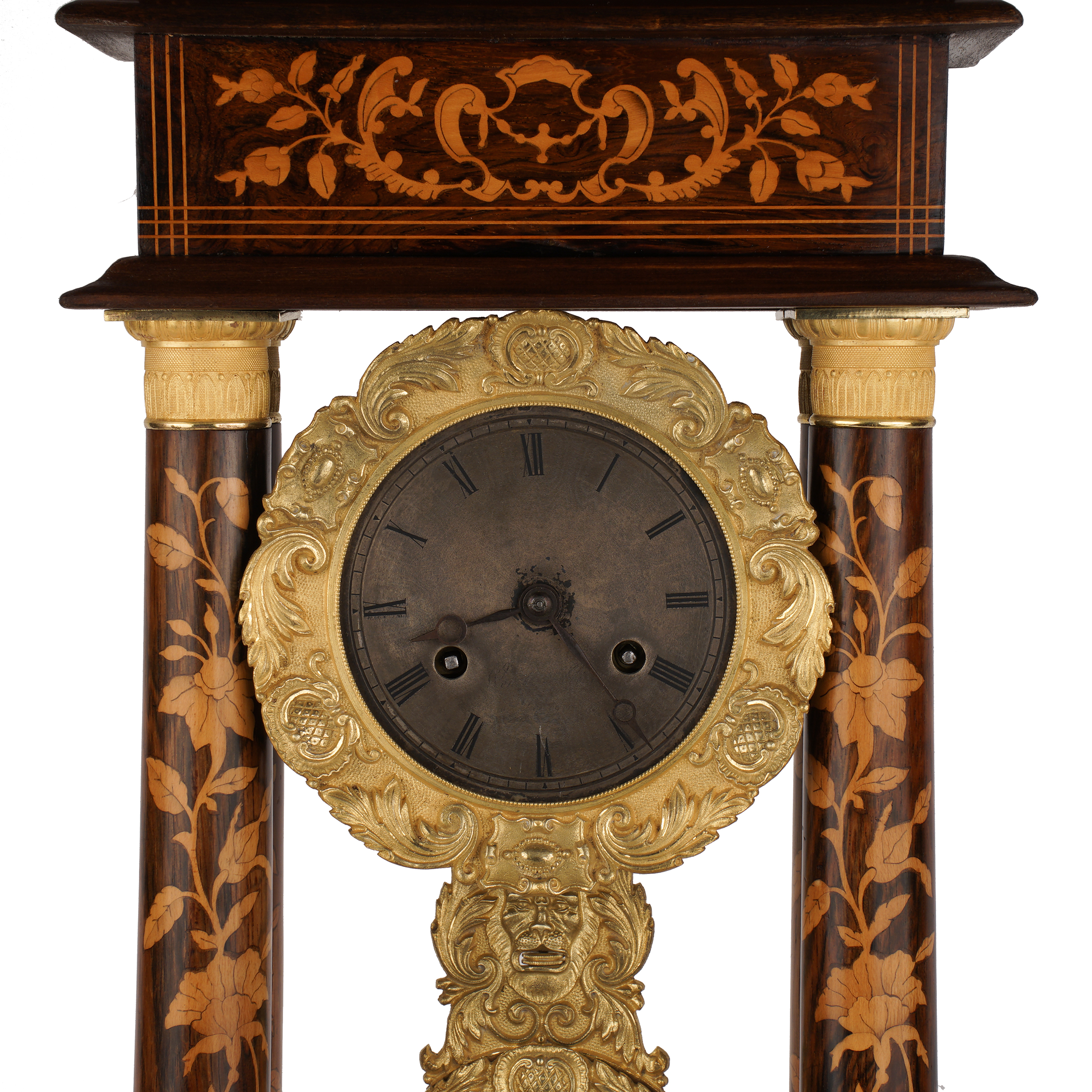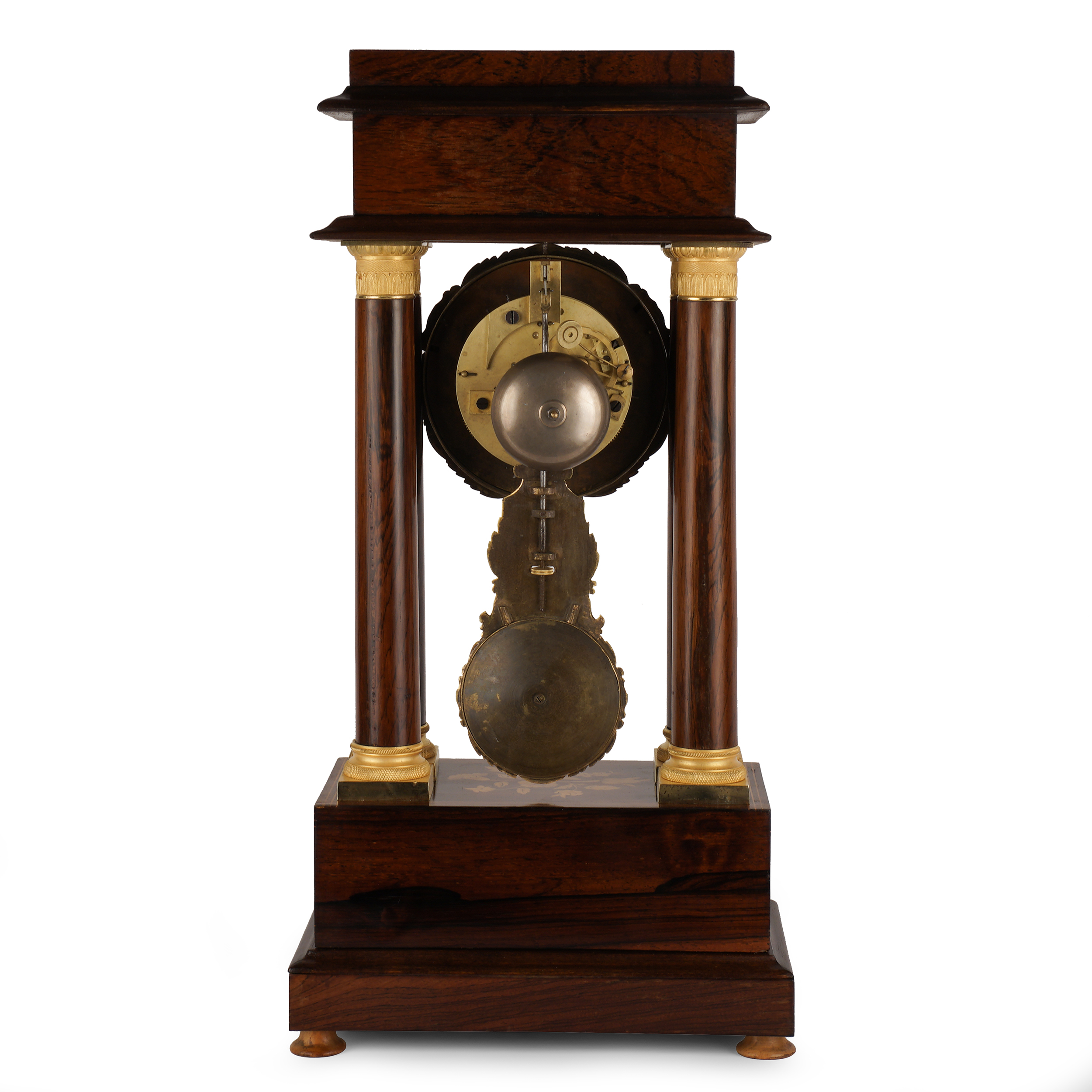 В виде четырех колонн с капителями. Палисандр, тонированное дерево, маркетри, бронза, литье, чеканка, золочение, латунь, печатное клеймо на механизме "DI" и номера "714", "6/9". Франция, конец ХIХ века, размеры (в/ш/г): 46,5 х 26 х 14,5 см