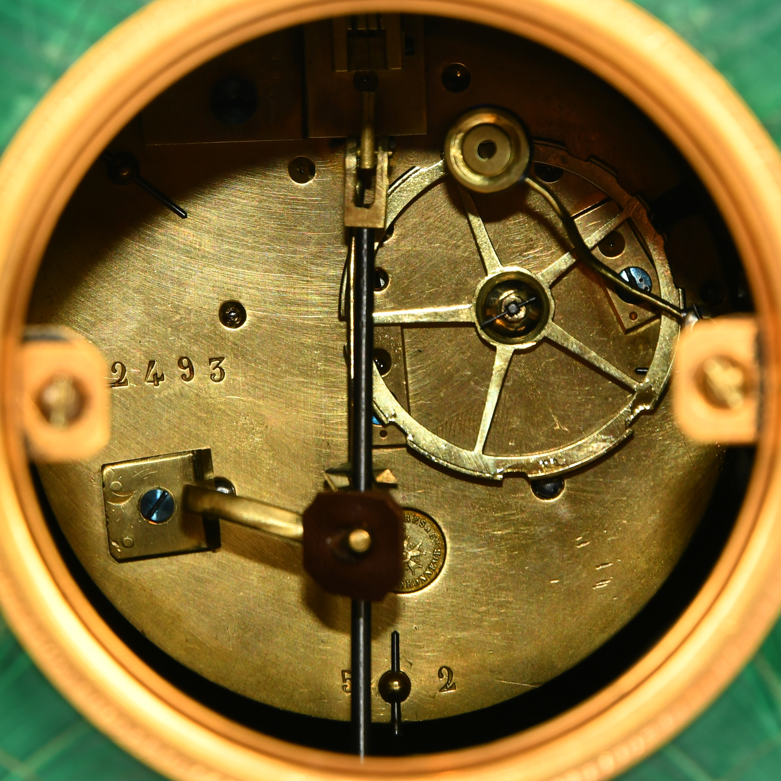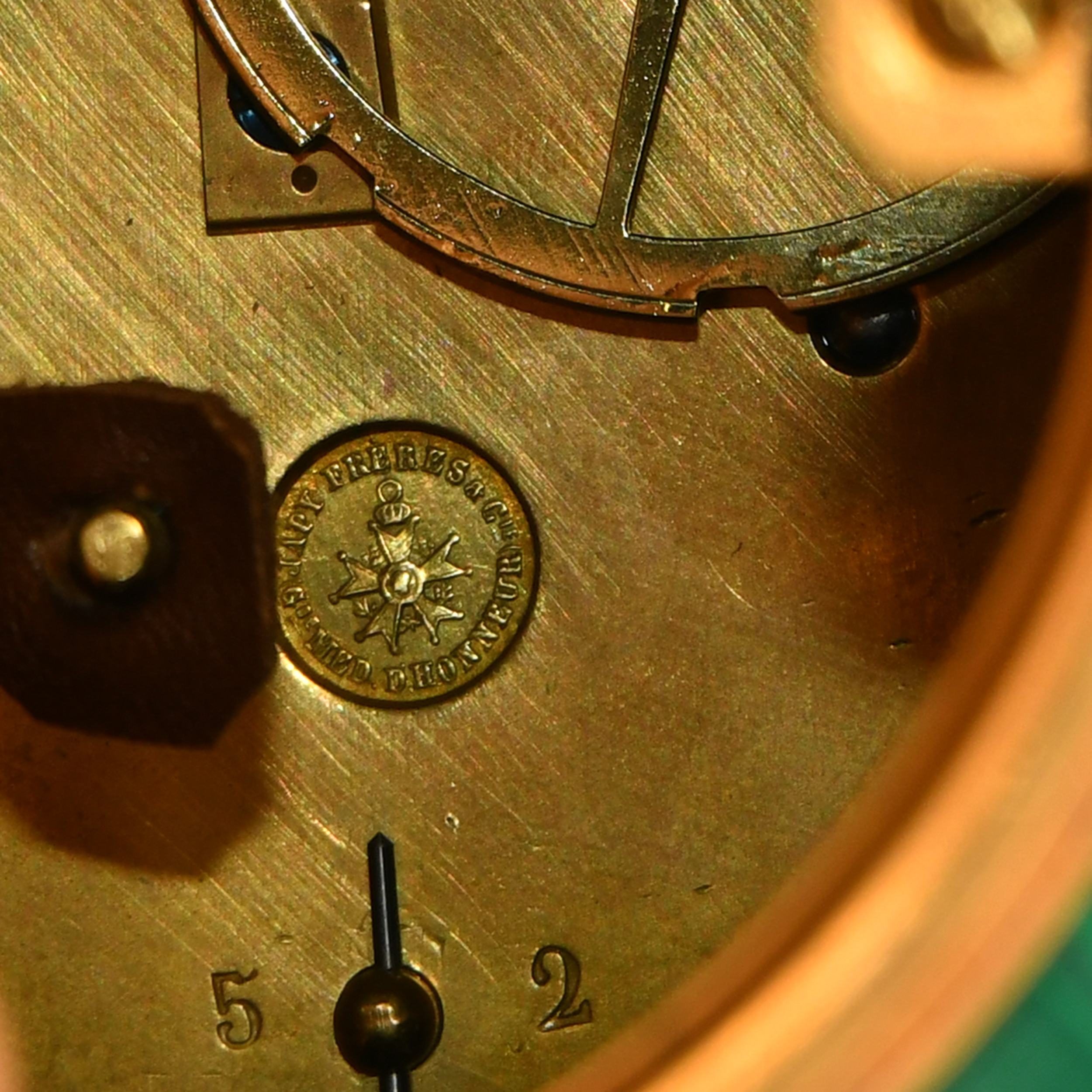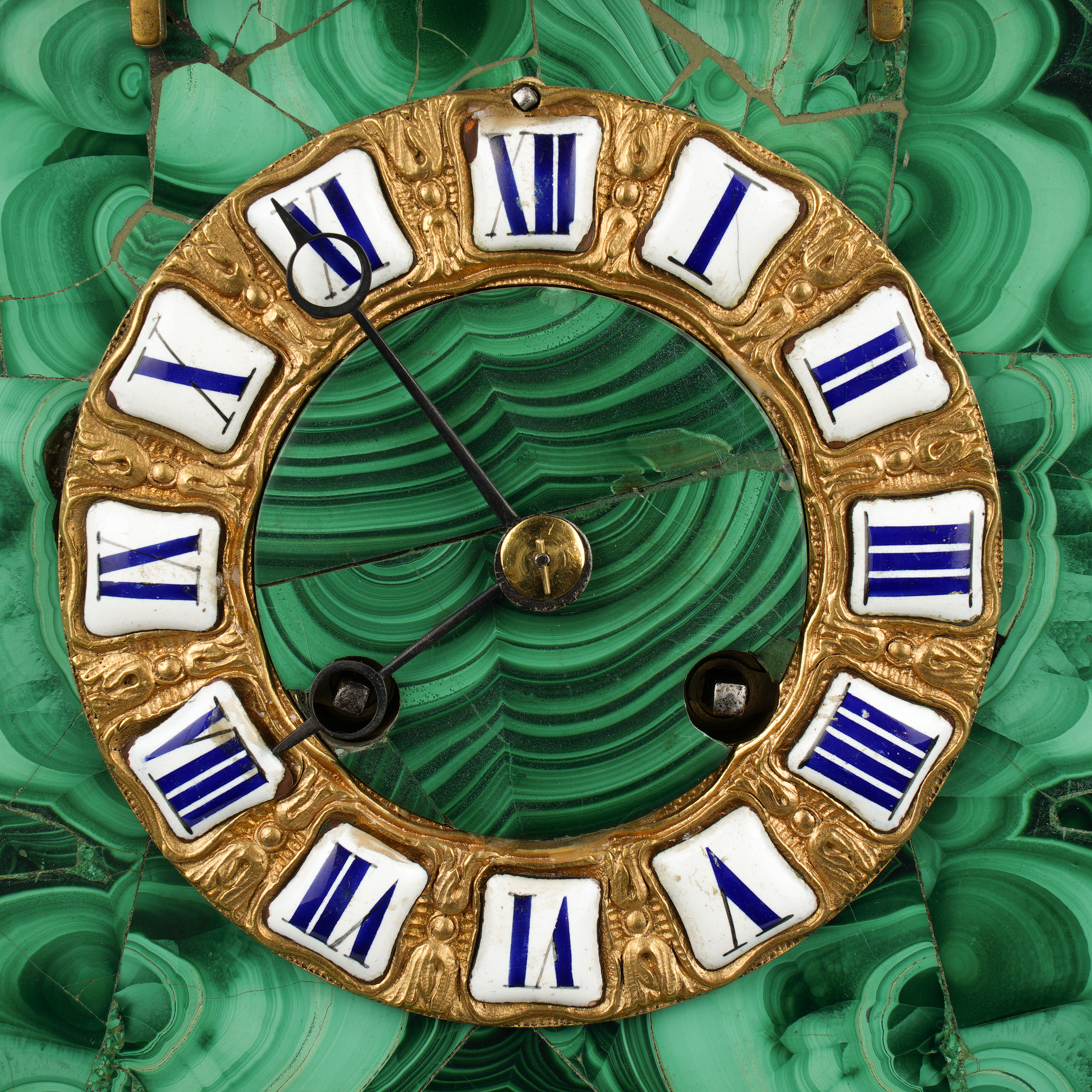 Облицовка малахитом в технике «русская мозаика», бронза, литье, чеканка, латунь; циферблат выполнен в виде эмалевых вставок с синими римскими цифрами, на плате часового механизма медаль «Japy Freres et Cie, Medaille d'Honneur» с крестом ордена Почетного Легиона в центре, а также номером механизма «2493» и отметкой «52», часовой механизм французской фирмы братьев Жапи 1880-х годов,