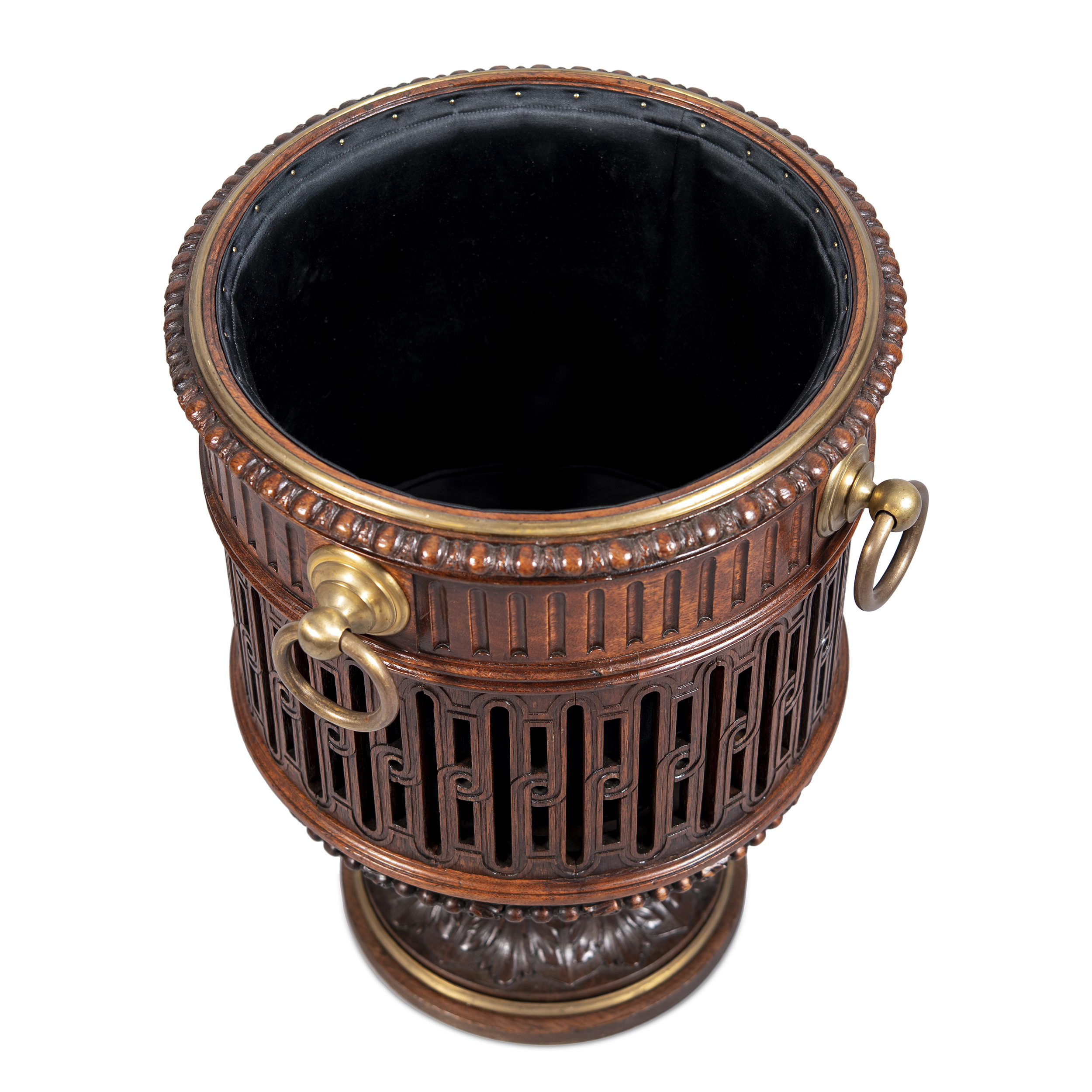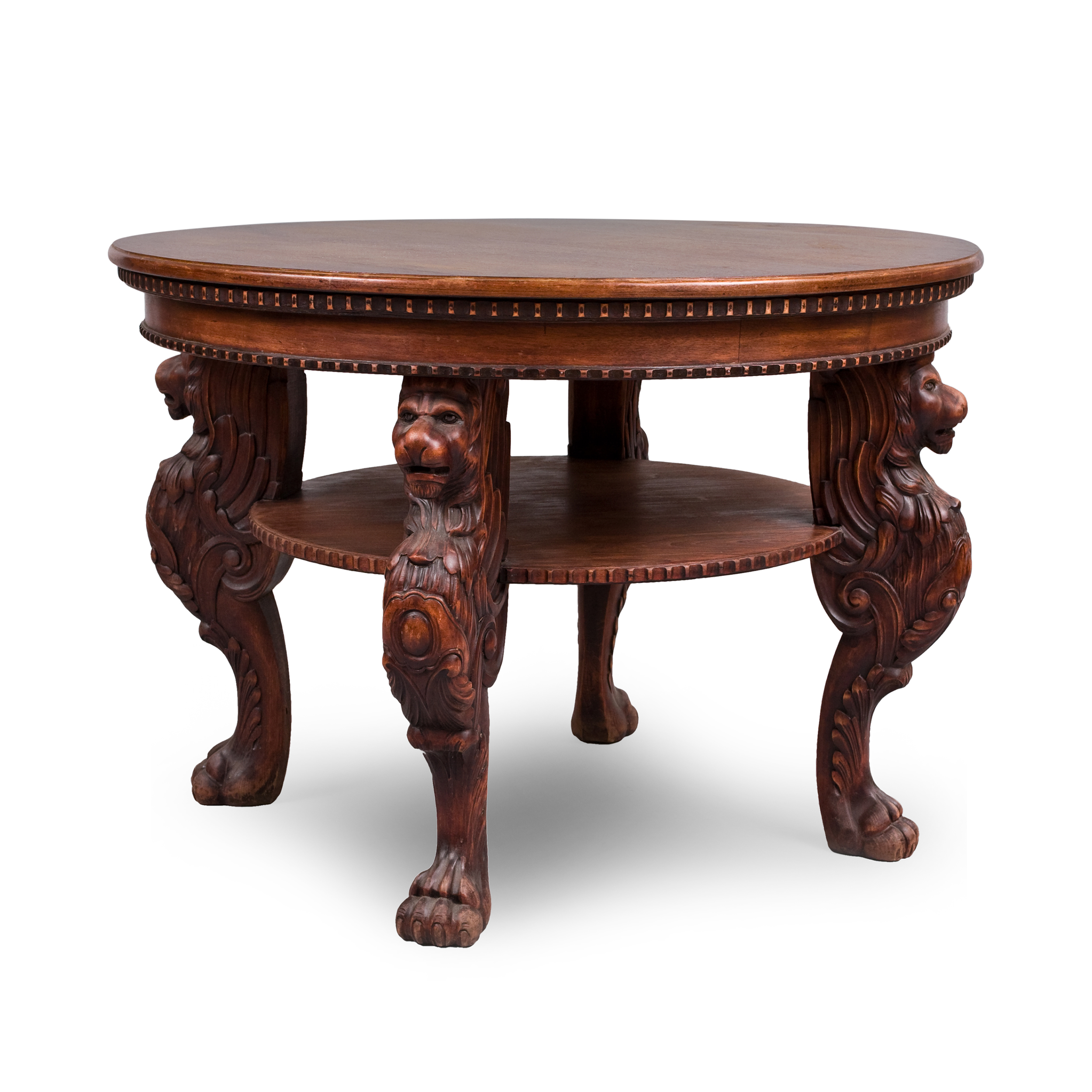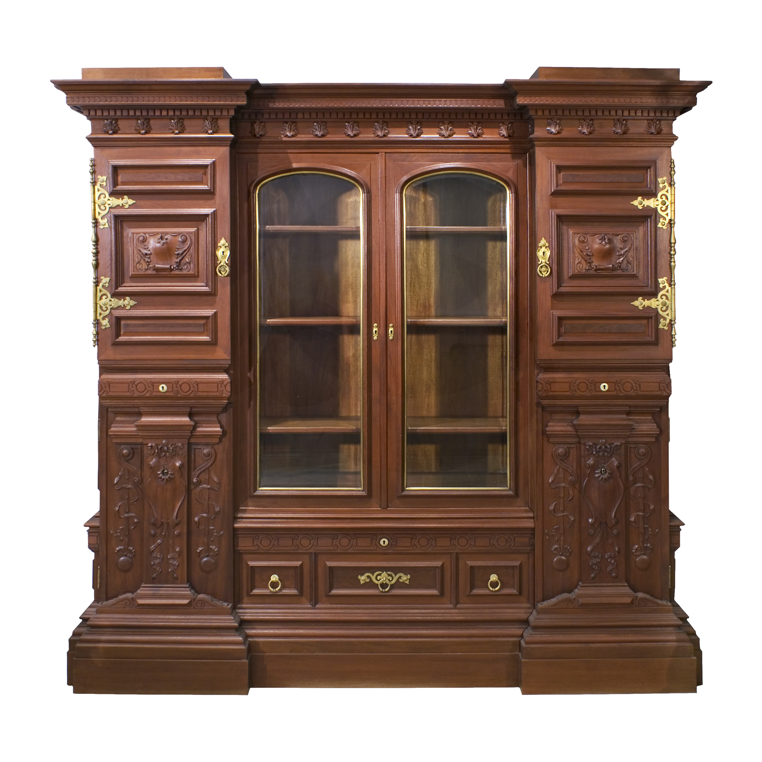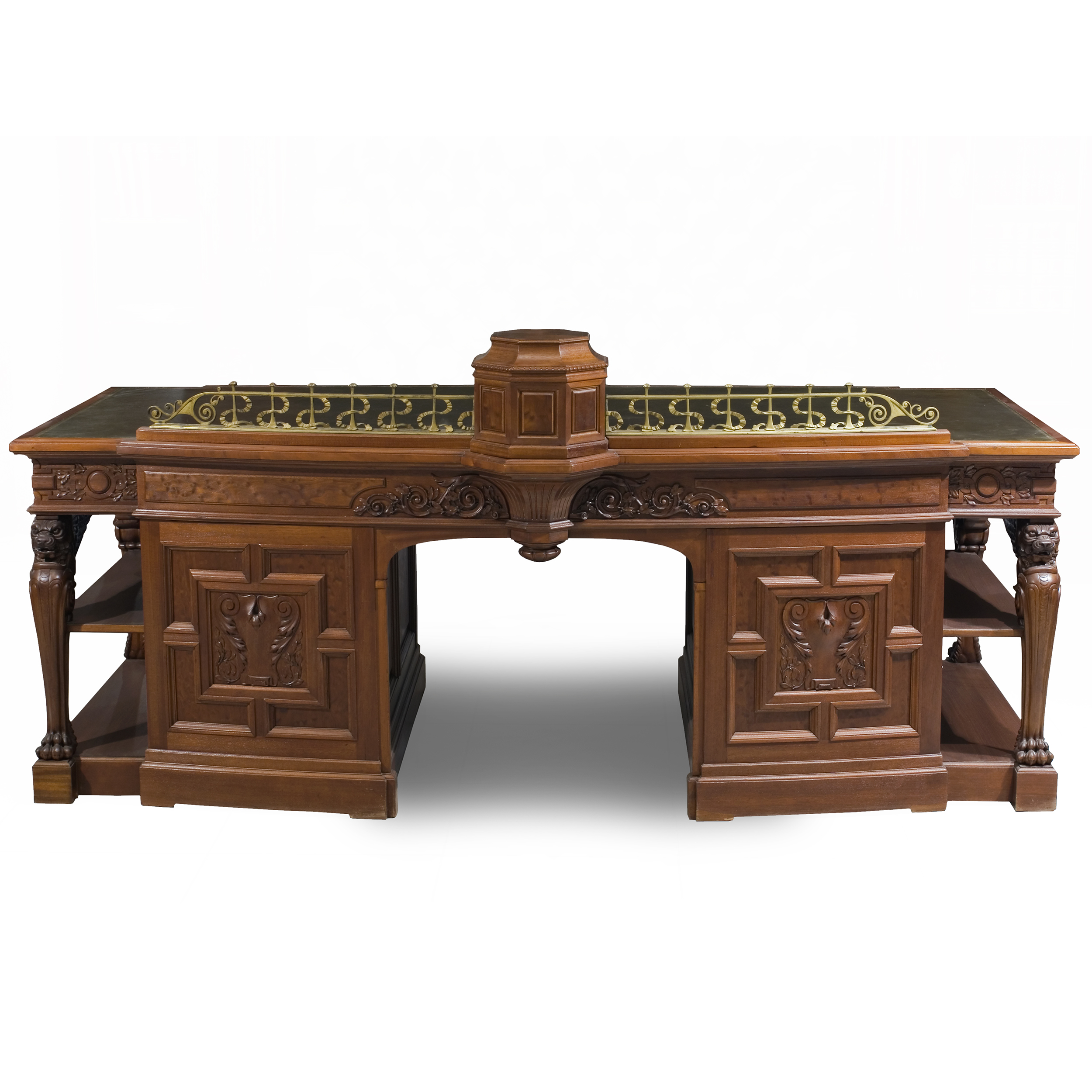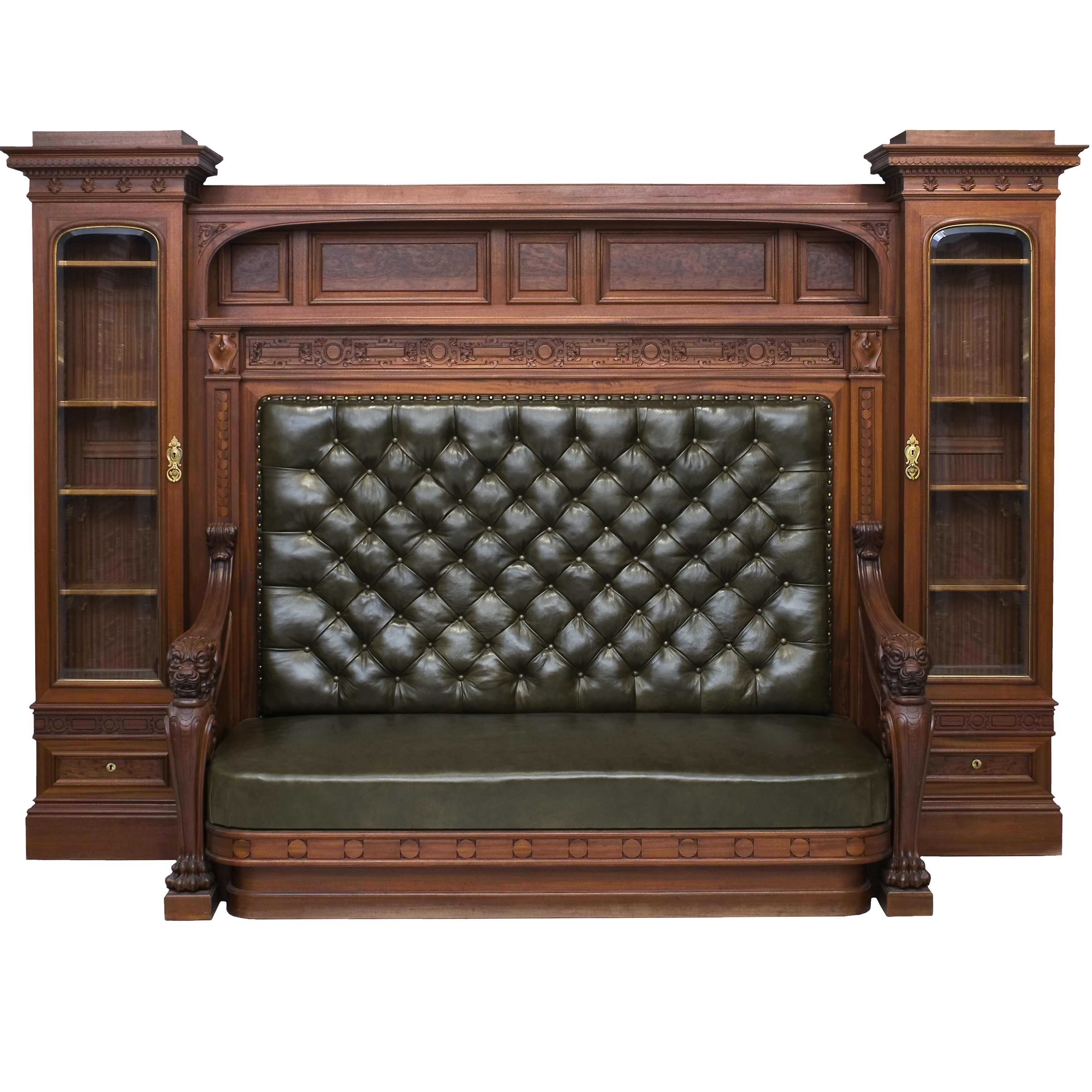 Шкаф для книг, диван со шкафами витринами, письменный стол, рабочее кресло, корзина для бумаг, стол кабинетный на ножках в виде львиных лап. Красное дерево, массив, резьба, Москва, Фабрика П. А. Шмита, конец 1890-х начало 1900-х годов. Размеры (в/ш/г): шкаф-220х 60х218 см; диван-304х100х218см; стол-213х110х76,5 см; кресло- 102х77х65 см; корзина-высота 48, диаметр 52 см, стол на львиных ножках - 70х100 см