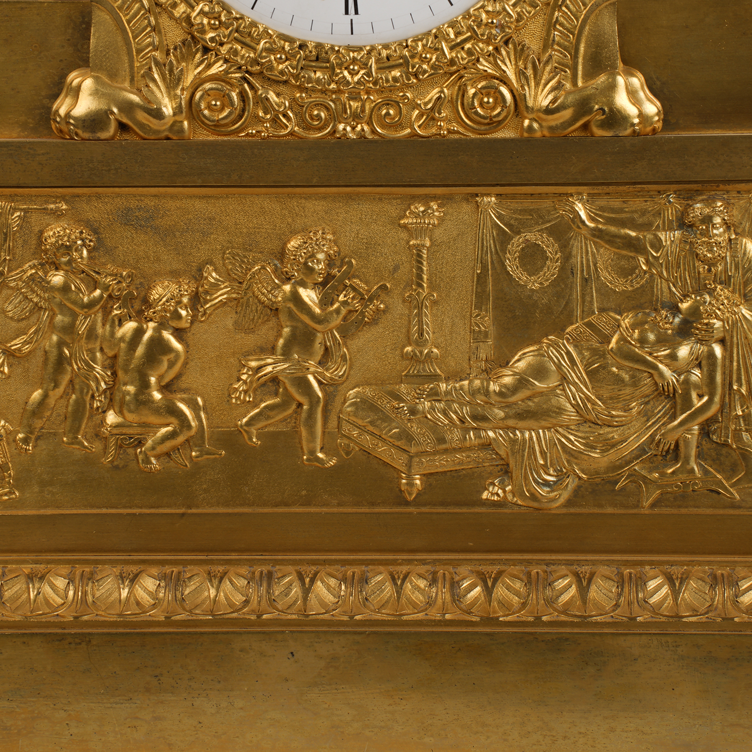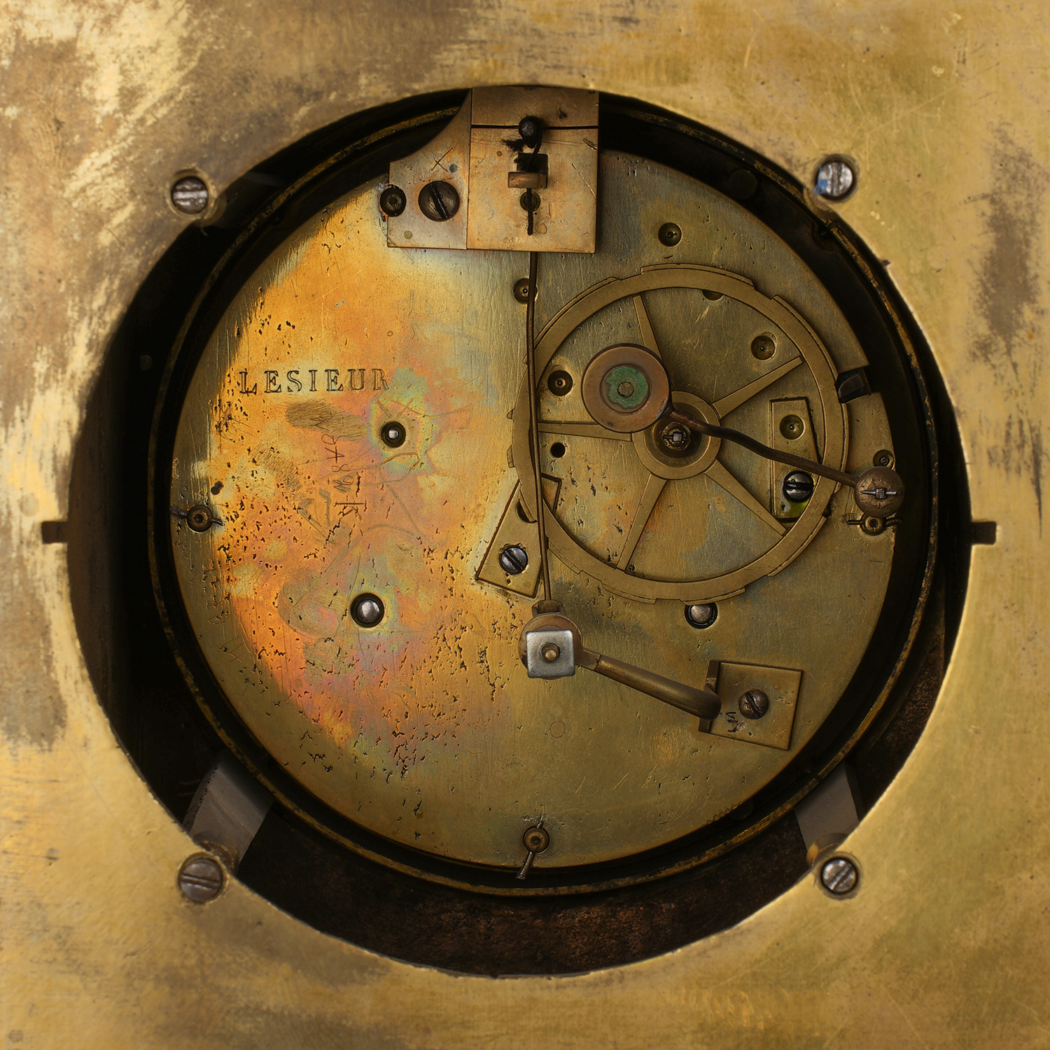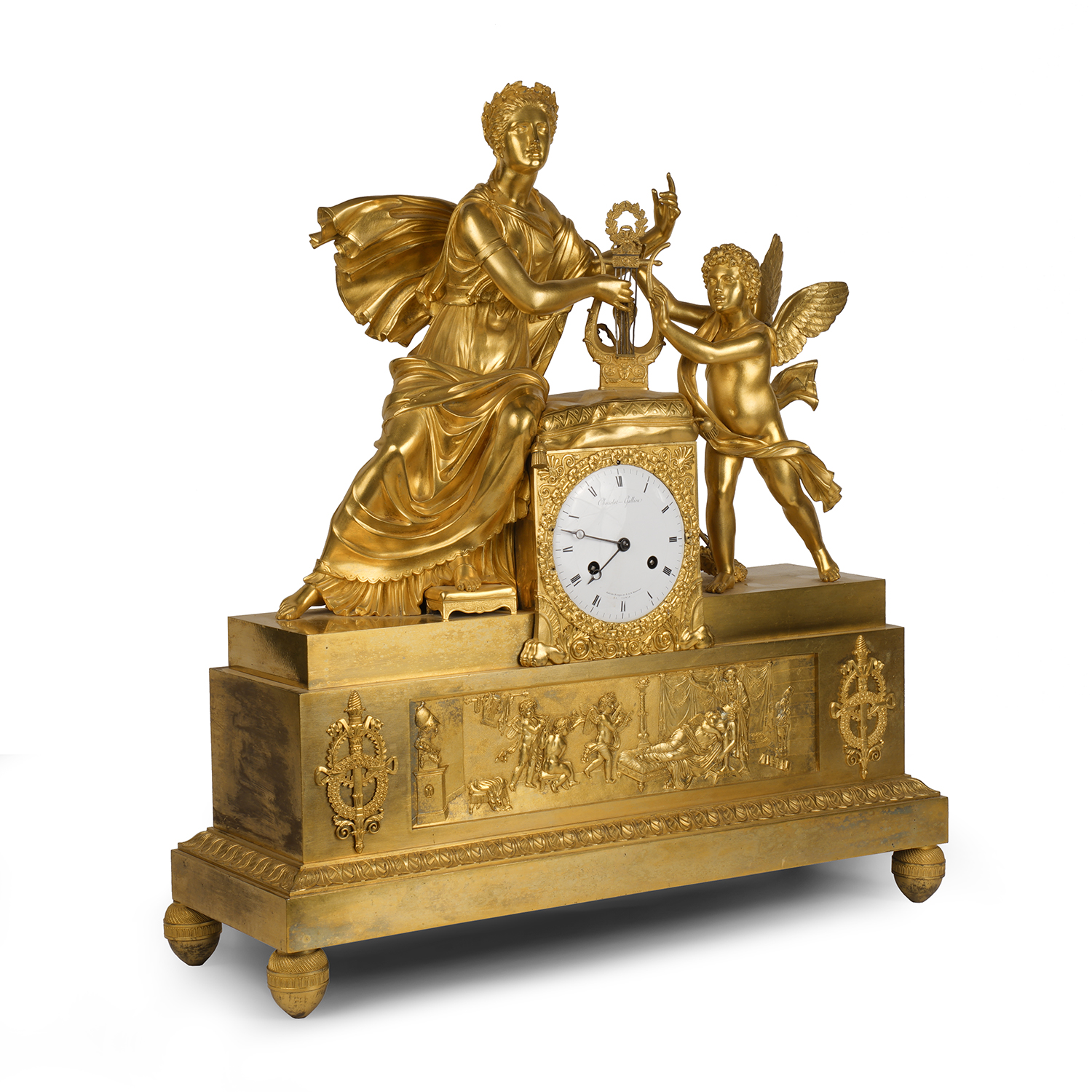 Бронза, литье, золочение; эмалевый циферблат с римскими цифрами часов и делением на минуты, стальные вороненые стрелки; на циферблате надпись-клеймо мастерской: