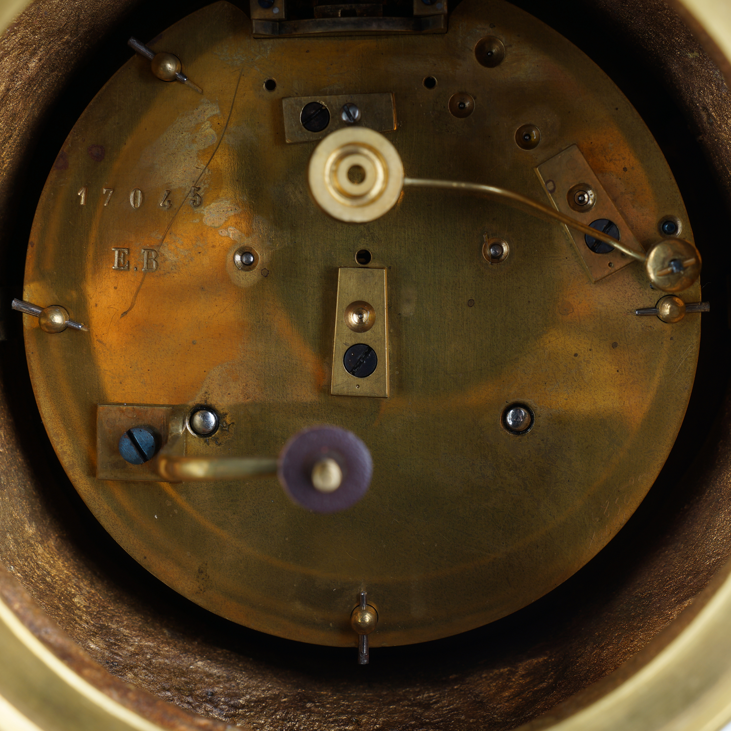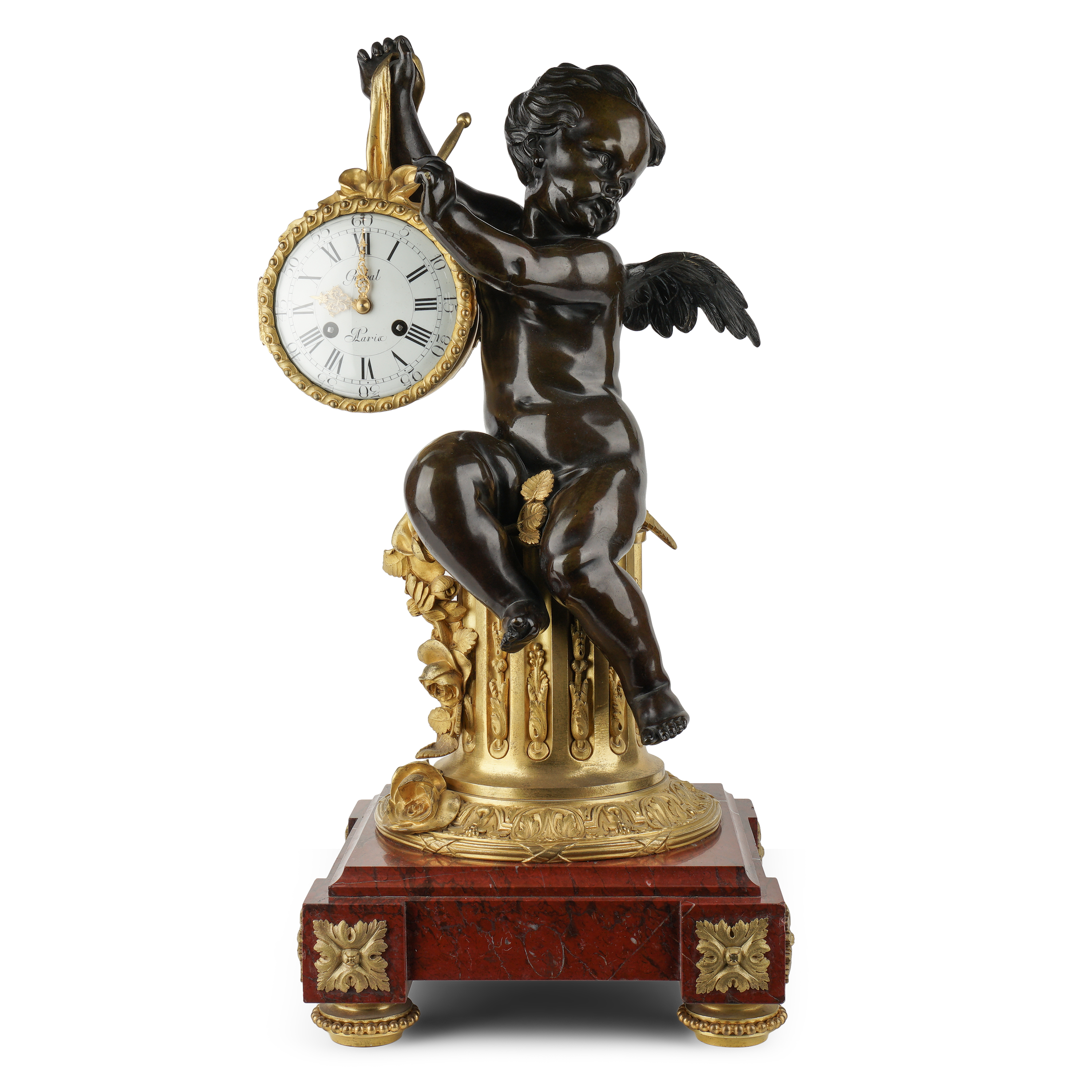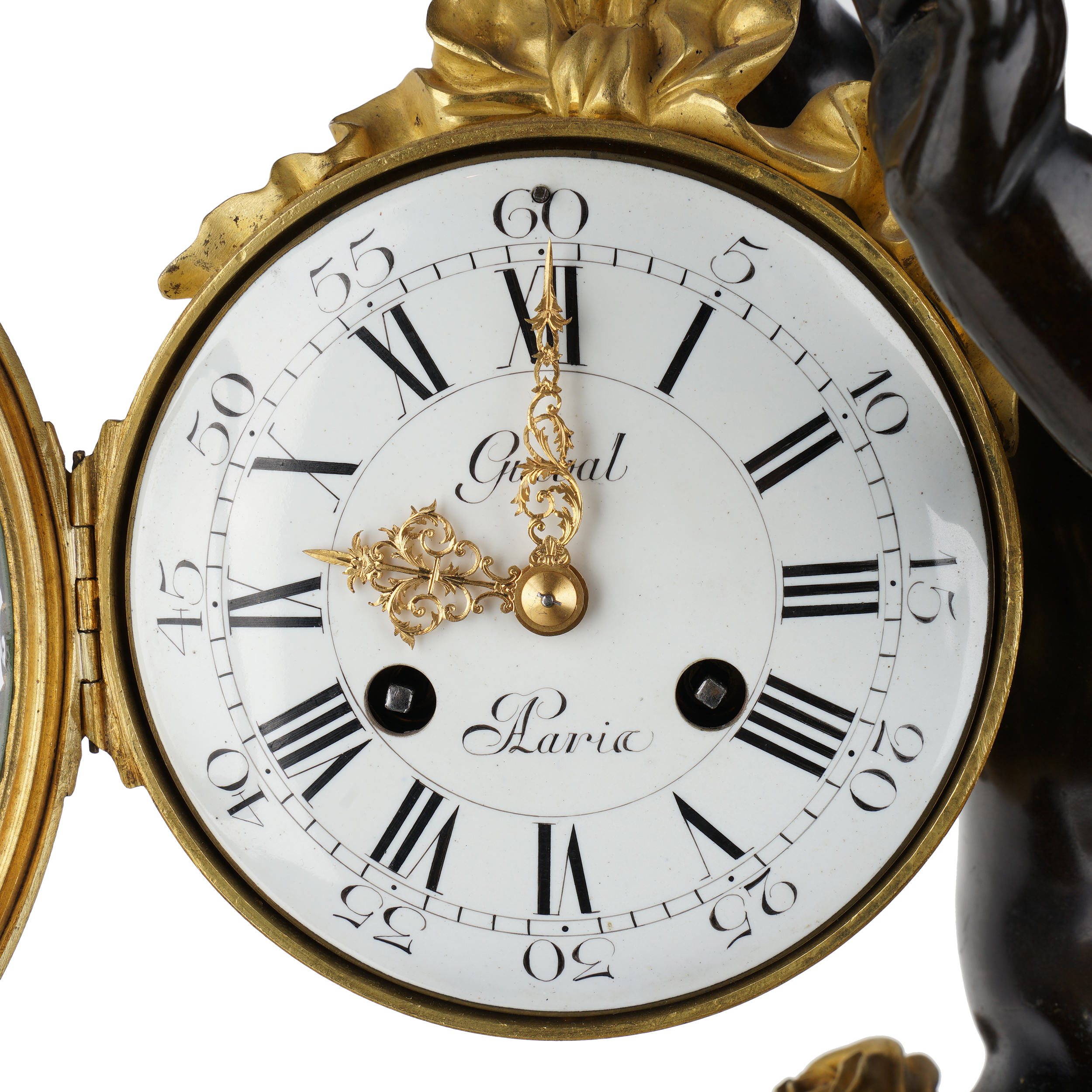 Бронза, литье, патинирование, золочение, мрамор гриотт, эмалевый циферблат с римскими цифрами часов и делением на минуты; золотые ажурные стрелки, надпись на циферблате в две строки: «Guibal/A Paris», на плате часового механизма «Е.В», бронзолитейная фабрика Гийома Деньера, часовщик Гибаль (Guibal, работал в Париже с 1840-х годов); Париж, размеры (в/ш/г): 60 х 29 х 29 см.