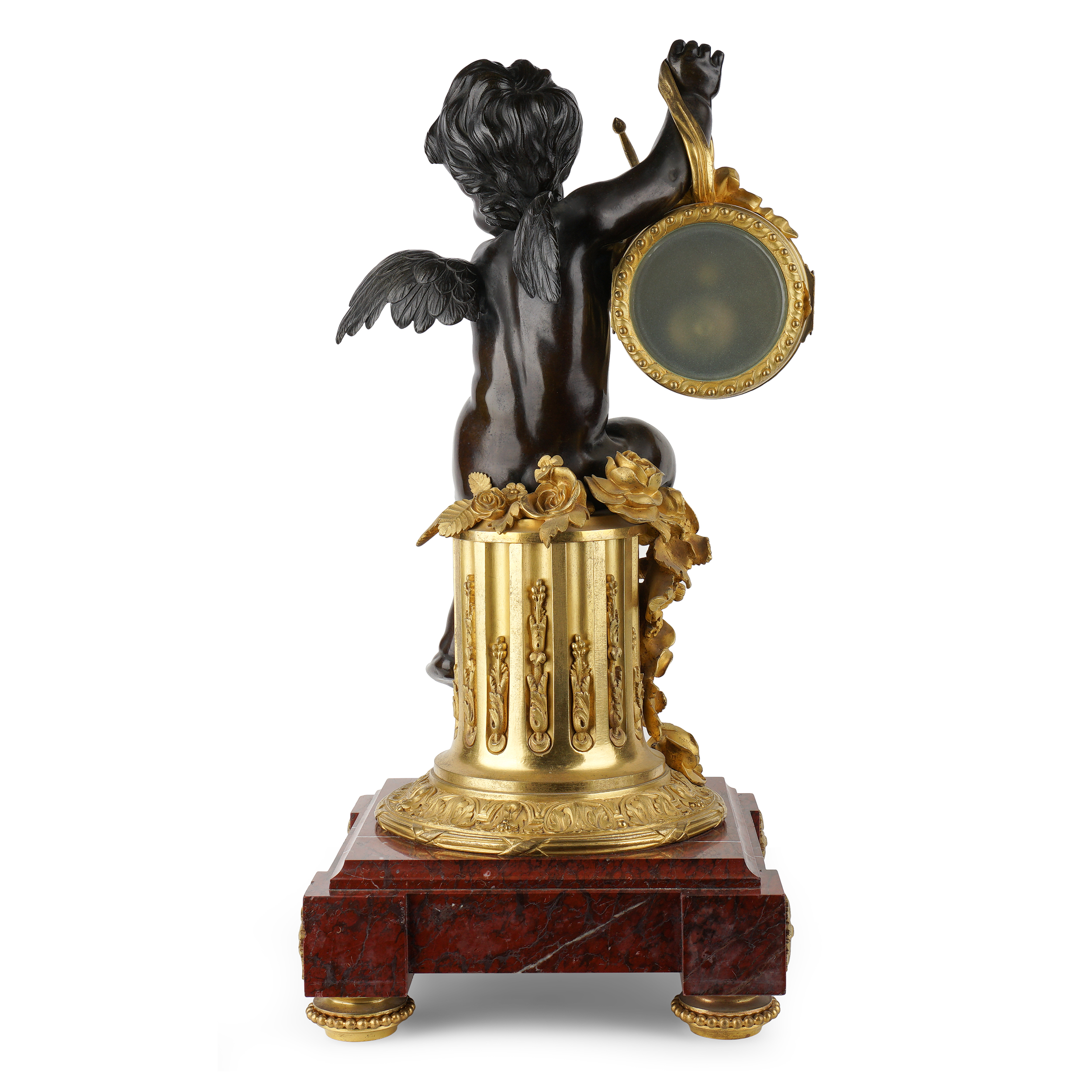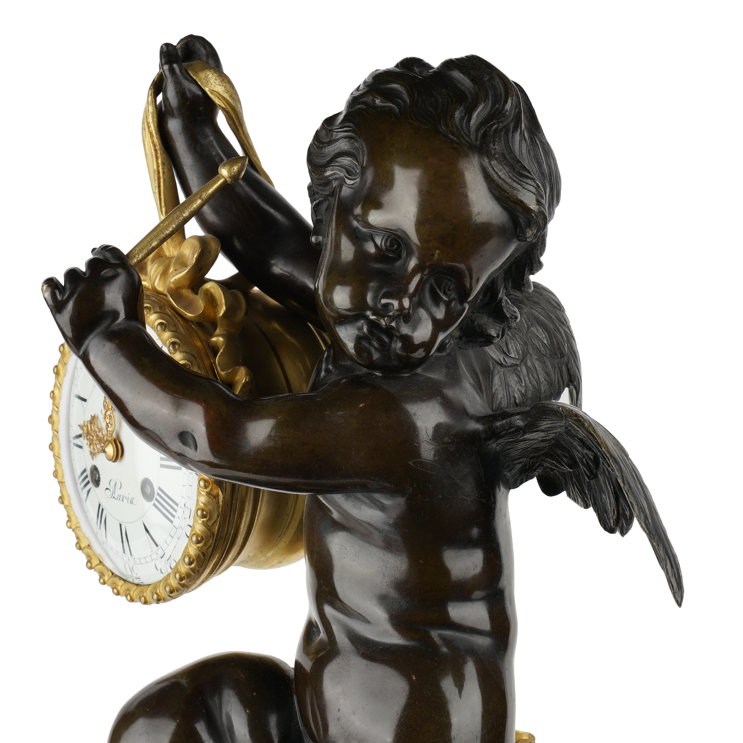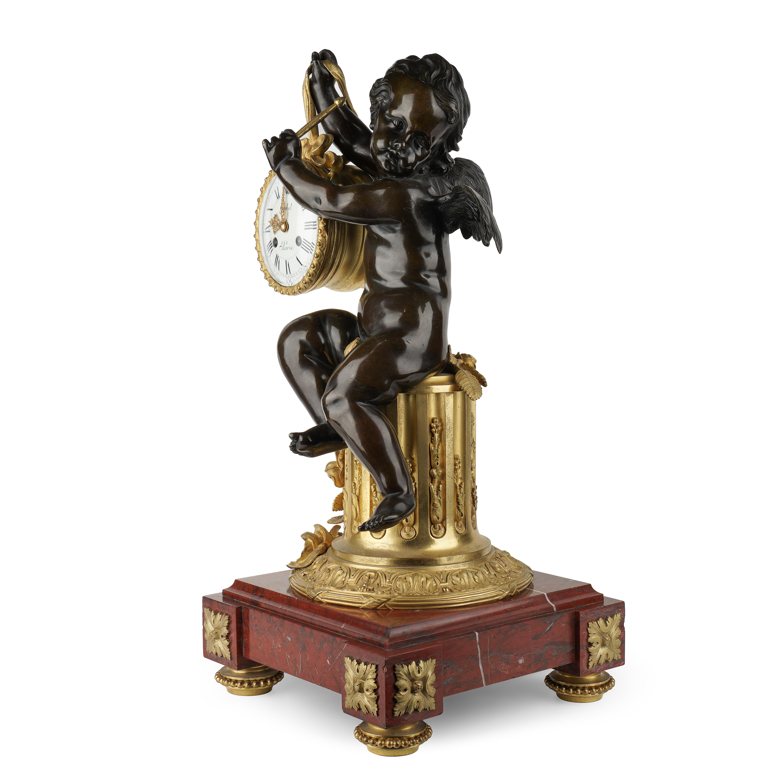 Бронза, литье, патинирование, золочение, мрамор гриотт, эмалевый циферблат с римскими цифрами часов и делением на минуты; золотые ажурные стрелки, надпись на циферблате в две строки: «Guibal/A Paris», на плате часового механизма «Е.В», бронзолитейная фабрика Гийома Деньера, часовщик Гибаль (Guibal, работал в Париже с 1840-х годов); Париж, размеры (в/ш/г): 60 х 29 х 29 см.