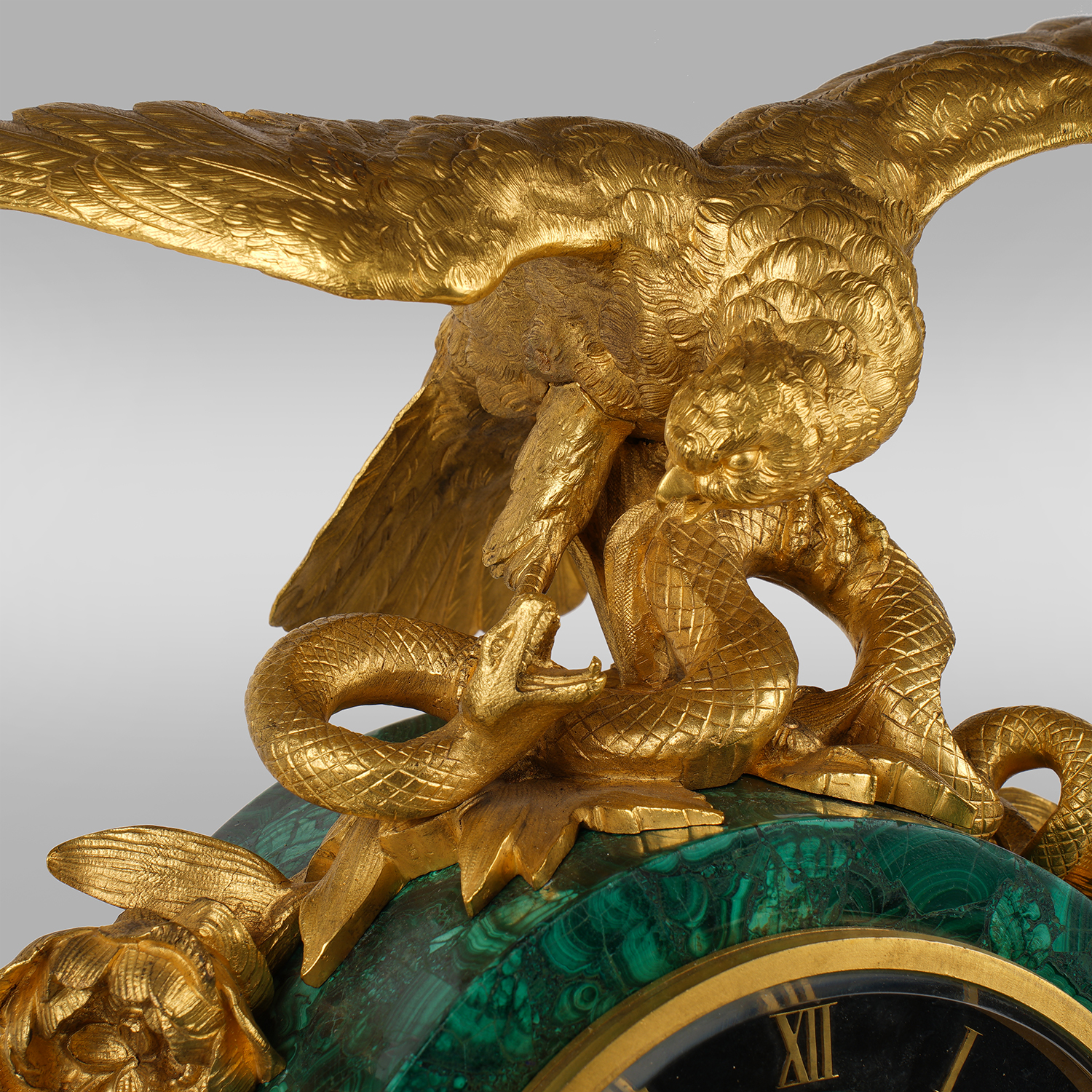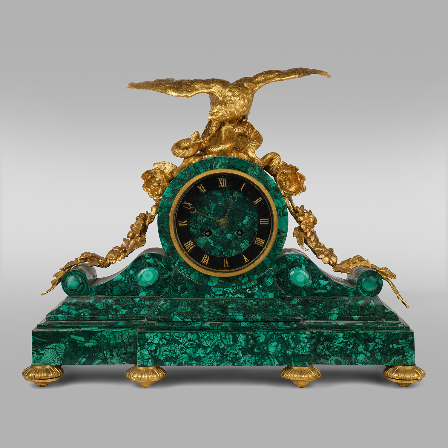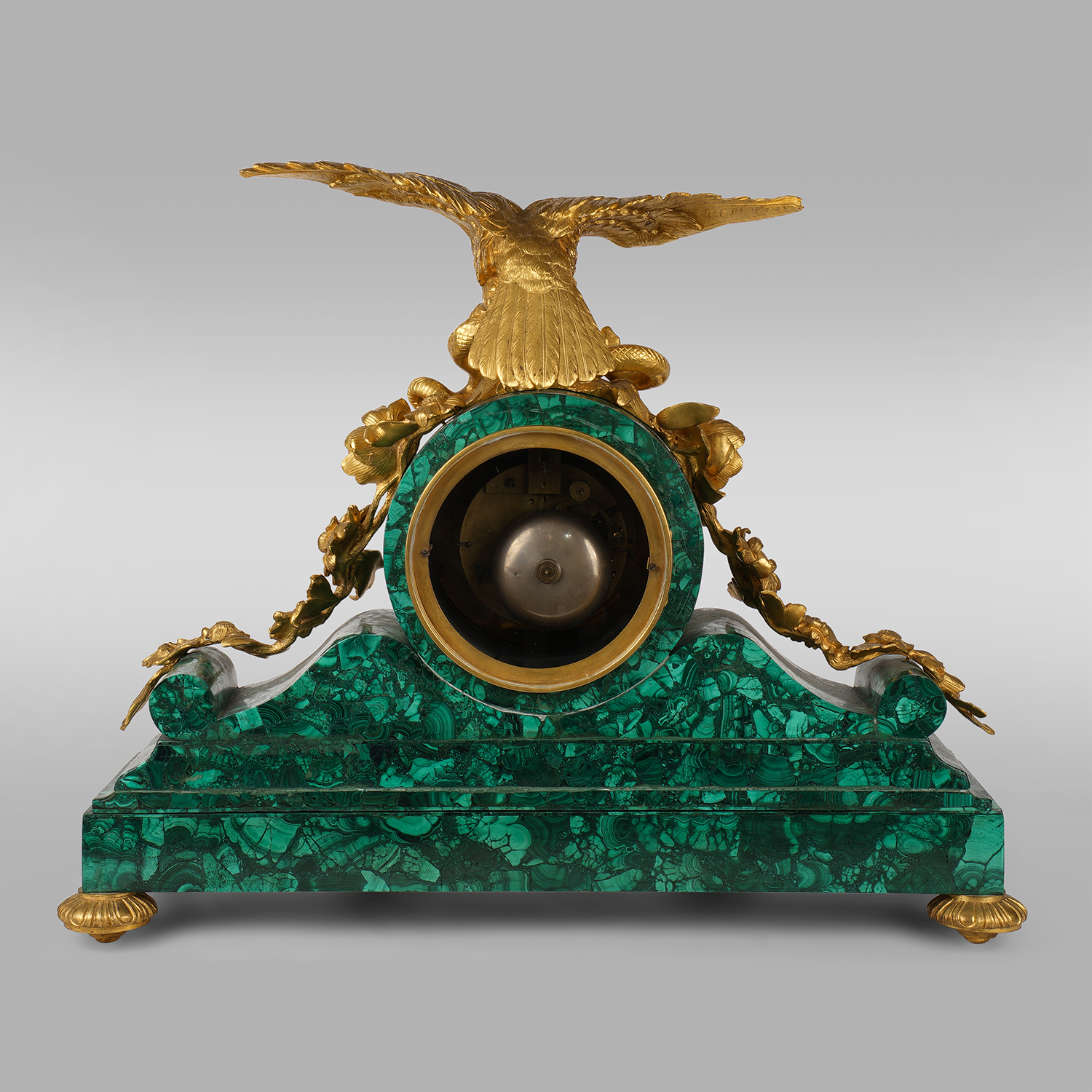 Бронза, литье, чеканка, золочение, облицовка малахитом; на эмалевом диске циферблата бронзовые римские цифры для обозначения часов; на плате часового механизма штамп: «ROLLIN / A PARIS», Париж; размер (в/ш/г): 47 х 58 х 18 см.