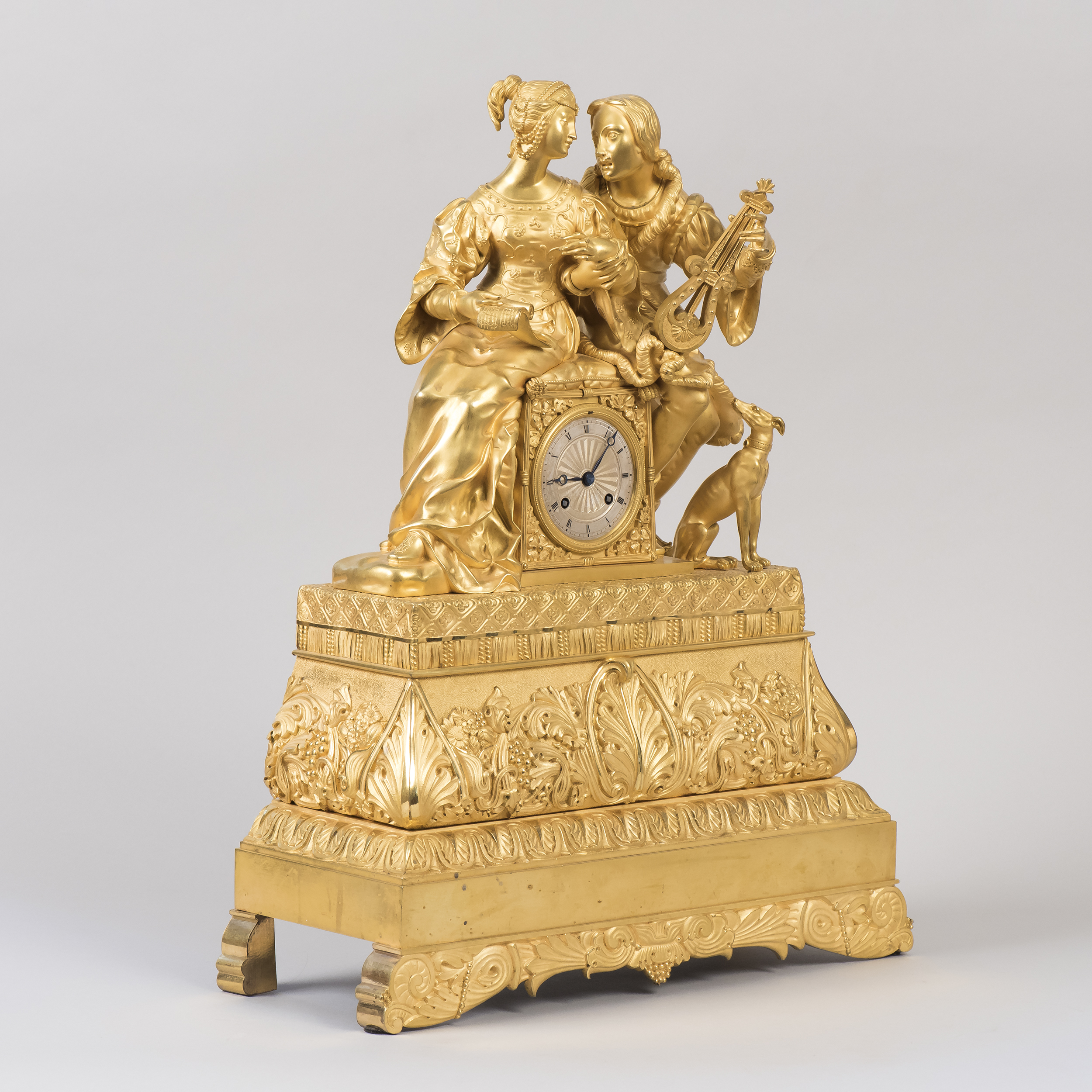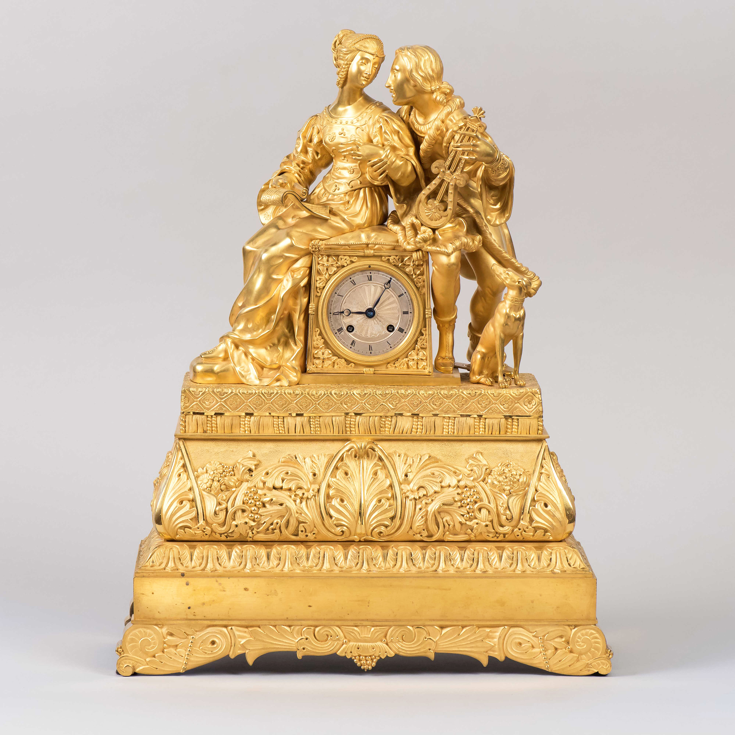 Бронза, литье, золочение, чеканка, латунный гильошированный циферблат с римскими цифрами и делениями на минуты, стальные вороненые стрелки, Франция, первая половина XIX века, размер
