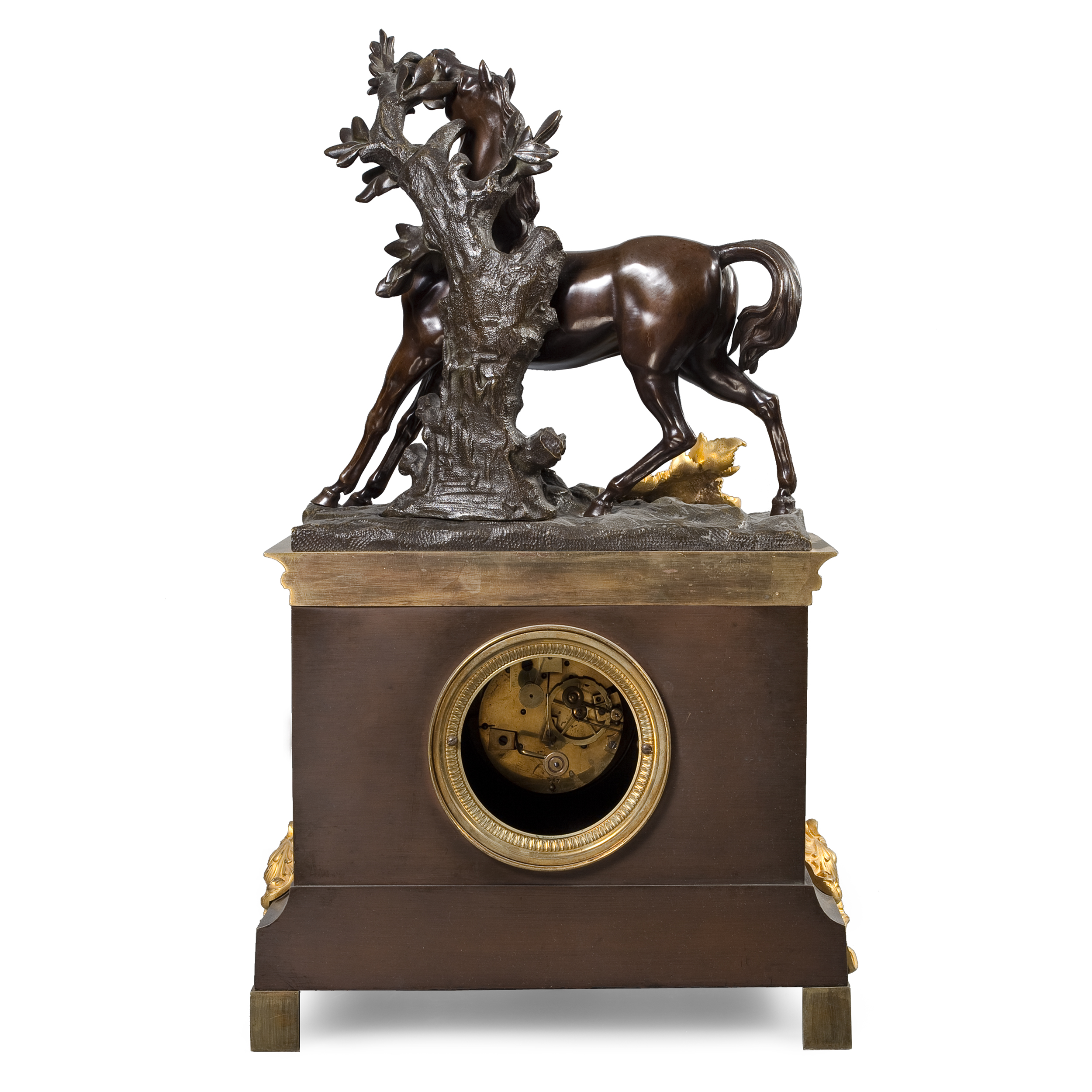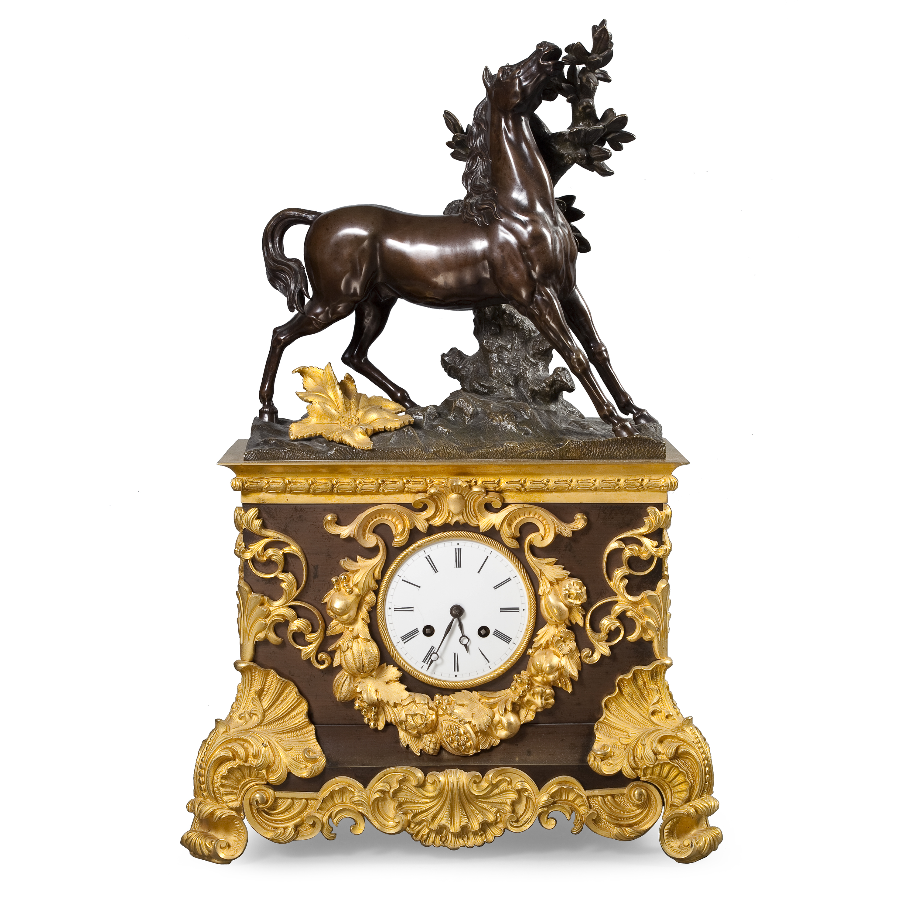 Золоченая бронза, литье, патинирование, эмалевый циферблат с римскими цифрами часов и делением на минуты, стрелки - стальные вороненые, Франция, XIX век, размер (в/ш/г): 54 х 30 х 13 см