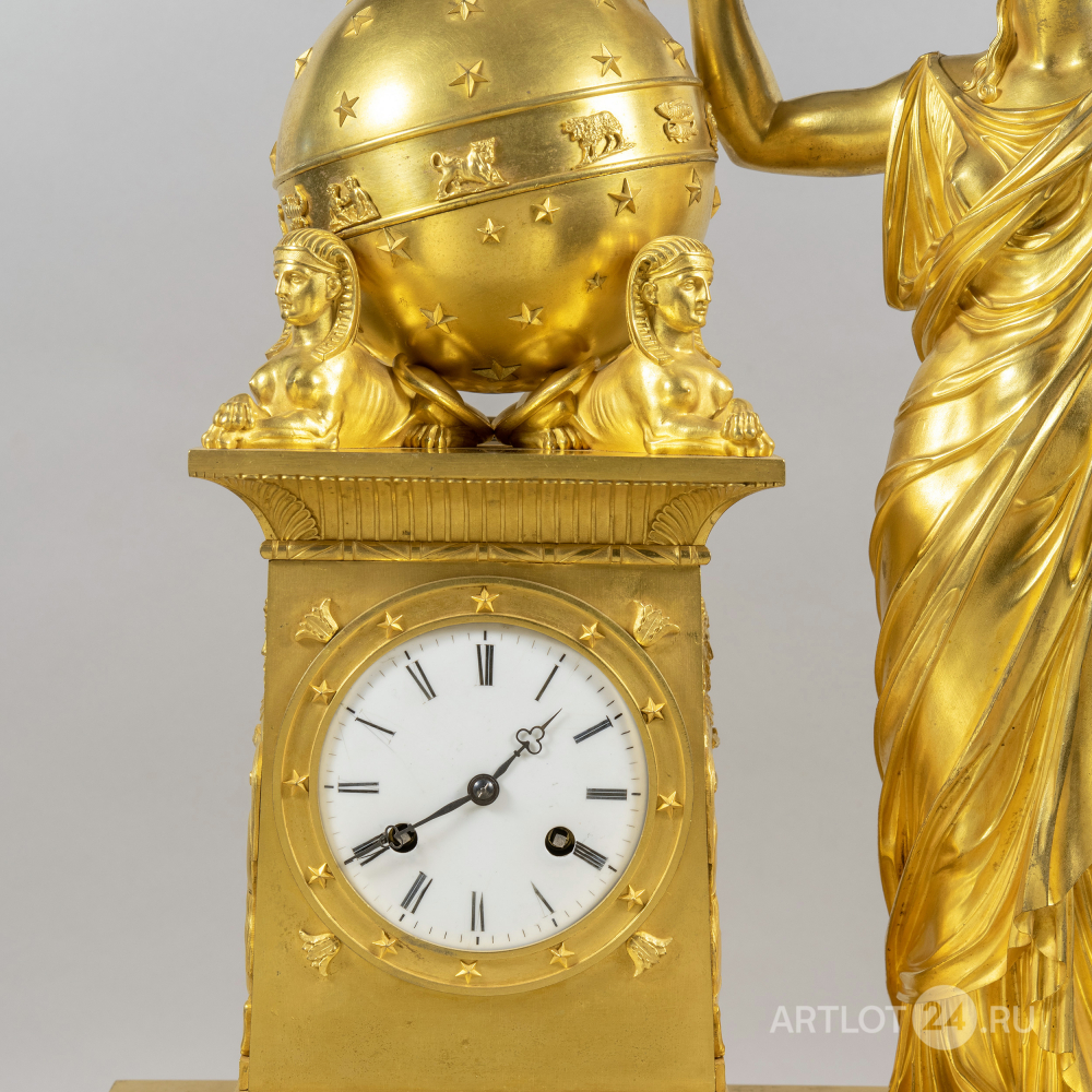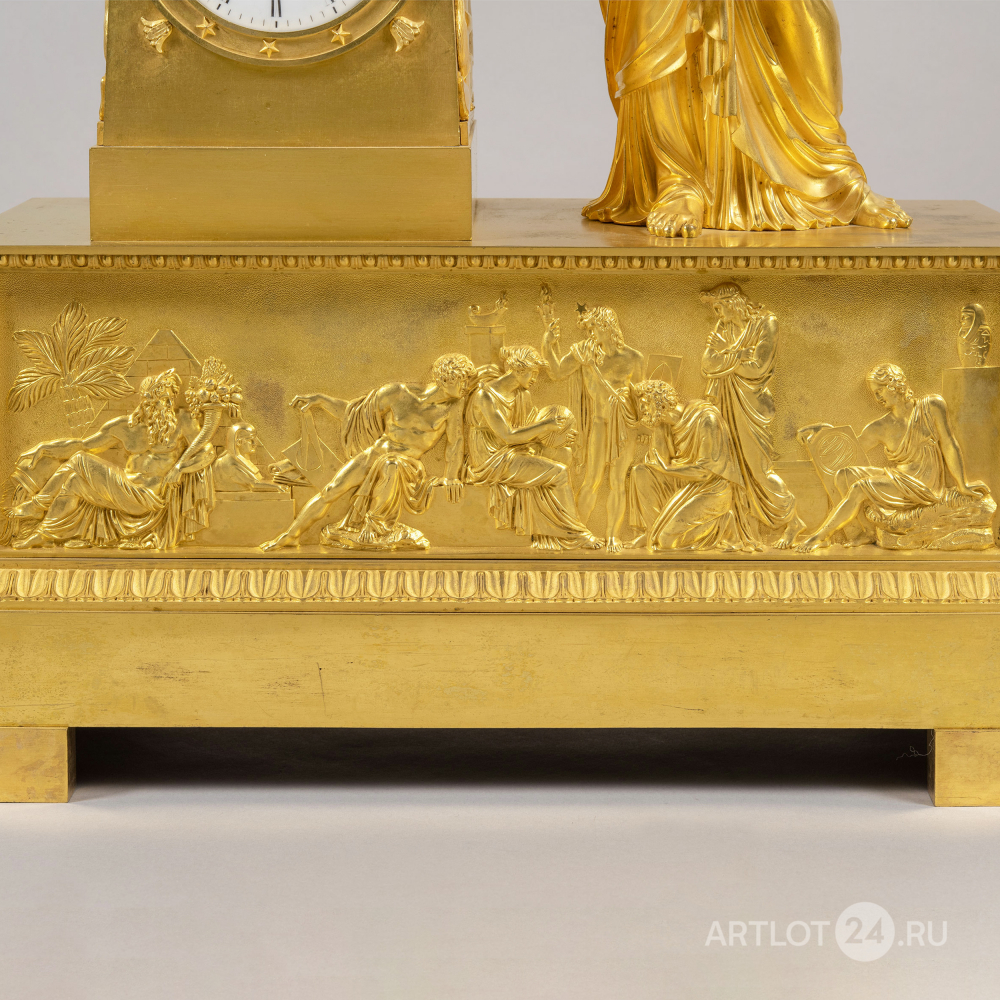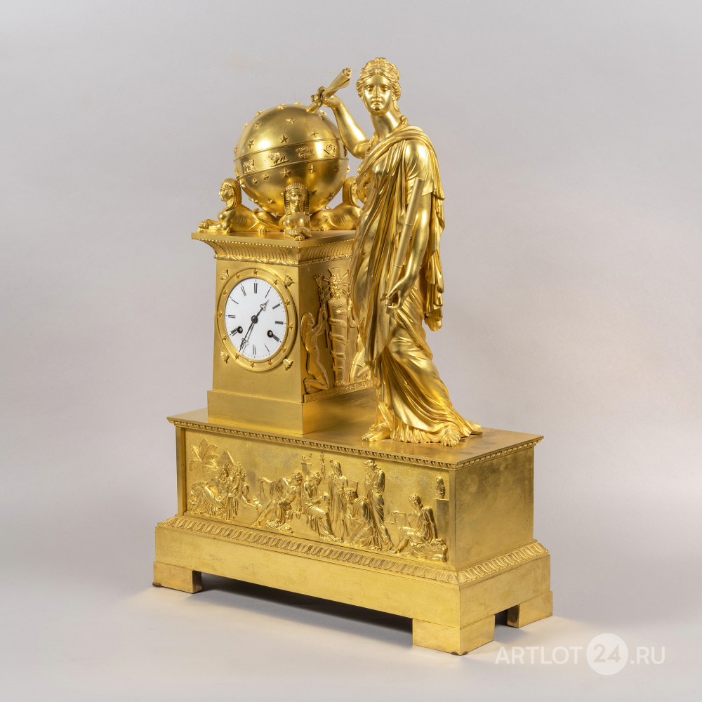 Золоченая бронза, литье, чеканка, эмалевый циферблат с римскими цифрами часов и делением на минуты, стальные вороненые стрелки, мастерская Ж.-Фр. Деньера, автор скульптуры - предположительно Огюст Мари Тонэ, Франция, Париж, около 1815 года, размер (в/ш/г): 65 х 46,8 х 18,8 см.
