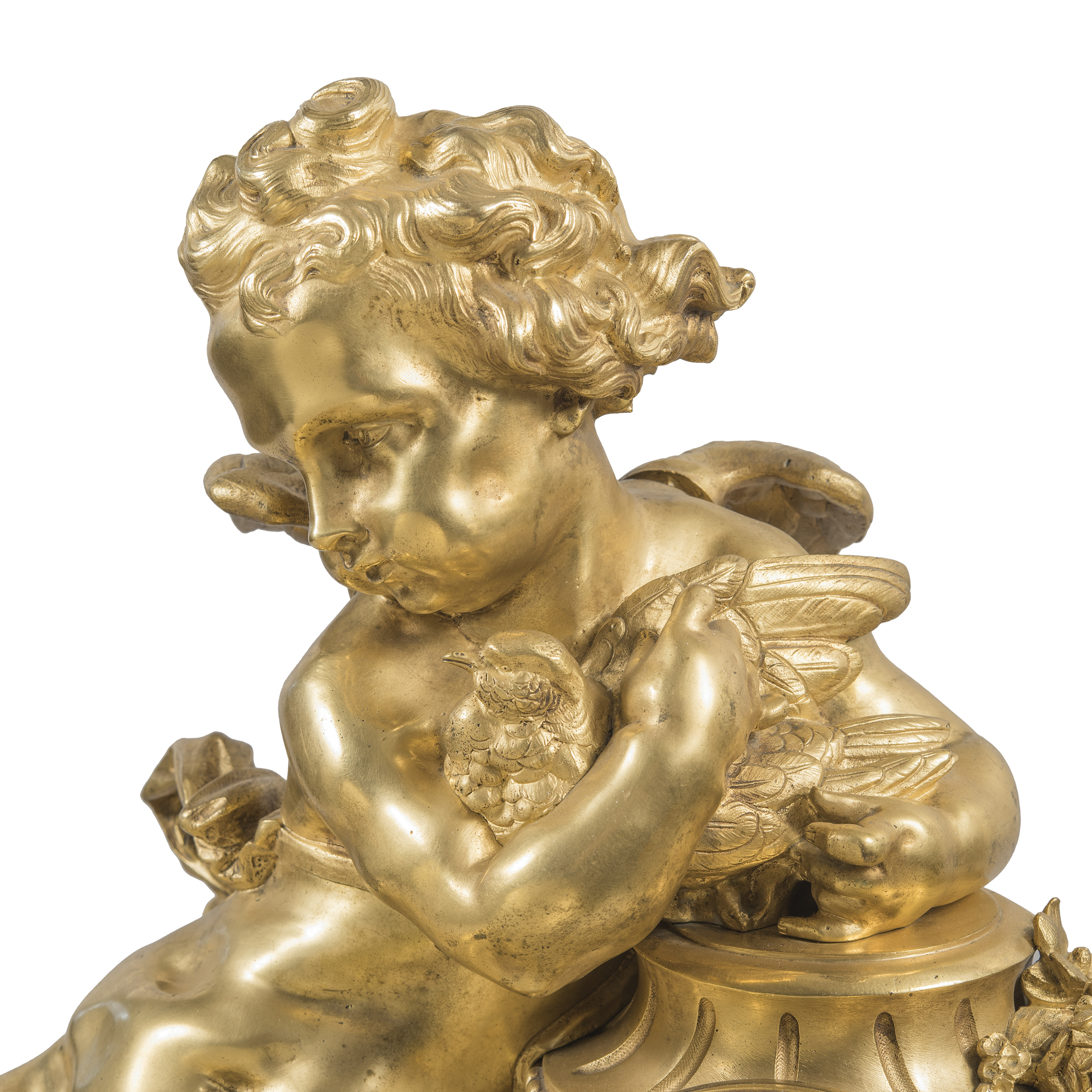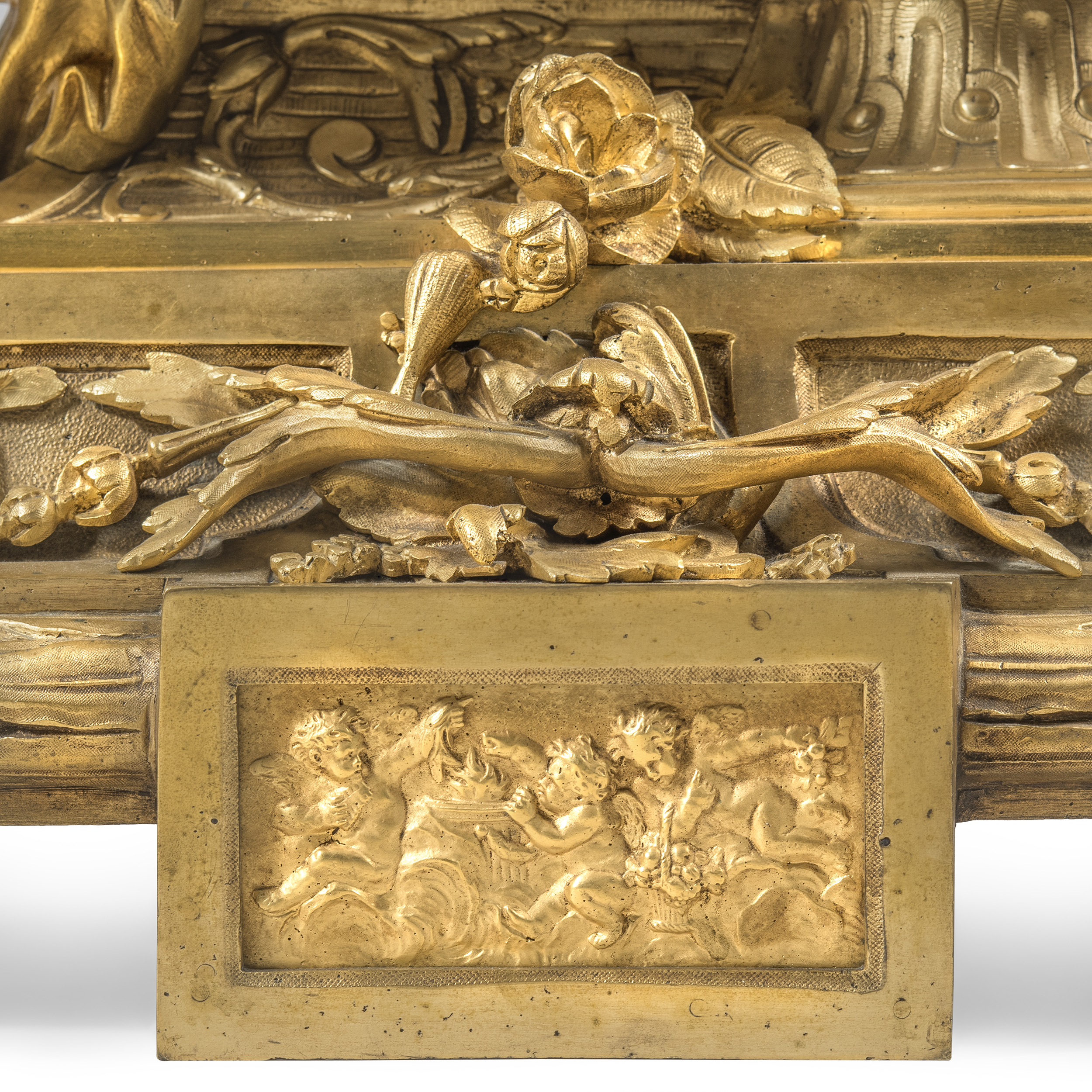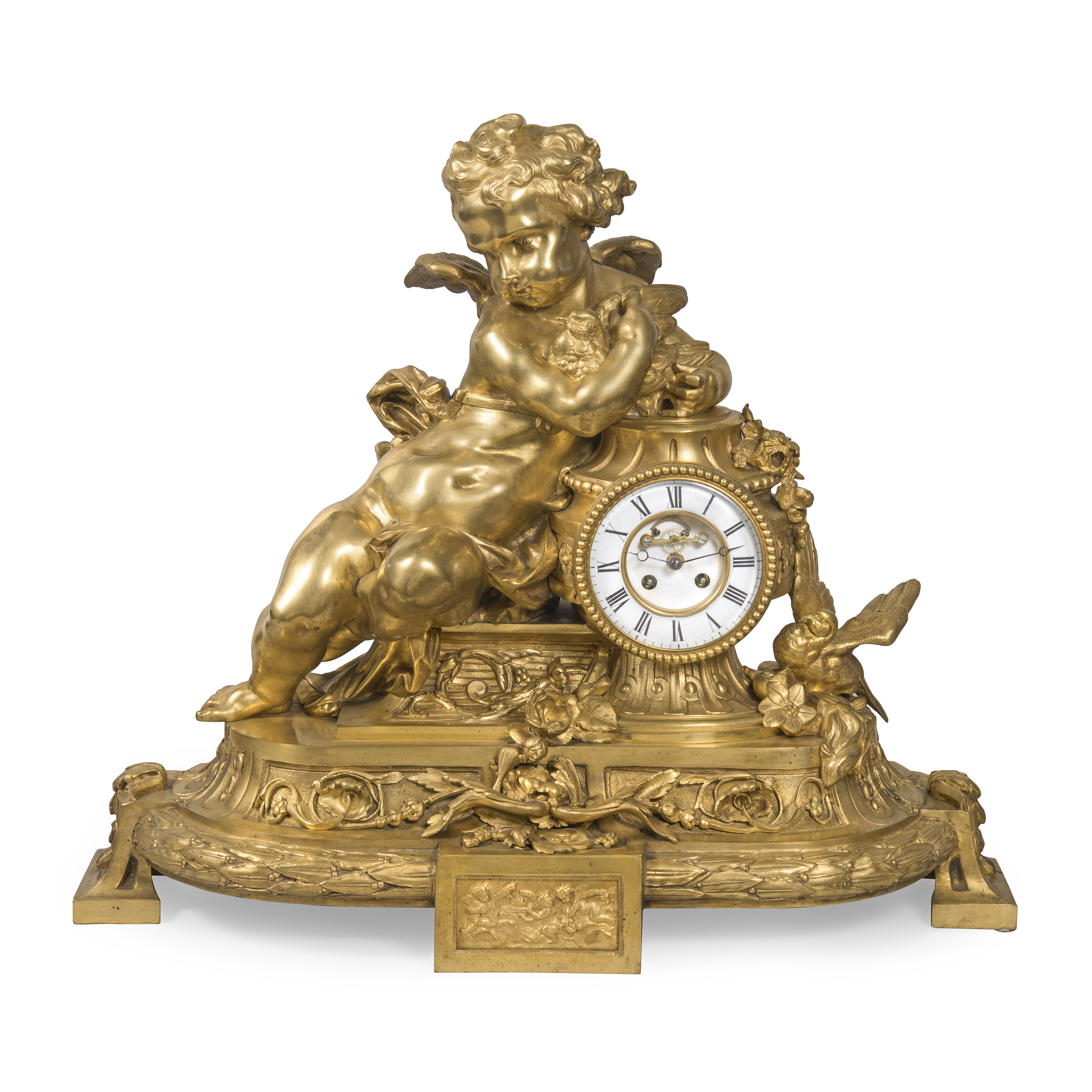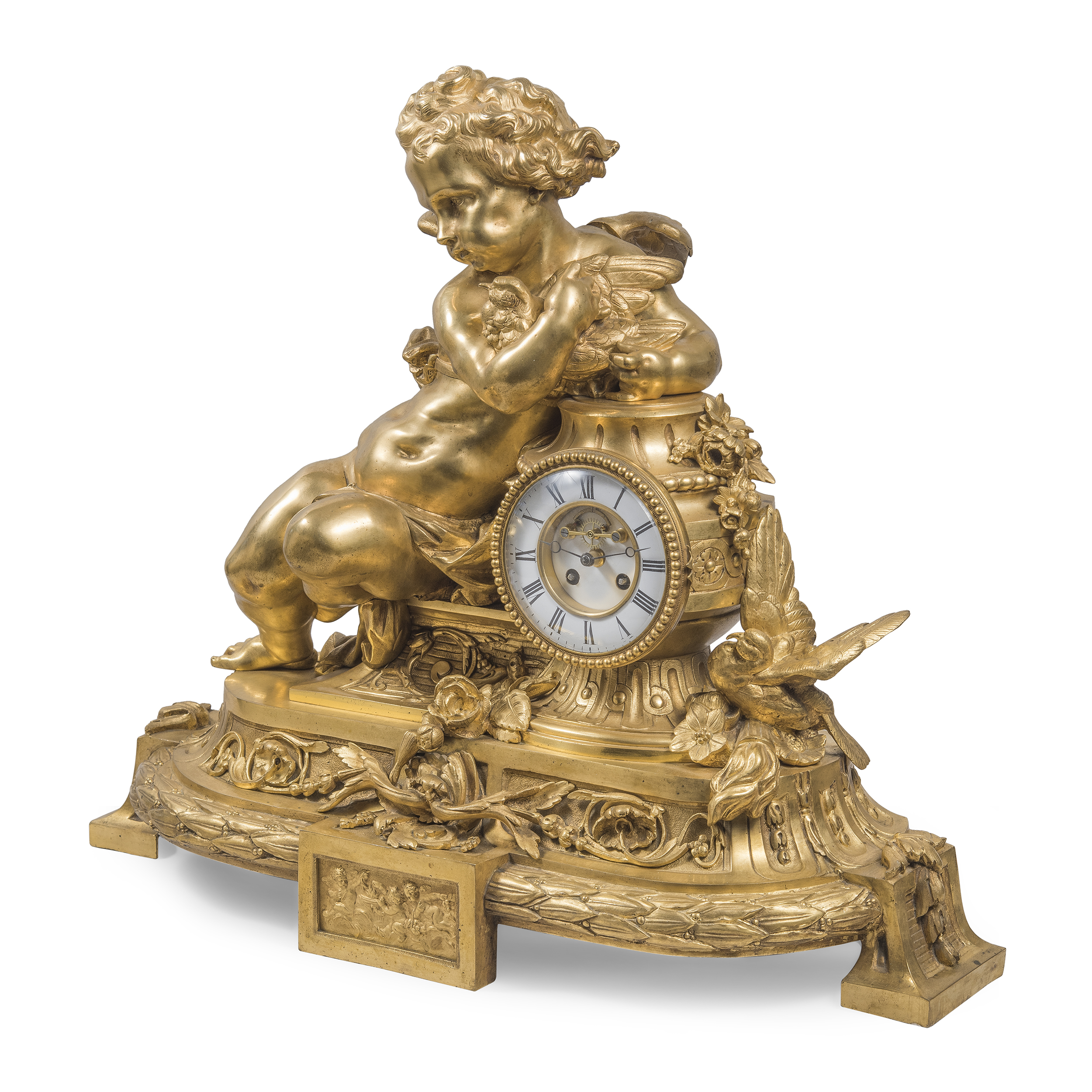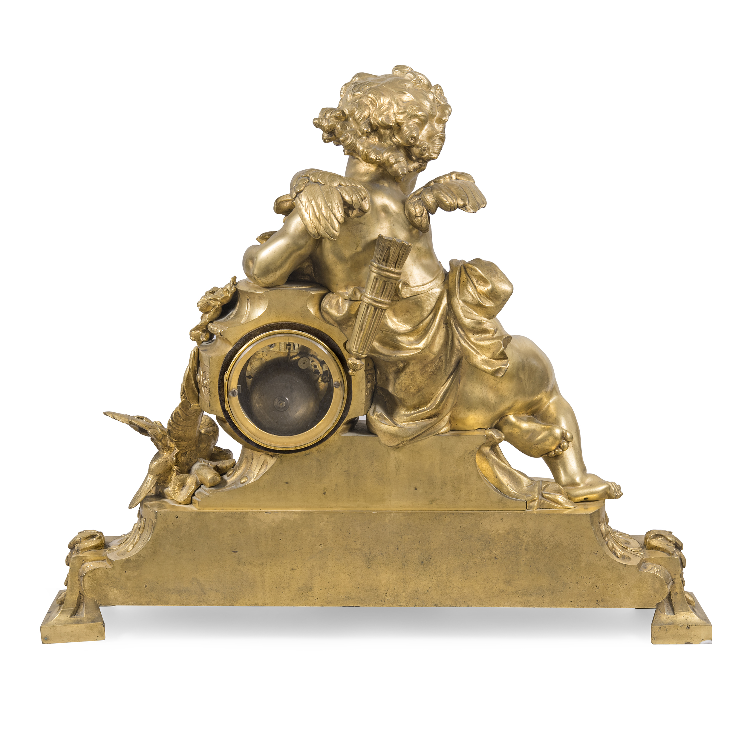 Бронза, литье, золочение, эмалевый циферблат с римскими цифрами часов и делением на минуты, стальные вороненые стрелки, оригинальное защитное стекло с фацетом. На плате часового механизма штамп: «C. DETOUCHE / BREVETE S.G.D.G. / R. ST. MARTIN PARIS », номер «35514», мастерская французского часовщика Константен-Луи Детуш (Constantin-Louis Detouche, 1810-1889), официального часовщика императора Наполеона III, размер: (в/ш/г) 53 х 64 х 19 см.