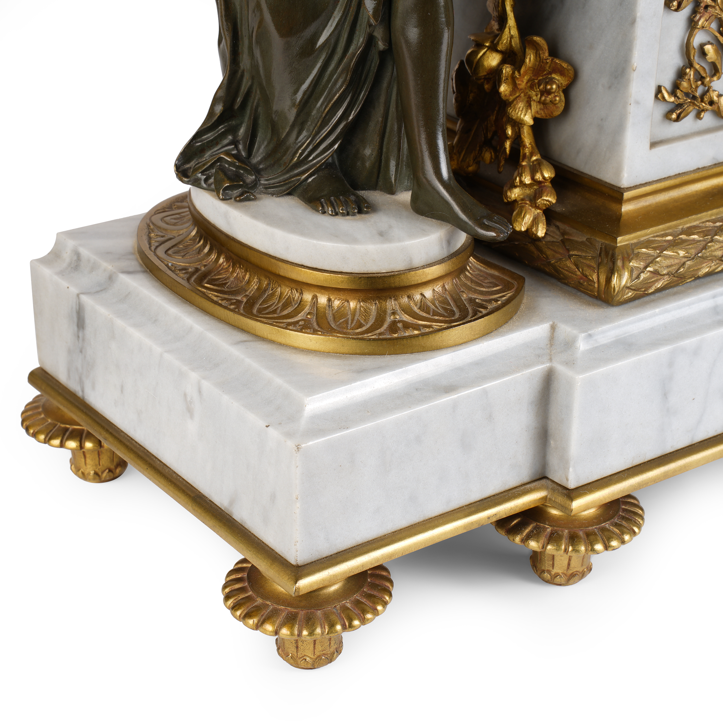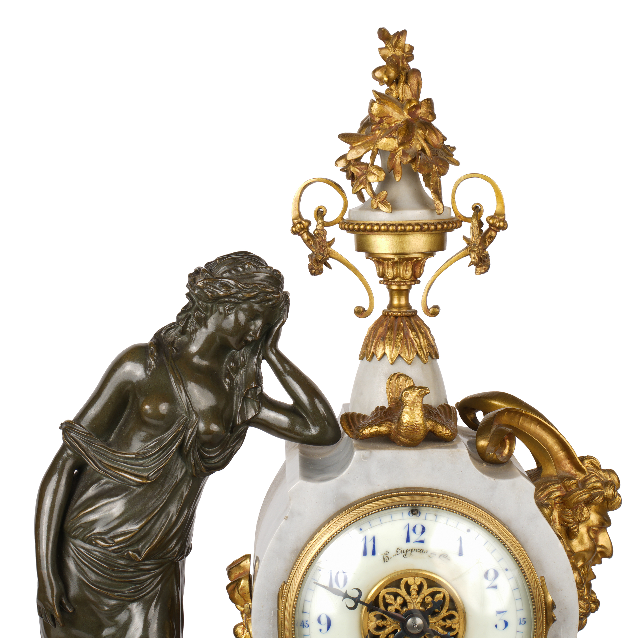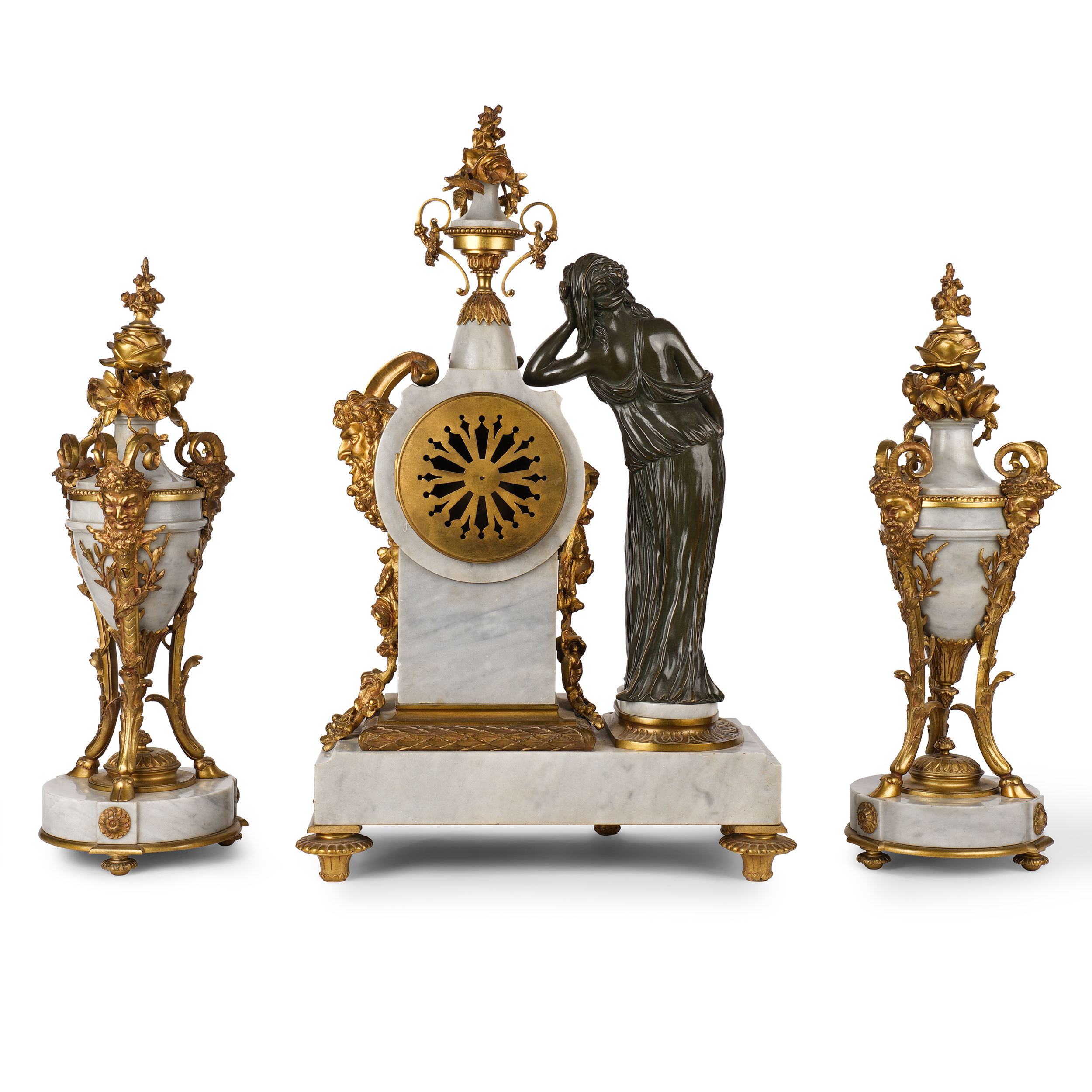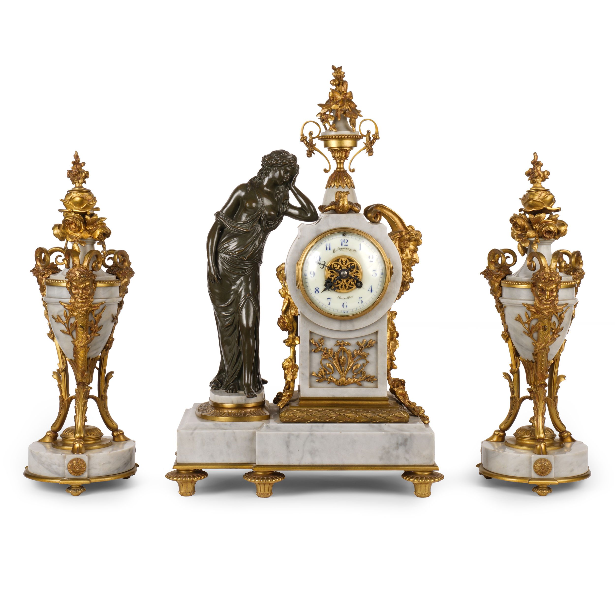 Бронза, литье, патинирование, мрамор, шлифовка; на эмалевом циферблате часов «H. Luppens & Cie // Bruxelles», Европа, начало ХХ века, высота часов – 55 см, парных ваз – 43 см.